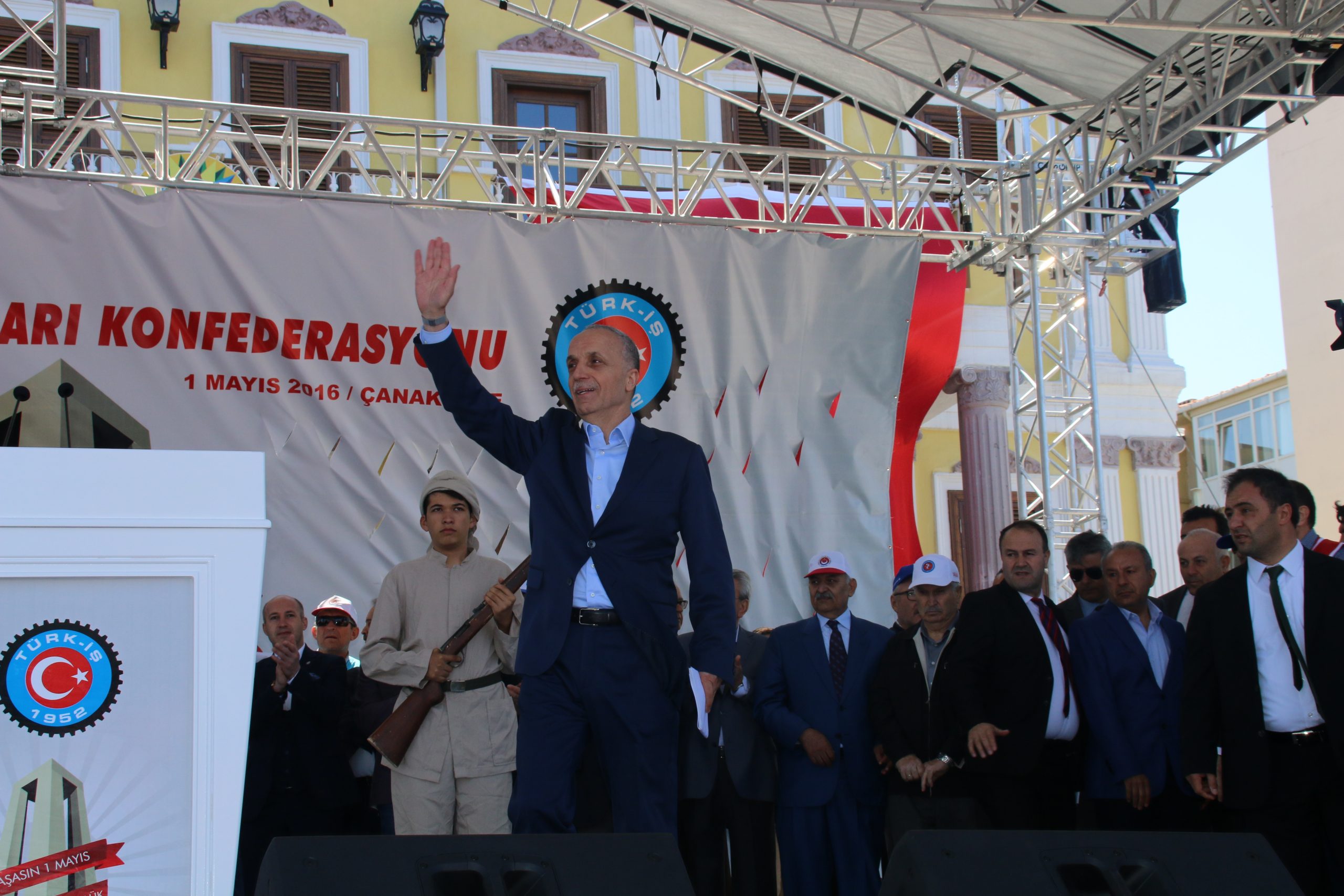 Daha sonra Türk-İş Genel Başkanı Ergün Atalay alandaki işçilere hitap etti. Türkiye’de yaşanan terör olaylarına rağmen işçilerin alanlara çıktığını söyleyen Türk-İş Genel Başkanı Ergün Atalay, “Geçen hafta Çanakkale Kara savaşının 101. yıldönümüydü. 253 bin şehidimiz karşıki topraklarda yatıyor. Her gün ortalama 6 askerin şehit olduğu bir ülkedeyiz. Şu anda Çanakkale Savaşı hâlâ devam ediyor. Katiller bugün Gaziantep’te polislerimizi ve sivil vatandaşlarımızı şehit ettiler. Ayrıca katiller bugün 3 askerimizi şehit ettiler. Dışarıdaki insanlar, hainlerle beraber ülkeyi karıştırmaya devam ediyorlar. Vatan yoksa, ülke yoksa, sendika da yok, parti de yok, dernek de yok, oda da yok. Yaşamak yok. Buradan Türkiye’ye sesleniyorum, hainlere sesleniyorum, onun ağa babalarına sesleniyorum; aklınızı başınıza alın. Ülkemizi karıştırmayın, ülkemizi bölmeye gayret etmeyin. Bundan 100 sene evvel dedelerimiz buna fırsat vermedi. Biz de vermeyiz, Türk-İş buna izin vermez.” dedi.