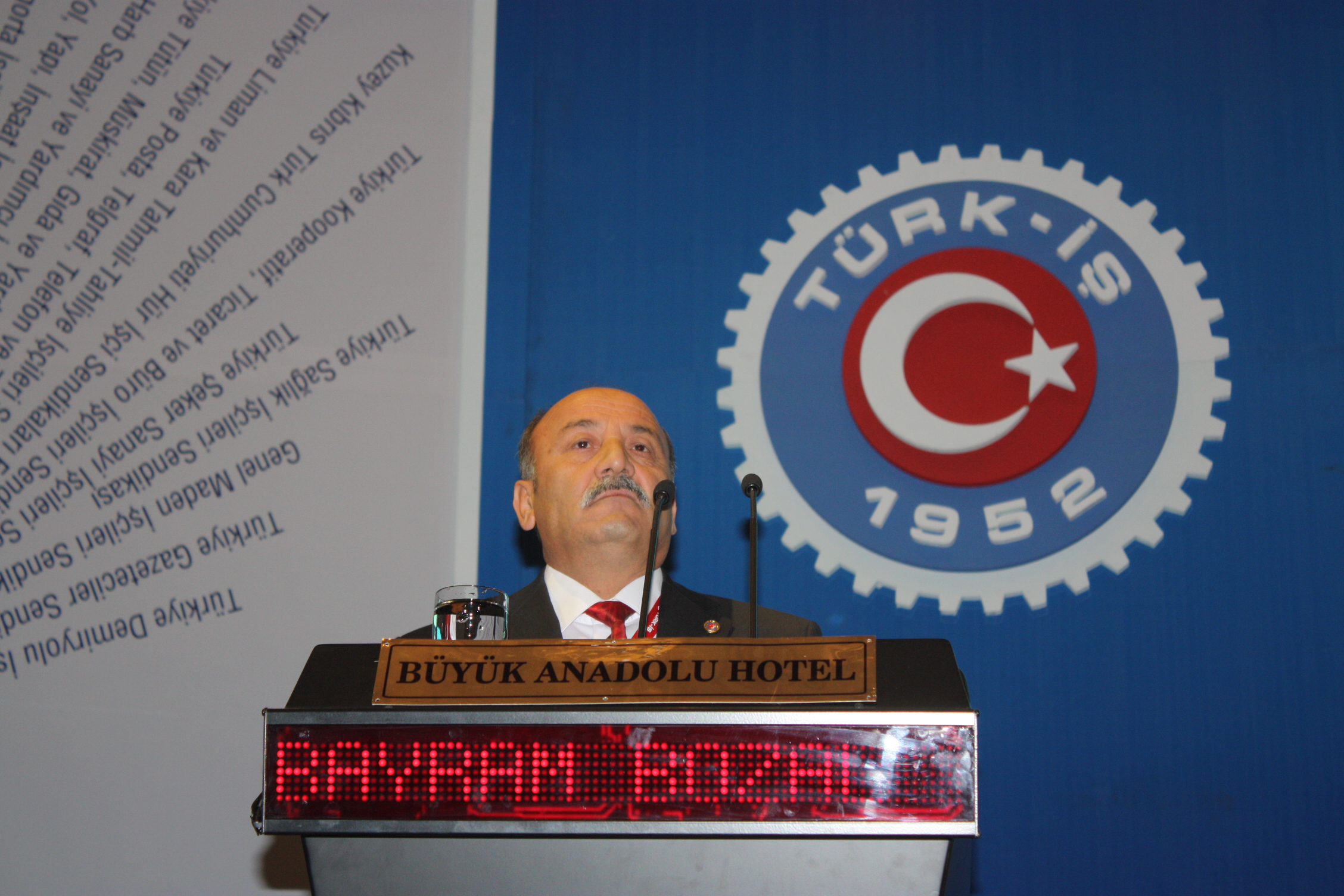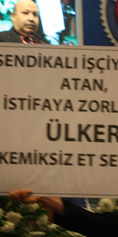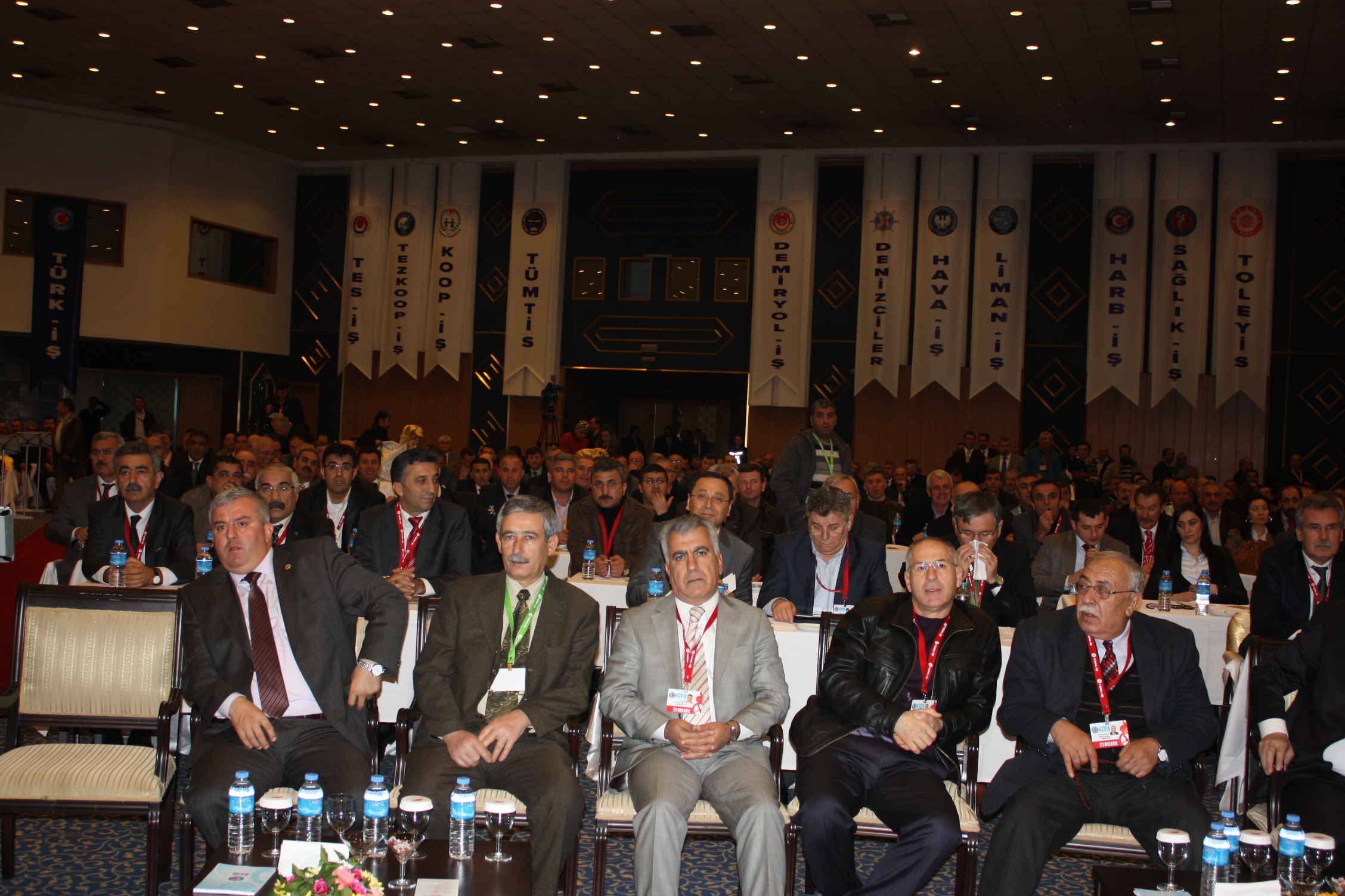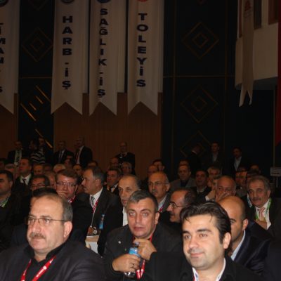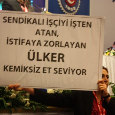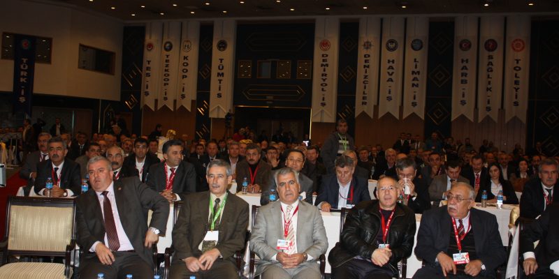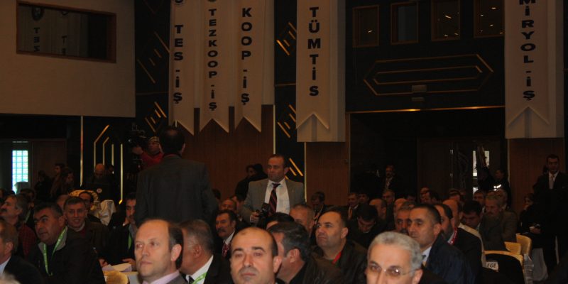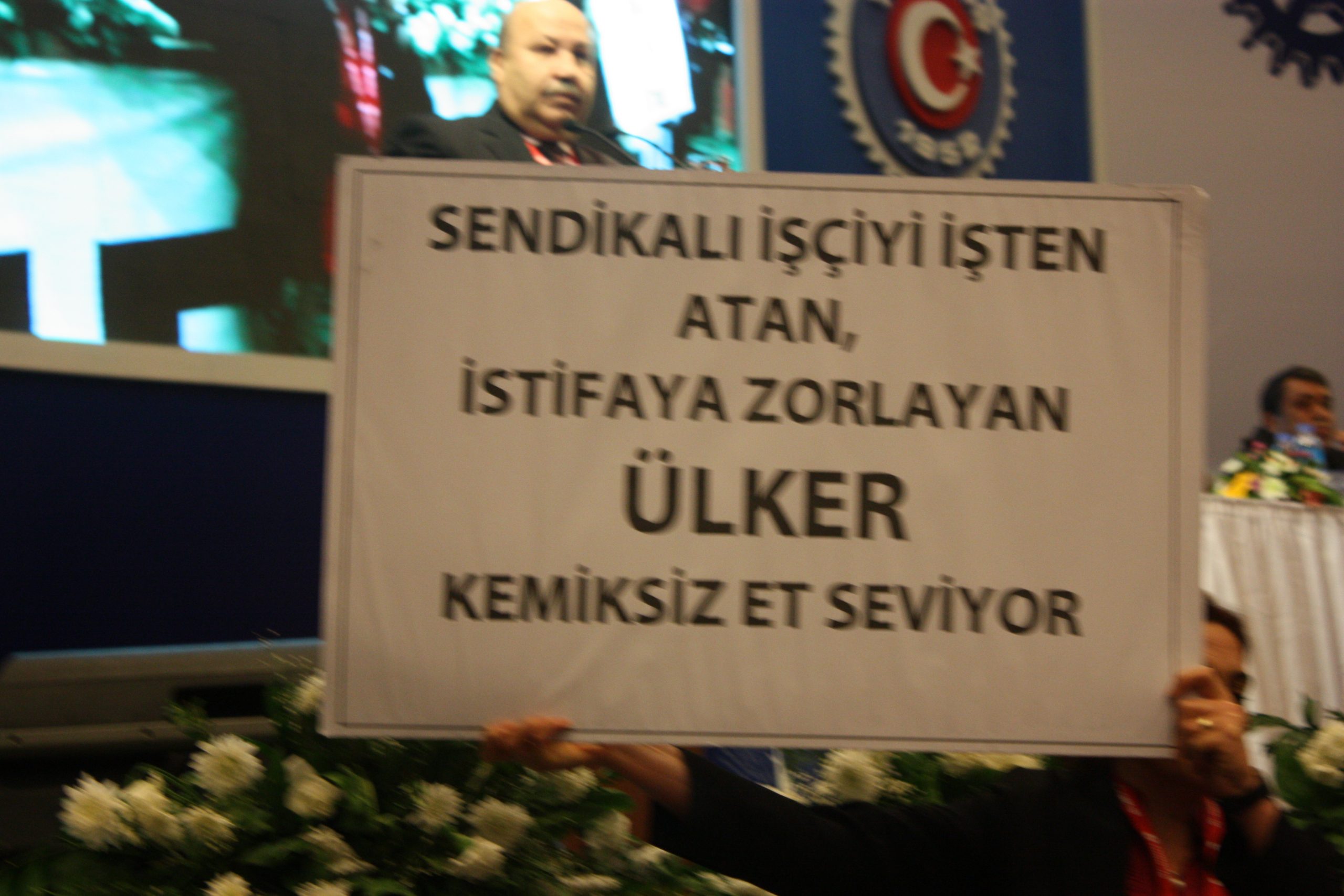 Ankara’da Büyük Anadolu Oteli’nde dün başlayan ve dört gün sürecek olan 21. Olağan Türk-İş Genel Kurulu’nun ikinci gününde kürsüde söz alacak olan konuşmacıların listesi belirlendi. Kura sonucu belirlenen listede; Türk Harb İş Sendikası, Basın İş Sendikası, Türkiye Denizciler Sendikası, Demiryol İş Sendikası, Tez Koop İş Sendikası genel başkanları konuşmalarını tamamladılar. Tez Koop İş Sendikası Genel Başkanı Osman Gürsu konuşmasını yaptığı sırada salonda bulunan Şok market işçileri “Ülker şaşırma sabrımızı taşırma” sloganları attı.