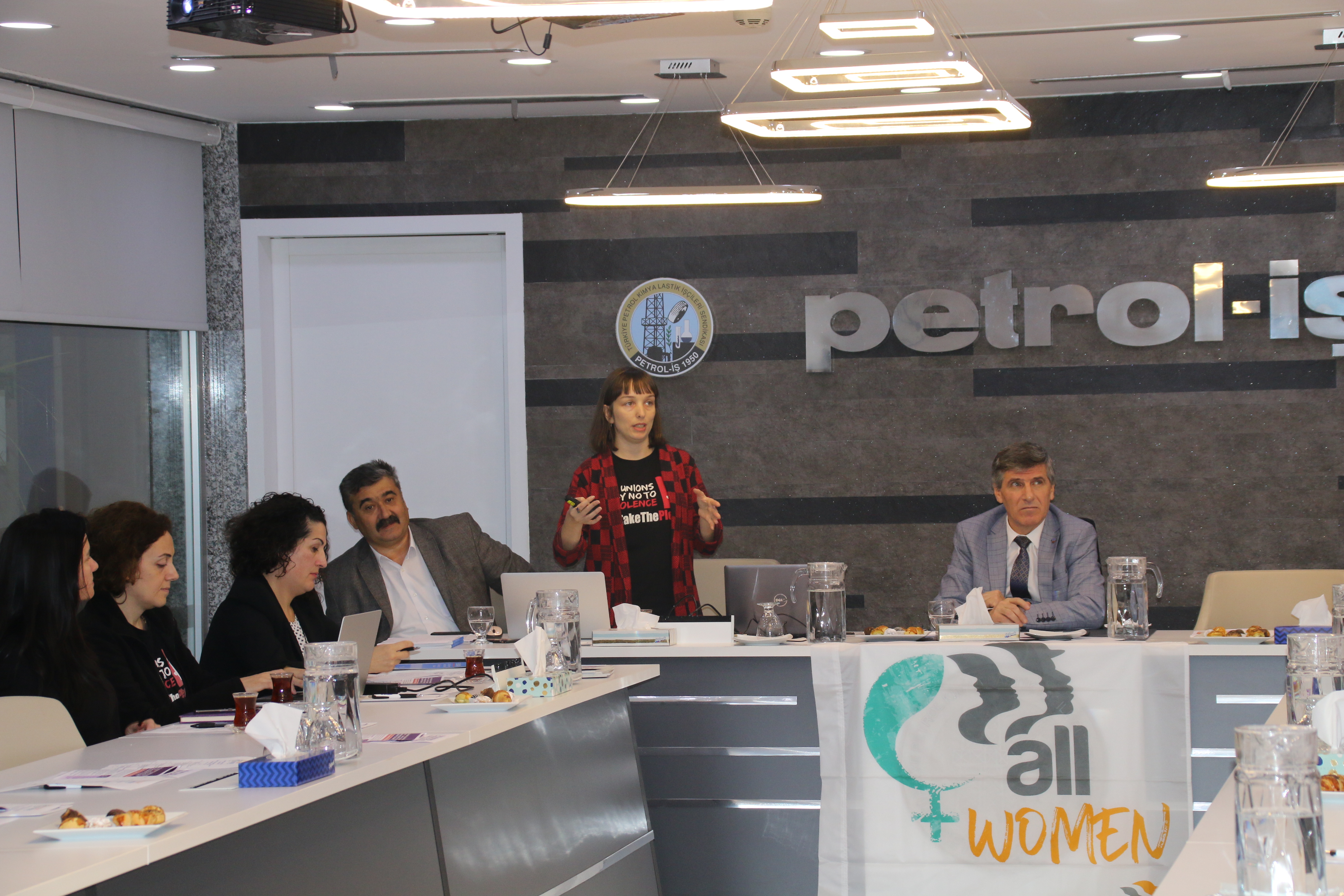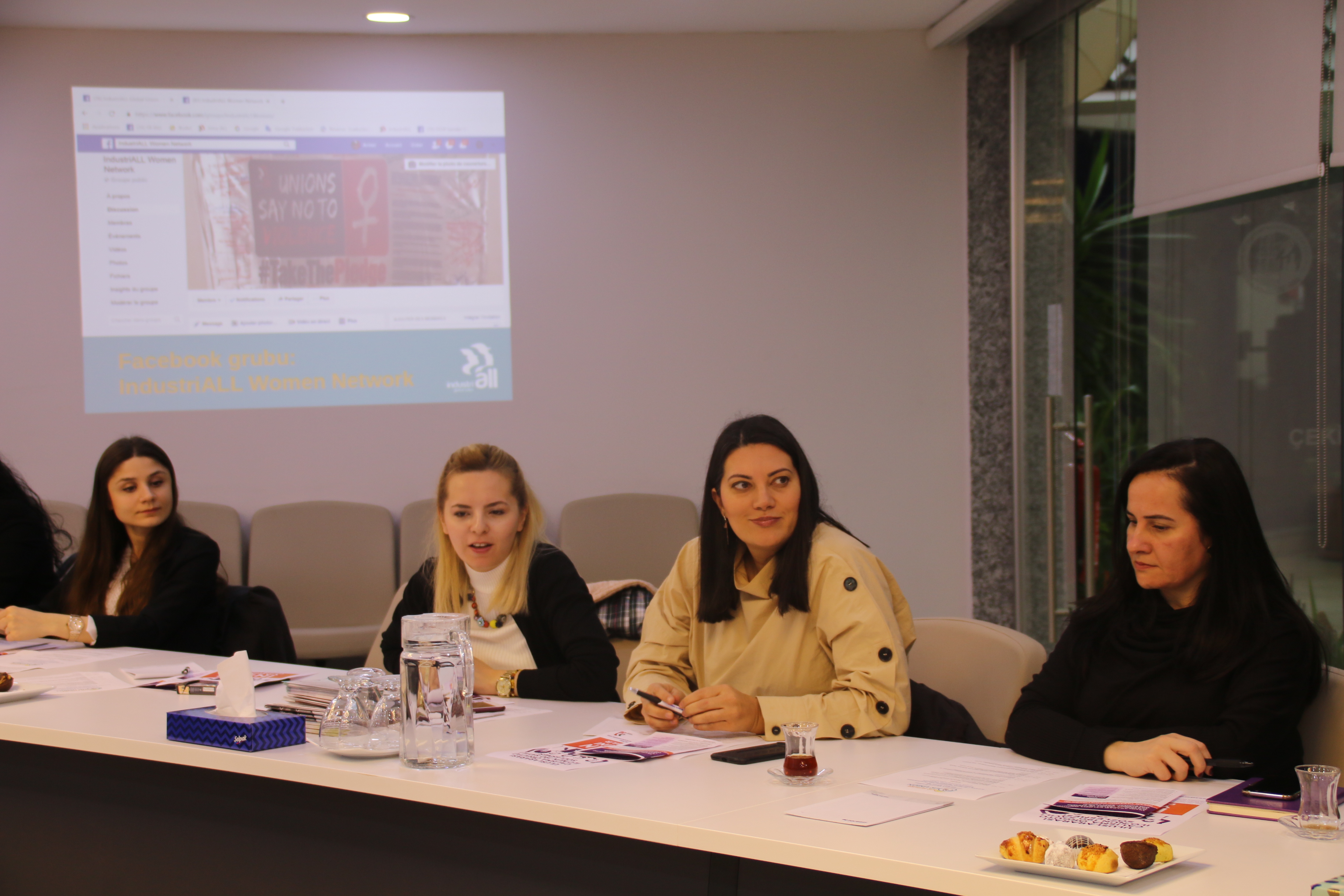 IndustriALL küresel sendikanın Türkiye’deki 11 üye sendikasından, aralarında yönetici, temsilci, işçi ve uzmanların bulunduğu yaklaşık yirmi kadın katıldı.