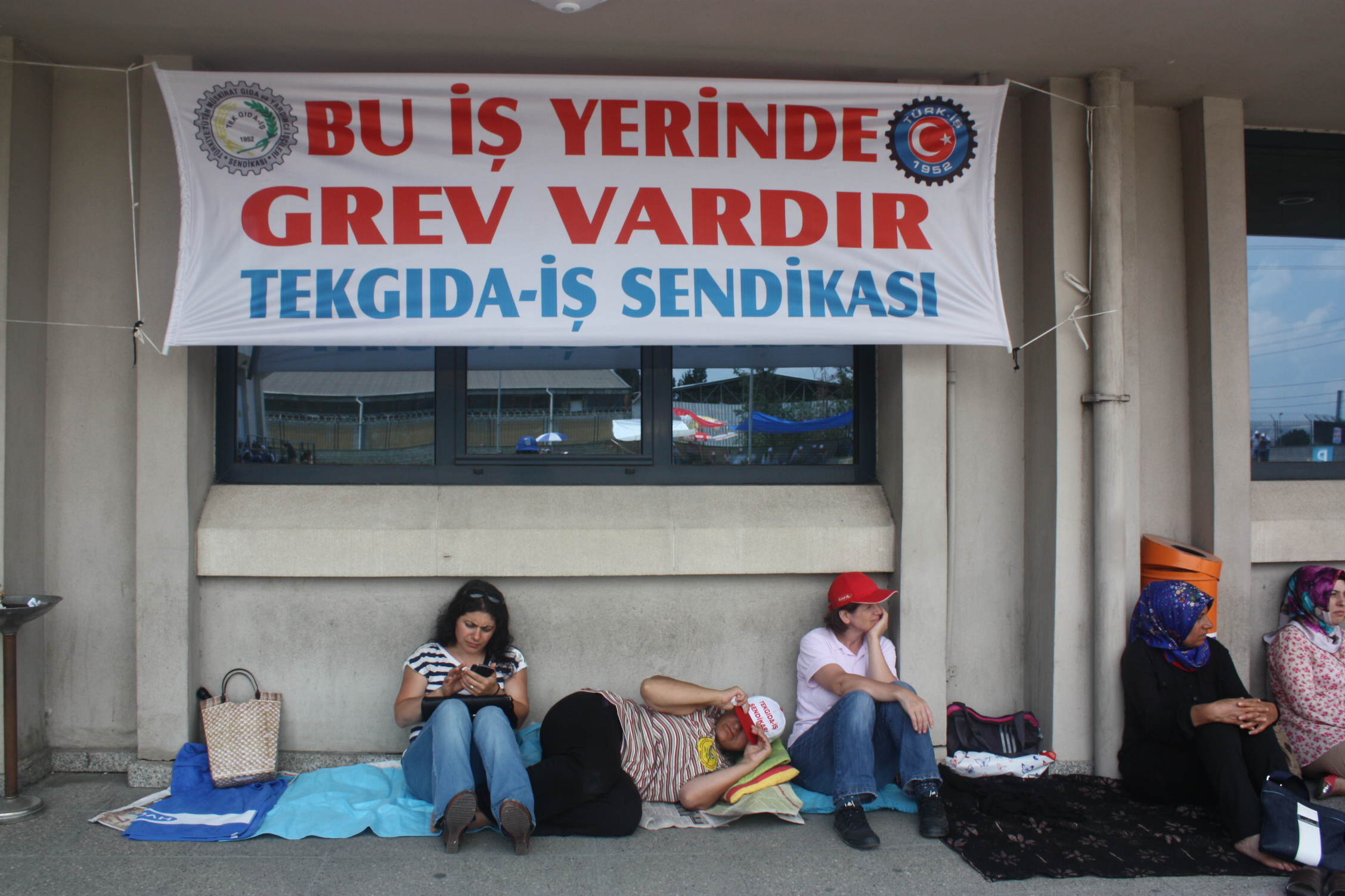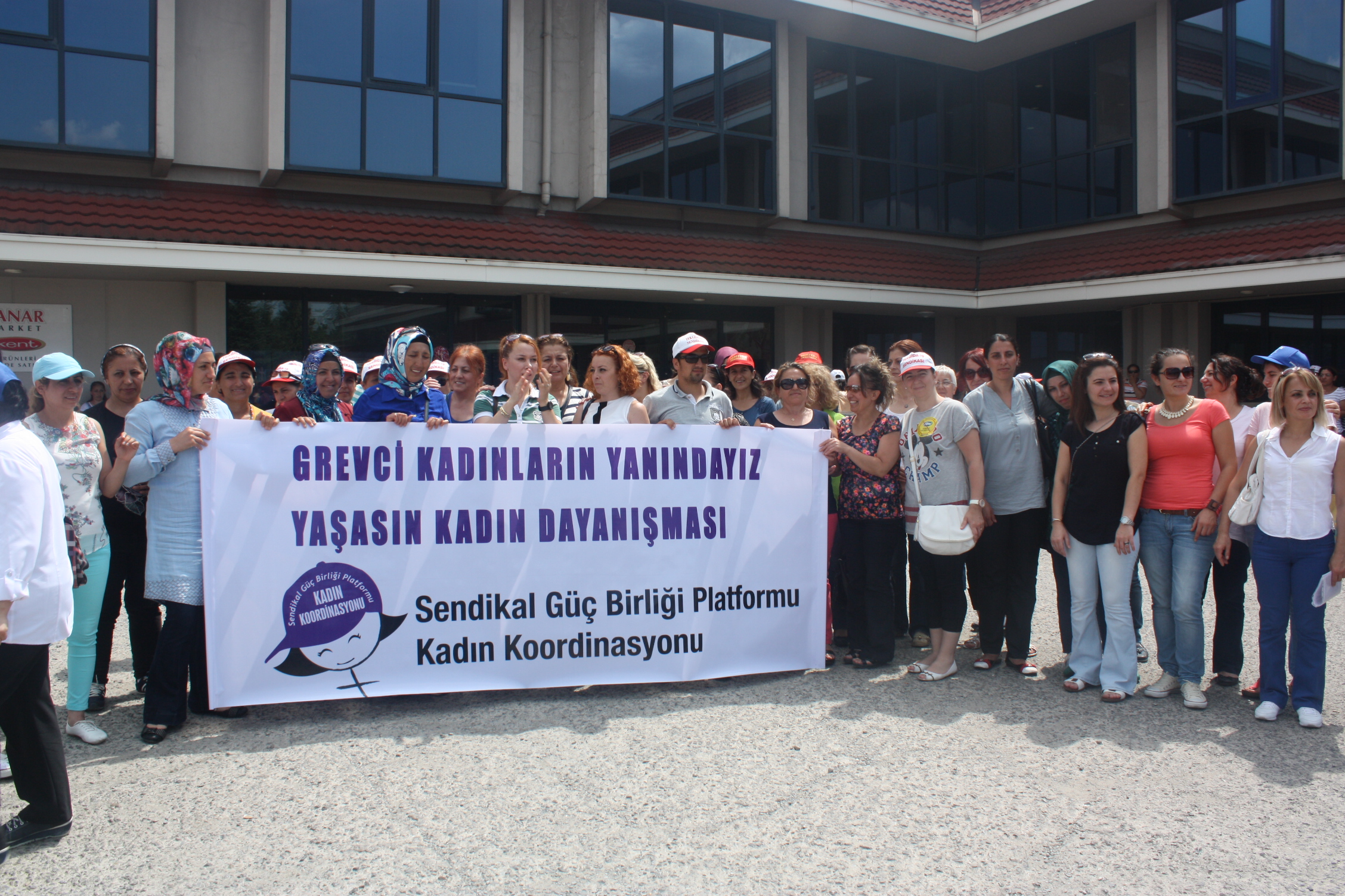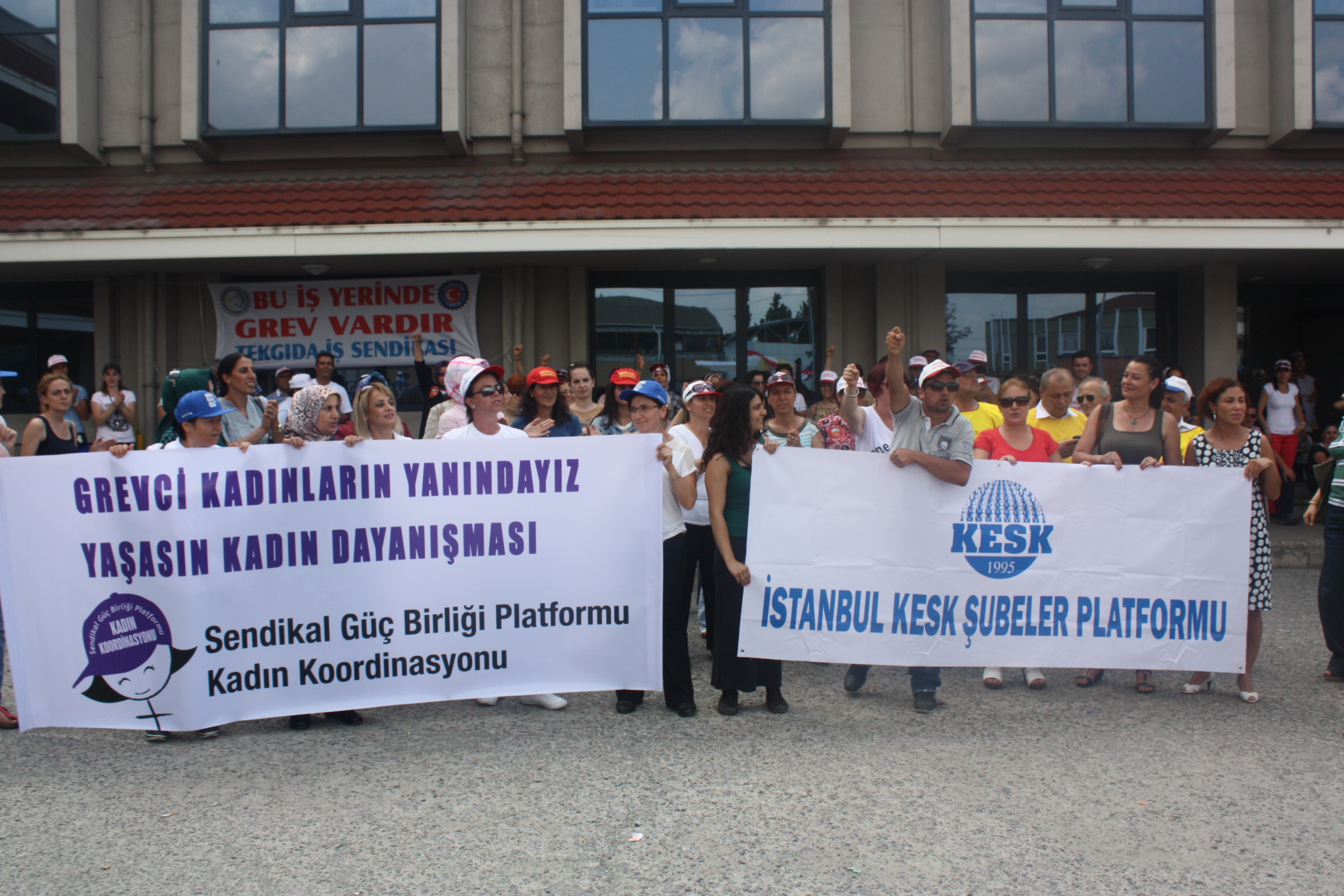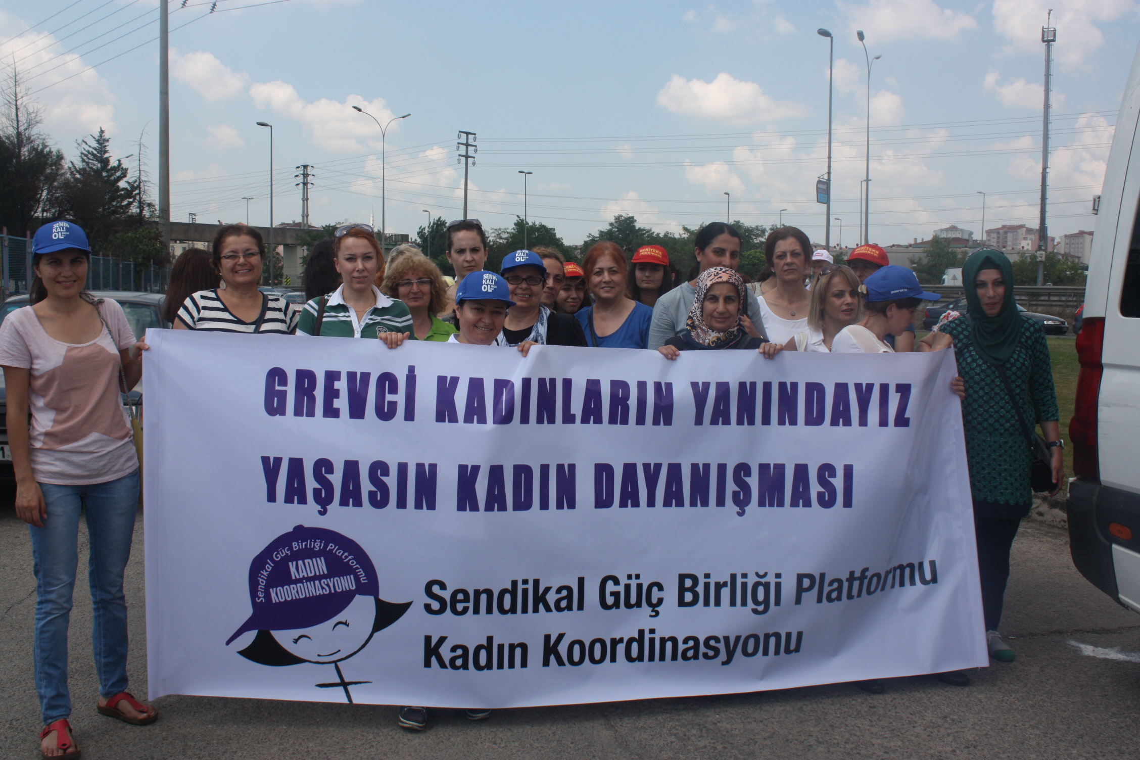 SGBP Kadın Koordinasyonu grevlerinin yedinci gününde Kent Gıda işçilerini ziyaret etti. Tek Gıda-İş Sendikası’nın örgütlü olduğu Kent Gıda’da 800 işçi greve çıkmıştı. “Grevci kadınların yanındayız yaşasın kadın dayanışması” yazılı pankartla alana giren kadınlar, “Yaşasın kadın dayanışması”, “Grevci kadınlar yalnız değildir”, “Birleşe birleşe kazanacağız” sloganlarını attılar.