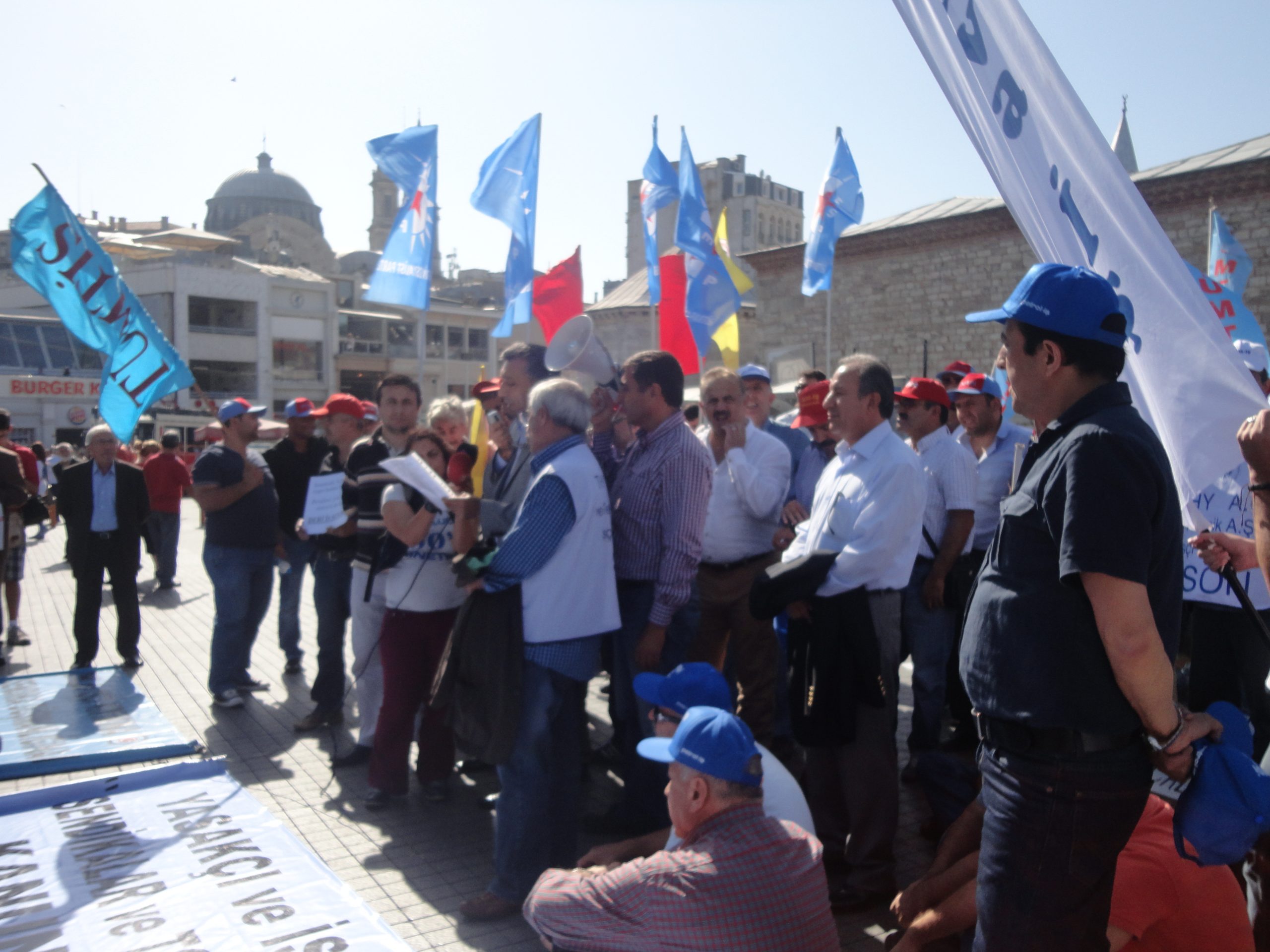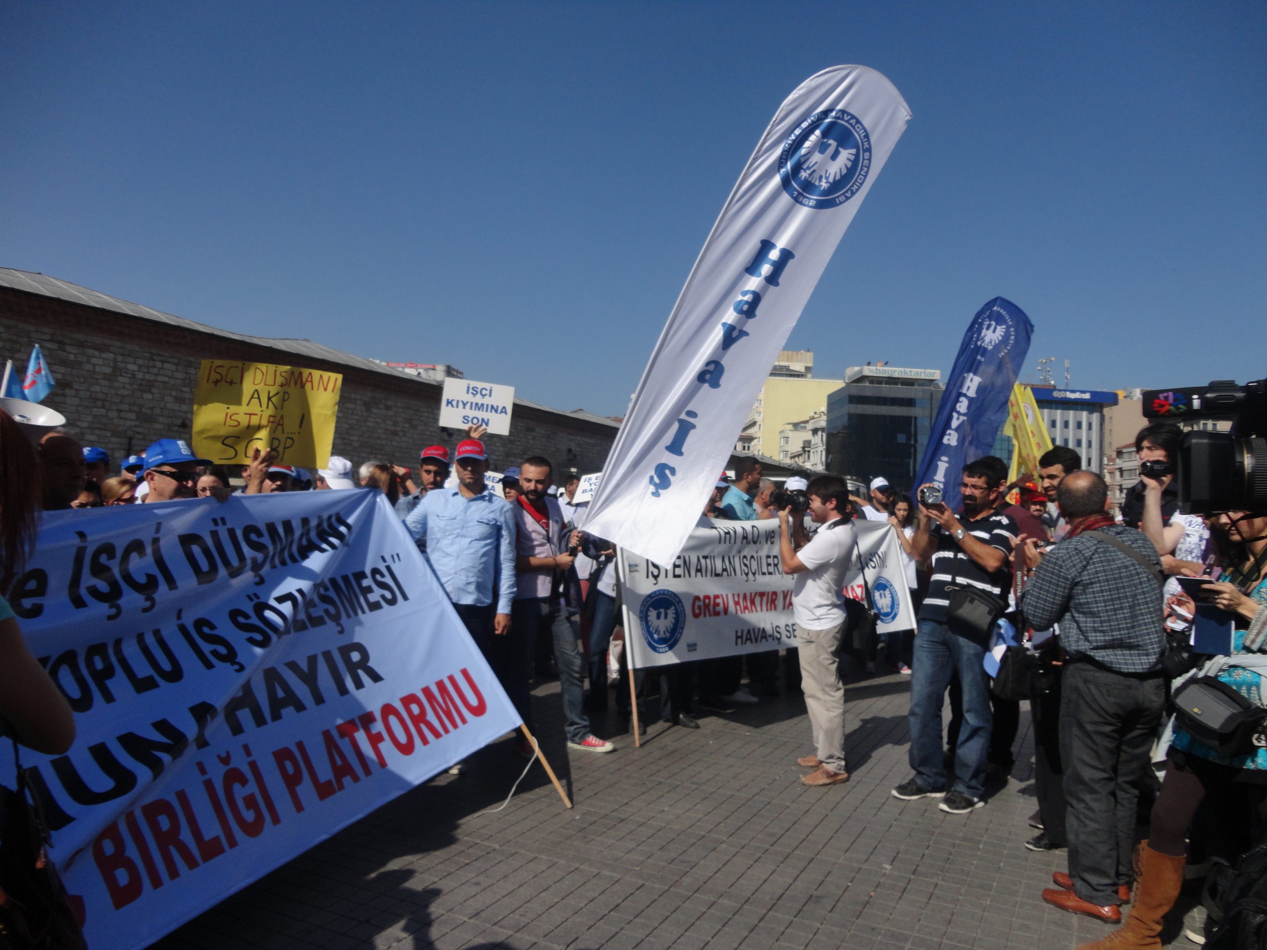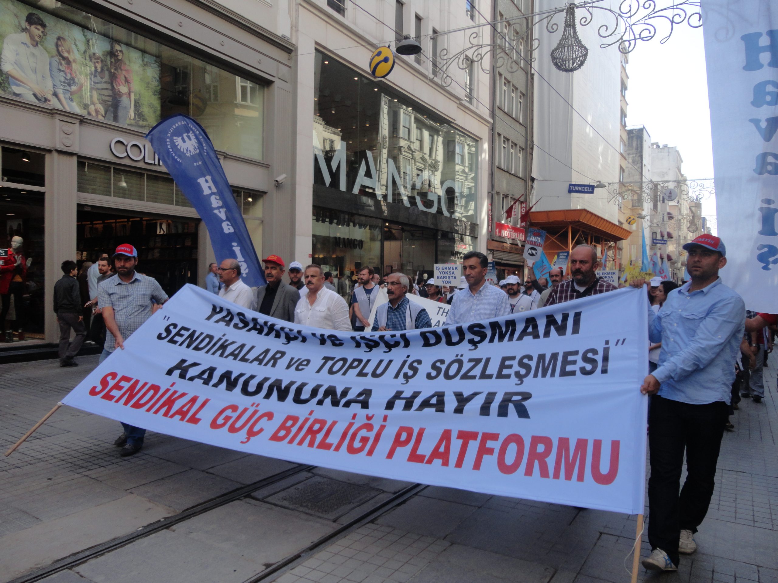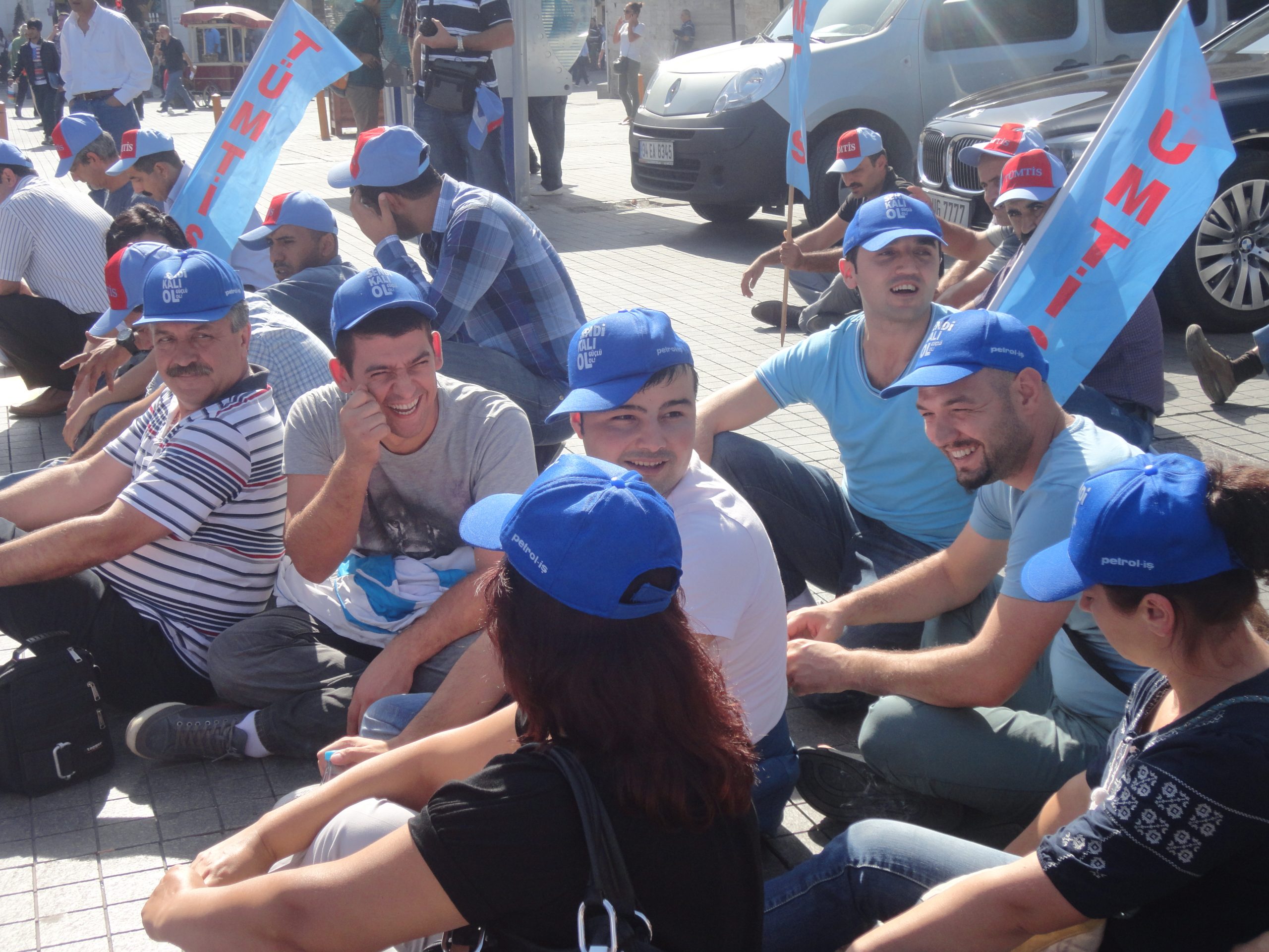 Sendikal Güç Birliği Platformu (SGBP), patron kuruluşlarının talepleri doğrultusunda hazırlanan, ancak Türk-İş ve Hak-İş yönetimlerinin de imzaladıkları protokolle destekledikleri “Sendikalar ve Toplu İş Sözleşmesi Yasa Tasarısı”nı 16 Ekim Salı günü Türkiye genelinde yapılan çeşitli eylemlerle bir kez daha protesto etti. Sabahleyin SGBP’nin bileşeni sendikaların örgütlü olduğu işyerlerinde 1 saat iş bırakıldı, tasarıyla ilgili bildiriler okundu. Aynı gün saat 13.00’den  itibaren başta İstanbul – Taksim olmak üzere, Ankara, İzmir, Bursa, Adana, G.Antep gibi merkezlerde de oturma eylemleri yapıldı. Taksim’de yapılan eyleme Genel Mali Sekreterimiz İbrahim Doğangül, Genel Yönetim Sekreterimiz Ahmet Kabaca, şube başkan, yönetici ve işyeri temsilcilerimizle Petrol-İş üyesi işçiler de katıldı.
