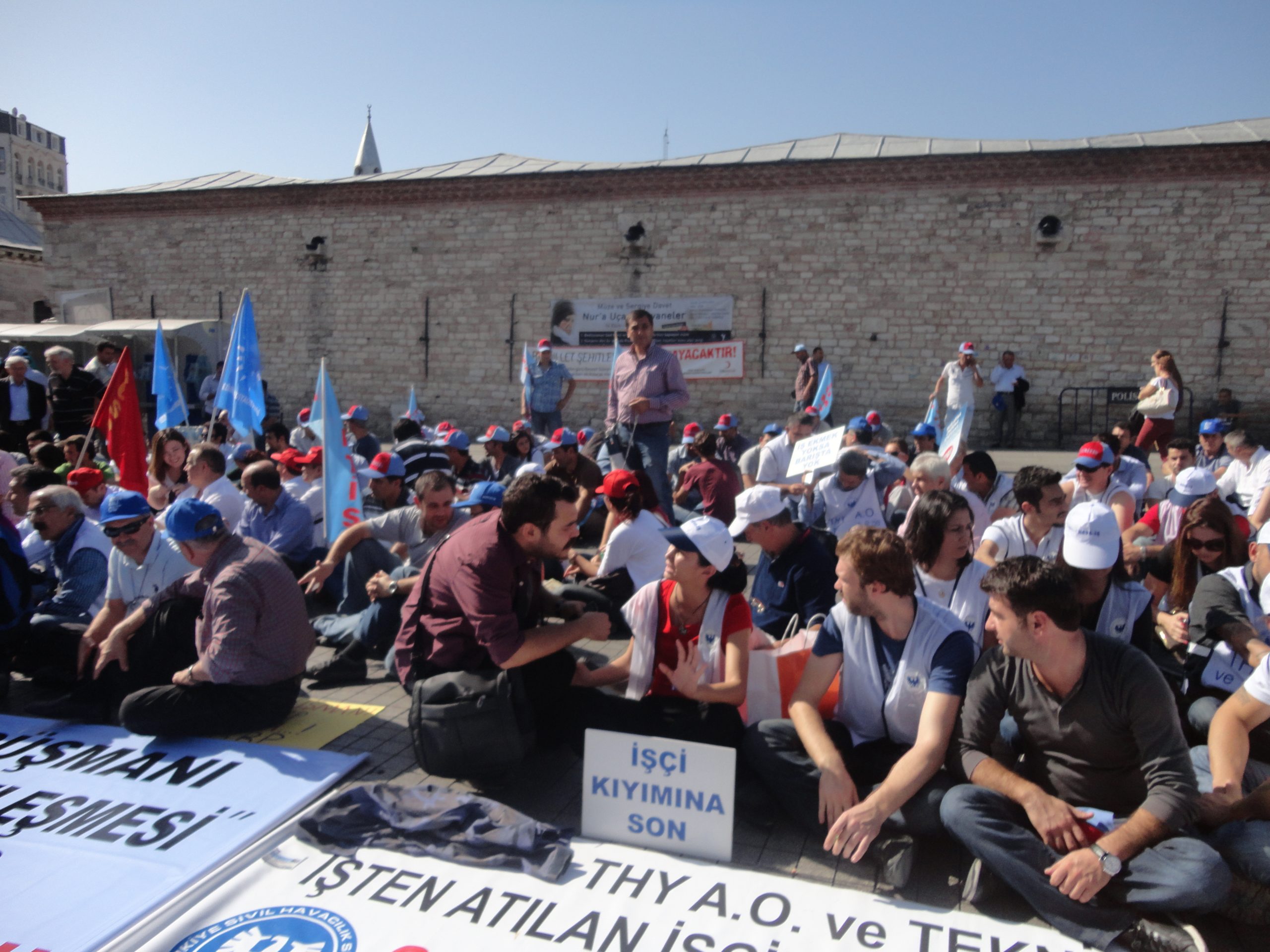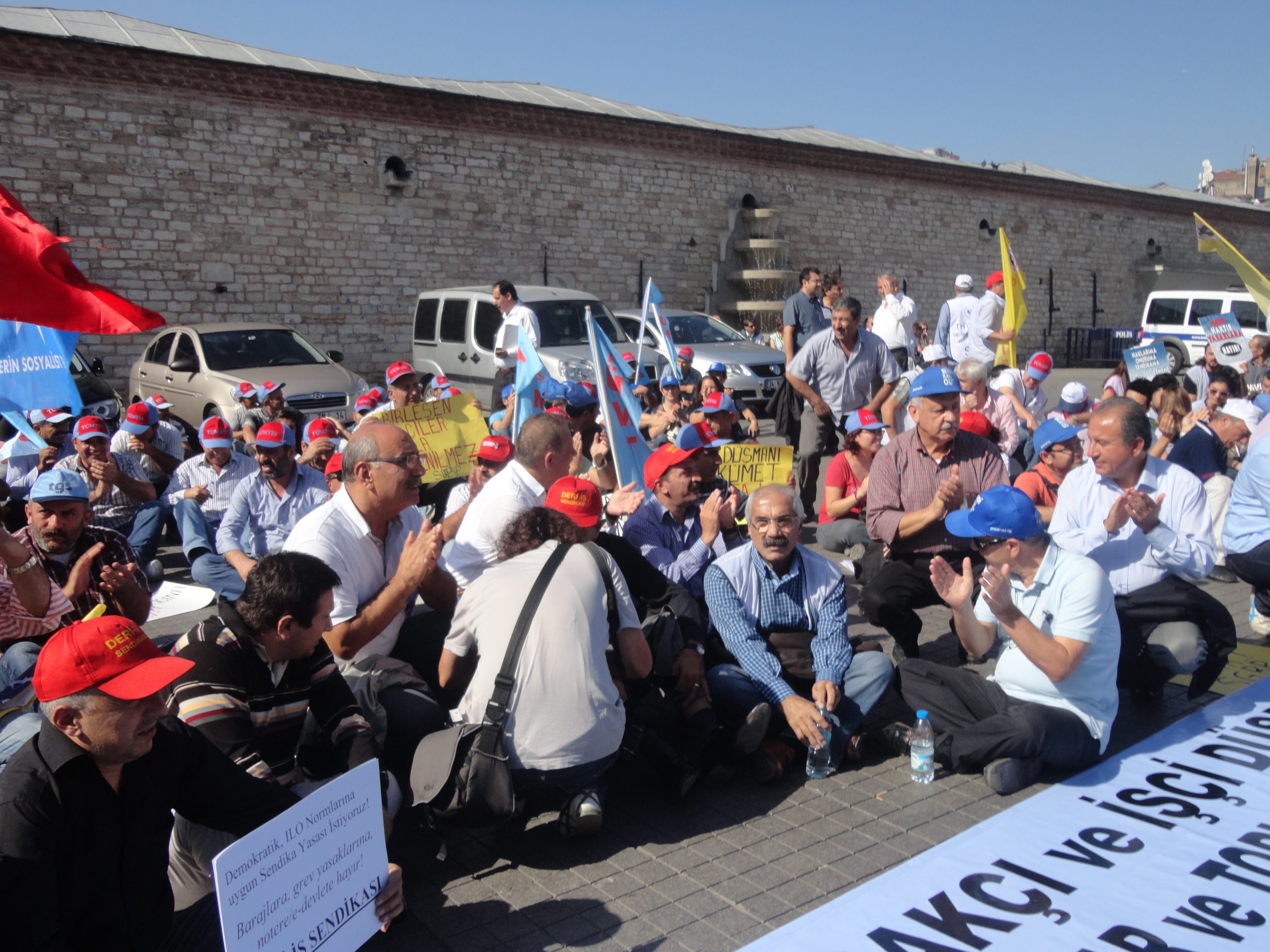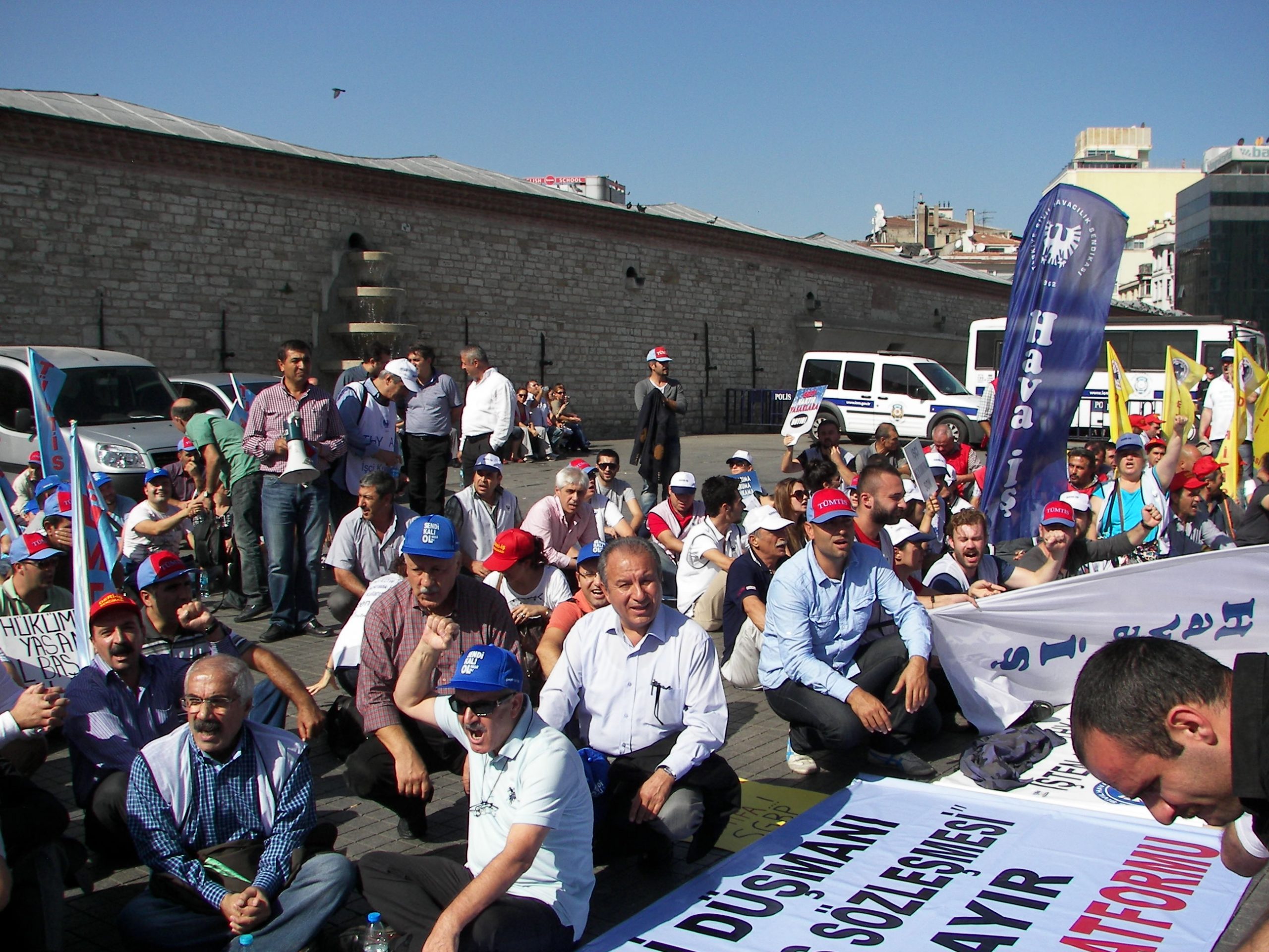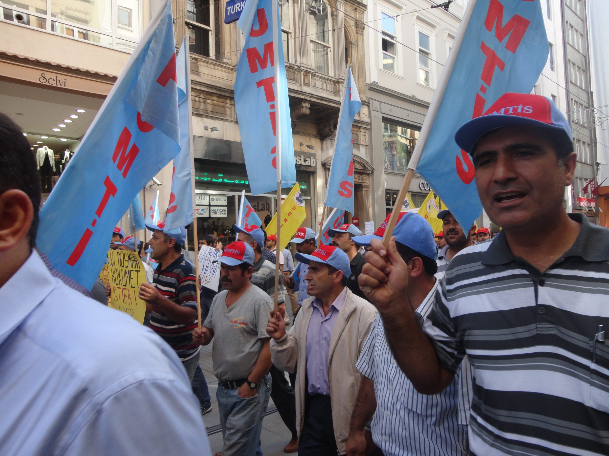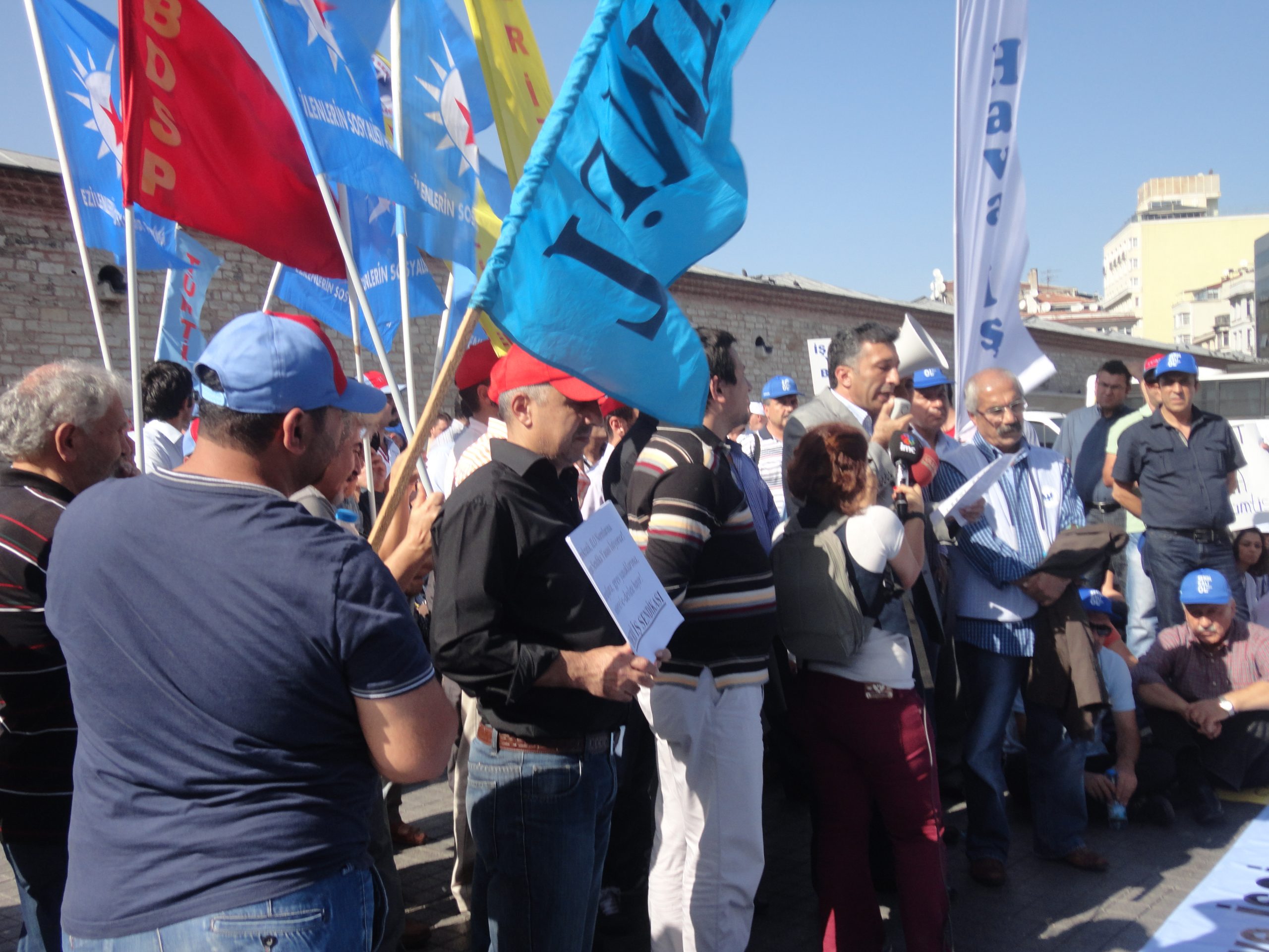 Sendikal Güç Birliği Platformu (SGBP), patron kuruluşlarının talepleri doğrultusunda hazırlanan, ancak Türk-İş ve Hak-İş yönetimlerinin de imzaladıkları protokolle destekledikleri “Sendikalar ve Toplu İş Sözleşmesi Yasa Tasarısı”nı 16 Ekim Salı günü Türkiye genelinde yapılan çeşitli eylemlerle bir kez daha protesto etti. Sabahleyin SGBP’nin bileşeni sendikaların örgütlü olduğu işyerlerinde 1 saat iş bırakıldı, tasarıyla ilgili bildiriler okundu. Aynı gün saat 13.00’den  itibaren başta İstanbul – Taksim olmak üzere, Ankara, İzmir, Bursa, Adana, G.Antep gibi merkezlerde de oturma eylemleri yapıldı. Taksim’de yapılan eyleme Genel Mali Sekreterimiz İbrahim Doğangül, Genel Yönetim Sekreterimiz Ahmet Kabaca, şube başkan, yönetici ve işyeri temsilcilerimizle Petrol-İş üyesi işçiler de katıldı.
