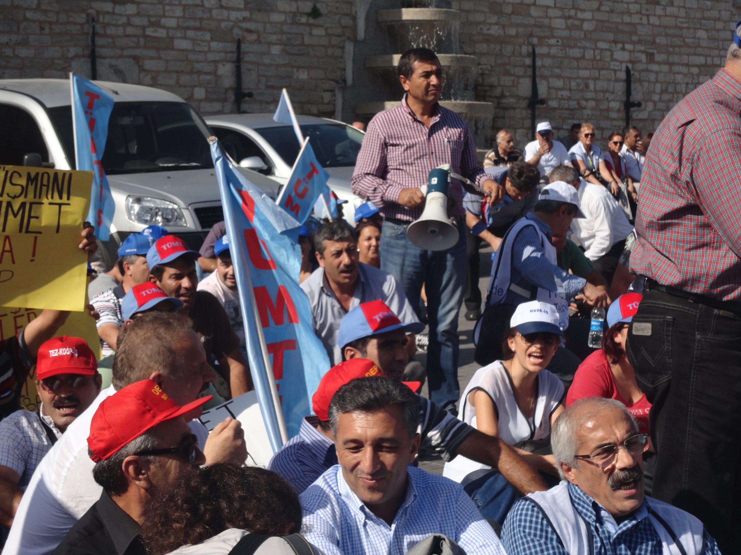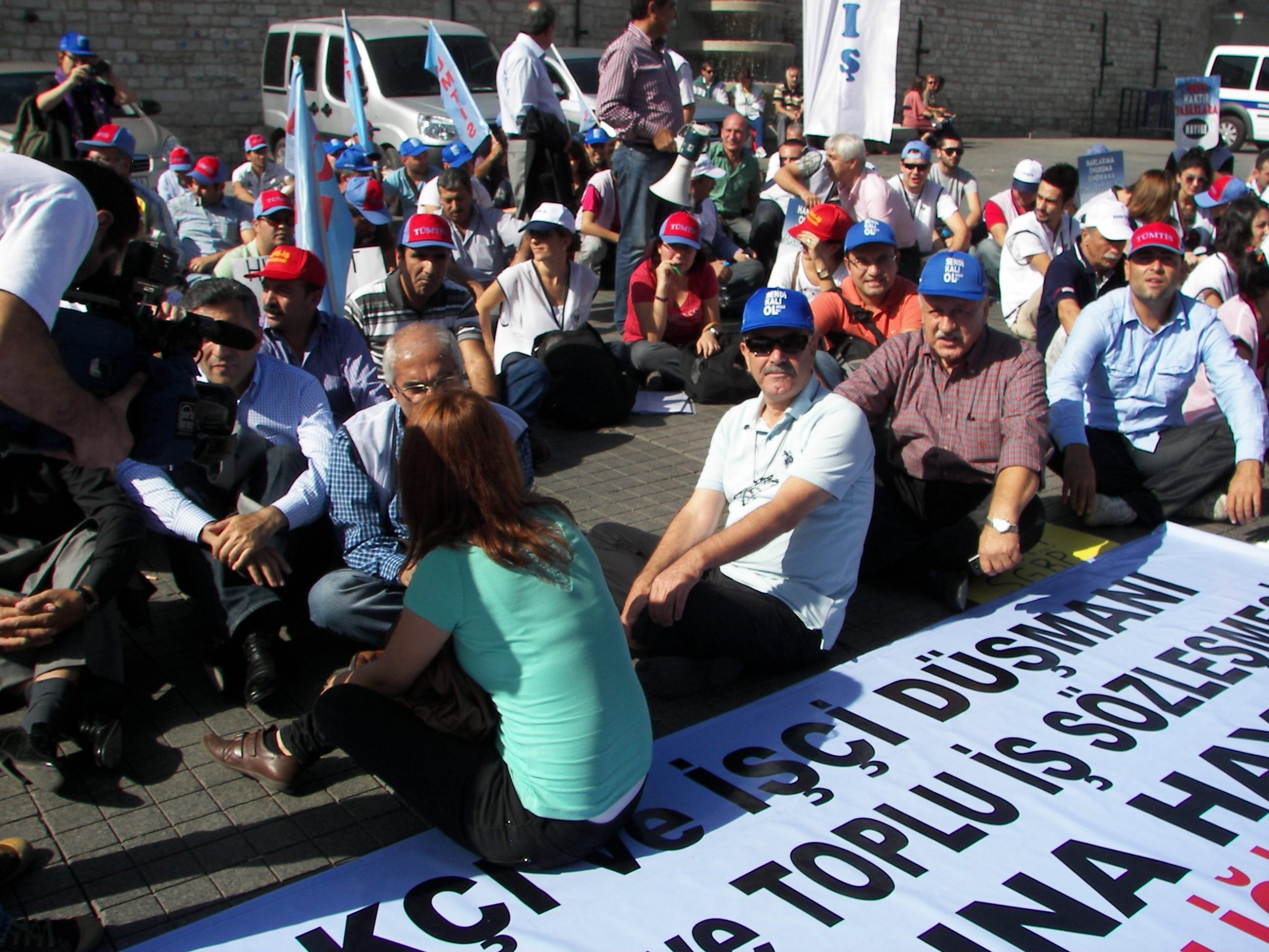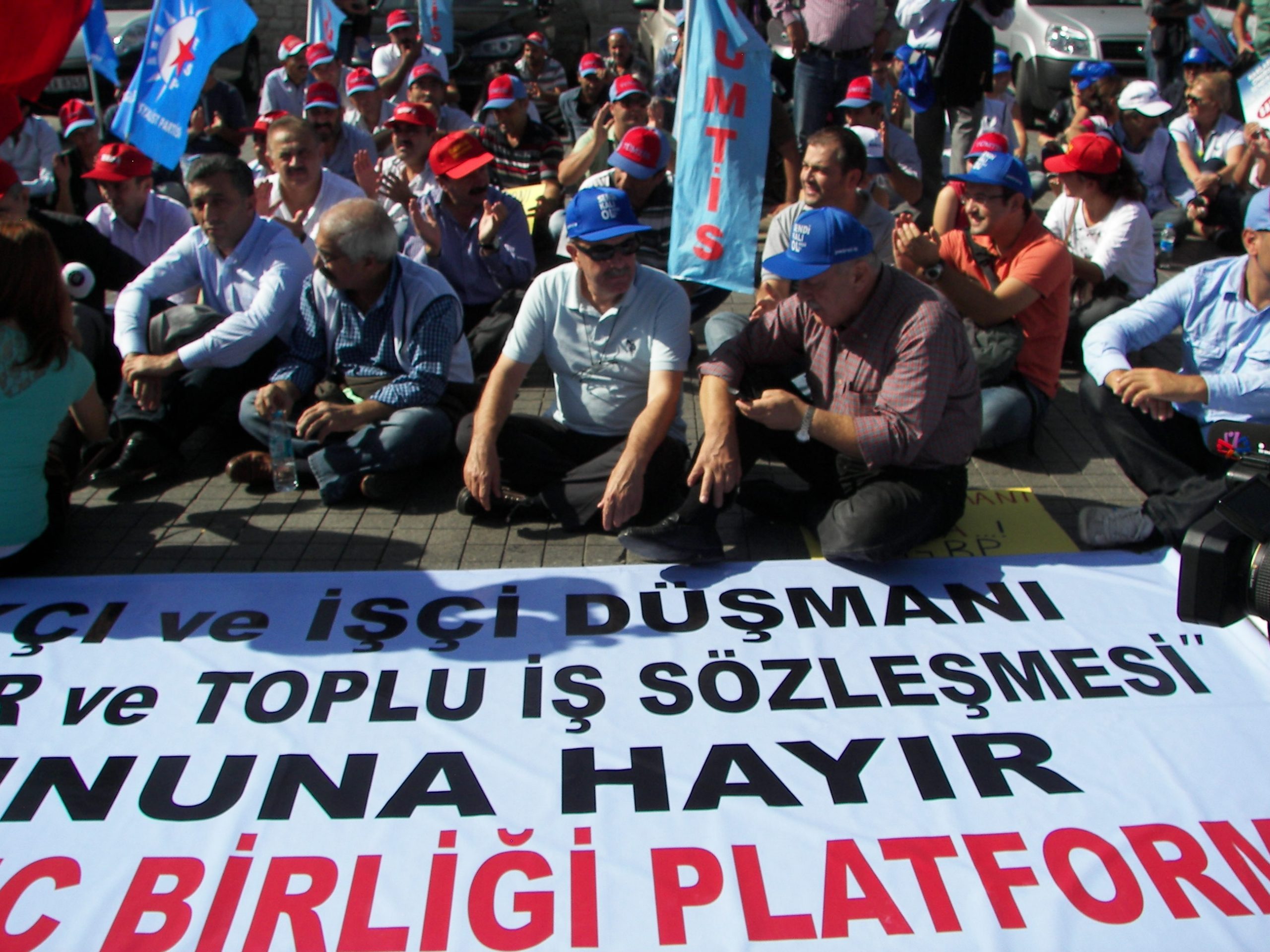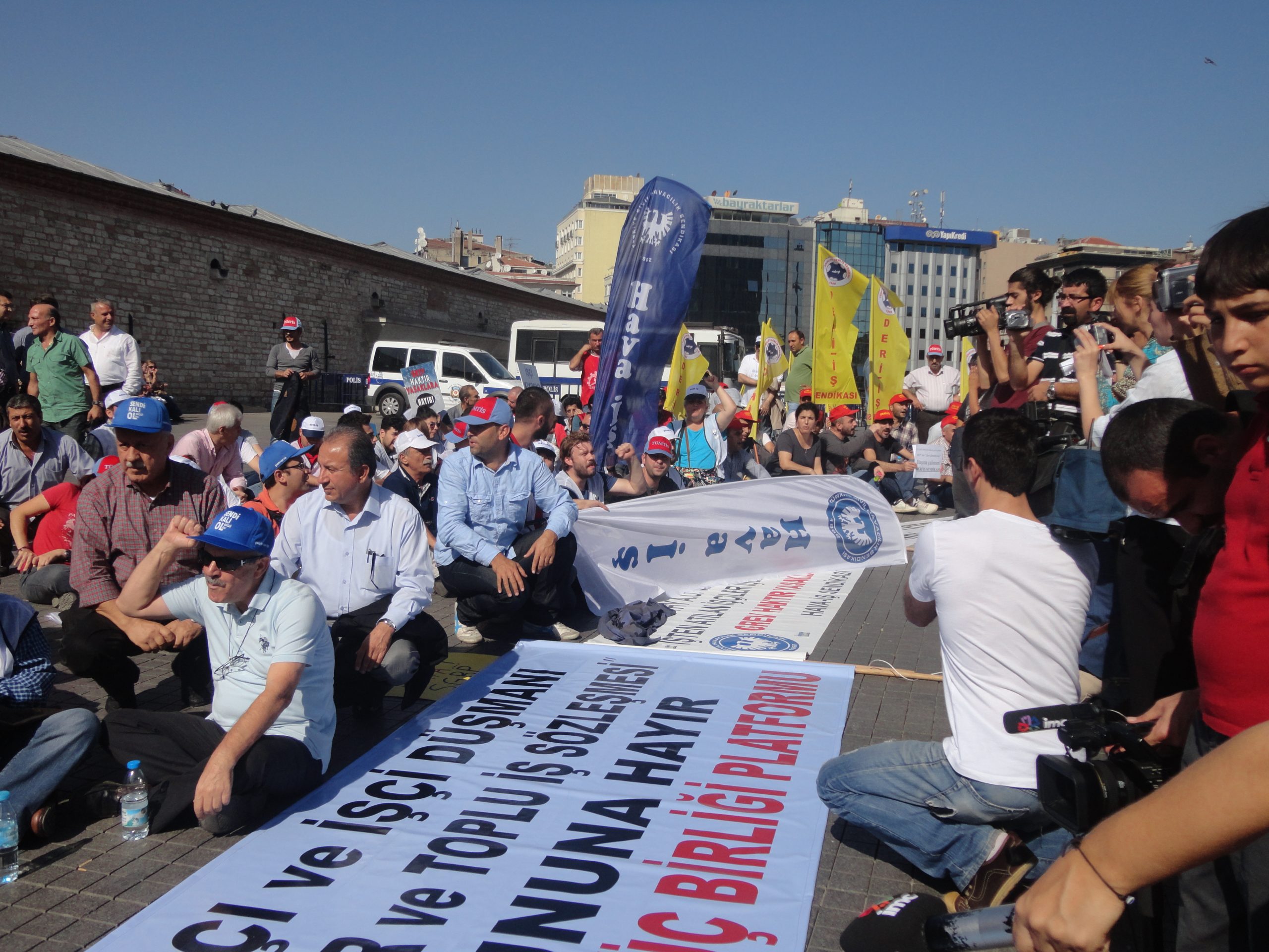 Sendikal Güç Birliği Platformu (SGBP) Dönem Sözcüsü ve TÜMTİS Genel Başkanı Kenan Öztürk, Taksim’de yapılan oturma eyleminde yaptığı basın açıklamasında, işçi düşmanı yasa tasarısını kabul etmediklerini belirterek, Türkiye Büyük Millet Meclisi, çalışma yaşamını ve sendikal hayatı ciddi biçimde değiştirecek bir yasa tasarıyı  görüşüyor. Aylardır toplu sözleşme hakkımızı bu yasayı bahane ederek gasp eden, yetki işlemlerini dondurup işçileri sözleşmesiz bırakan iktidar, şimdi büyük bir hızla, işveren örgütlerinin dikte ettiği maddeleri meclisten geçirmek için yoğun mesai yapıyor. Bu yasa ile bütün sendikal güvenceler elimizden alınıyor, barajlarla sendikalar bitiriliyor, grev yasakları devam ettiriliyor” dedi.