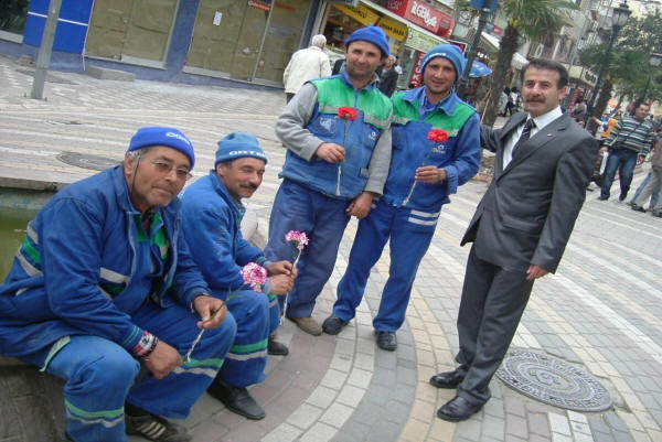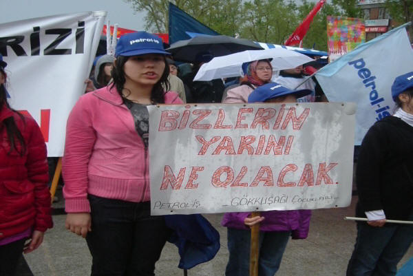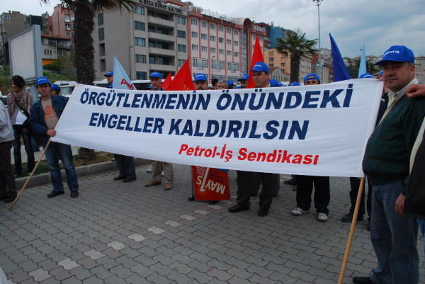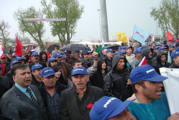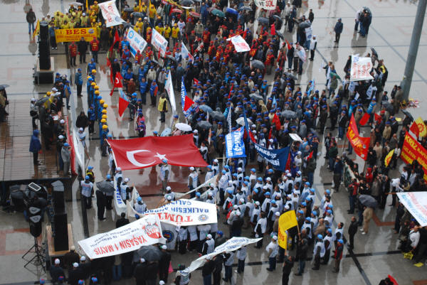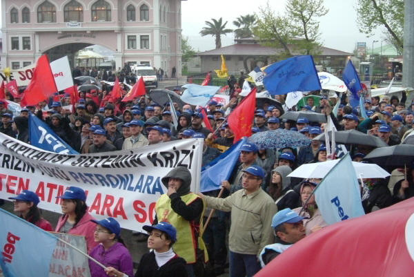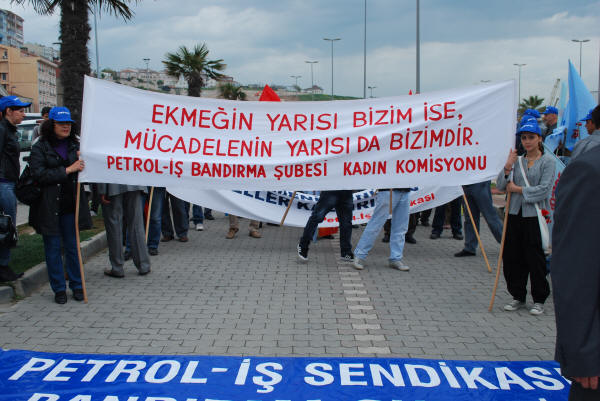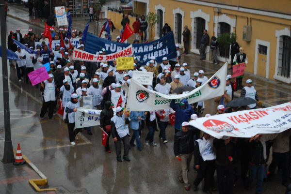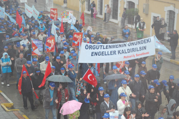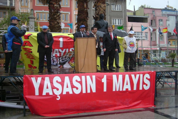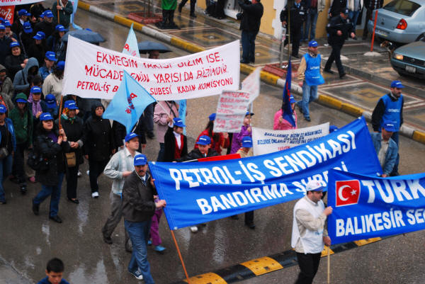 1 Mayıs İşçi Bayramı kutlamaları Bandırma İDO’ nun önünde işçilerin toplanması ile başladı. Balıkesir’den gelen katılımcıların yoğunluğu dikkat çekerken Bandırma İlçe Emniyet Müdürlüğünün almış olduğu güvenlik tedbirleri de gözlerden kaçmadı. Saat 16.00’da İDO önünde toplanan işçiler yaklaşık yarım saat sonra sloganlar eşliğinde Cumhuriyet Meydanına doğru yürüyüşe geçti. Yürüyüşle beraber başlayan yağmur gösterilerin sonuna kadar devam etti. Cumhuriyet Meydanında toplanan işçilerin saygı duruşu ve İstiklal Marşını hep bir ağızdan okuması ile başlayan 1 Mayıs İşçi Bayramı kutlamalarında kısa süreli yaşanan pankart krizi, polisin olaya müdahale etmesi ile son buldu. 1 Mayıs mitinginin açılış konuşmasını yapan Türk –İş Balıkesir İl Temsilcisi Ertan Çelikel, 1 Mayısın tüm dünya emekçilerinin haklarını korumak ve geliştirmek için kutladığı bir gün olduğunu, bugün bütün dünya işçilerinin, emekçilerinin insanlığı savaşa sürükleyenlere, barış istemeyenlere, dünyamızı bir kan gölüne çevirenlere sevgiyi, barışı ve kardeşliği haykırdığını söyledi. Çelikel, “Bizler 1 Mayıs’ta kaderciliğin ötesine geçip umudu tercih ettiğimizi, kriz fırsatçılığı yapıp, emekçileri yüreğinden vuranlara karşı, birleşmeyi seçtiğimizi, herkesin eşit olmaya, herkesin mutluluğun peşinden koşmaya hakkı olduğunu yüreğimizden hissettiğimizi haykırmak için bir araya geldik. Küresel sermayenin kıskacındaki ülkemiz, her gün daha fazla işsizliğe, yoksulluğa ve güvencesizliğe sürükleniyor” dedi. Daha sonra söz alan Bandırma Eğitim-Sen Şube Başkanı Hacı Akyaz Cumhuriyet Meydanına anti-demokratik uygulamaların cenderesinde yaşamak istemedikleri için, emekten yana eşitlikçi, özgürlükçü, bağımsız ve demokratik bir ülkede barış içinde kardeşçe yaşamak istediklerini haykırmak için geldiklerini söyledi. Akyaz “ Bugün bu meydanı dolduran bizler yıllardır demokrasi ve bir arada yaşamı talep eden emekçi halkız. İşten çıkartılma ile tehdit edilen, emeği sömürülen işçileriz. Faiz borcu ile yüzüstü bırakılan çiftçileriz, köylüleriz. Bugün bu meydanı dolduran bizleri görmezden gelenleri uyarıyoruz. Yarın her yerde iş yerlerinde, okullarda, fabrikalarda, hastanelerde, yoksul mahallelerde öfkemiz ile karşı karşıya kalacaksınız” dedi. Yağan yağmurla ıslanan işçilerin daha fazla etkilenmemesi için kısa bir konuşma yapacağını söyleyip söz alan Bandırma Petrol-İş Şube Başkanı Recep Gökdeniz ise borların önemine değinerek şöyle konuştu: “Dünyadaki bor rezervinin % 72’sine sahip olan Türkiye’nin ihracatının azalmasını, böylece bor madeninin elden çıkarılmasını sağlamaya yönelik olduğunu düşünüyoruz. Türkiye’de Bor İşletmeleri 2000 yılında özelleştirme kapsamına alındı, ama sonradan önemi anlaşıldığı için bu çalışmadan vazgeçildi. Çünkü bor, sanayide kullanılan çok önemli, alternatifsiz bir maden, hidrojen depolayabilen tek madde. Biliyorsunuz hidrojen gelecekte yakıt olarak kullanılacak. Bunu bilen Avrupa dünyadaki bor rezervinin % 72’sine sahip olan Türkiye’nin ihracatının azalmasını, böylece bor madeninin elden çıkarılmasını sağlamaya yönelik olduğunu düşünüyoruz.” Konuşmalardan sonra Cumhuriyet Meydanında toplanan kitle olaysız bir şekilde dağıldı.