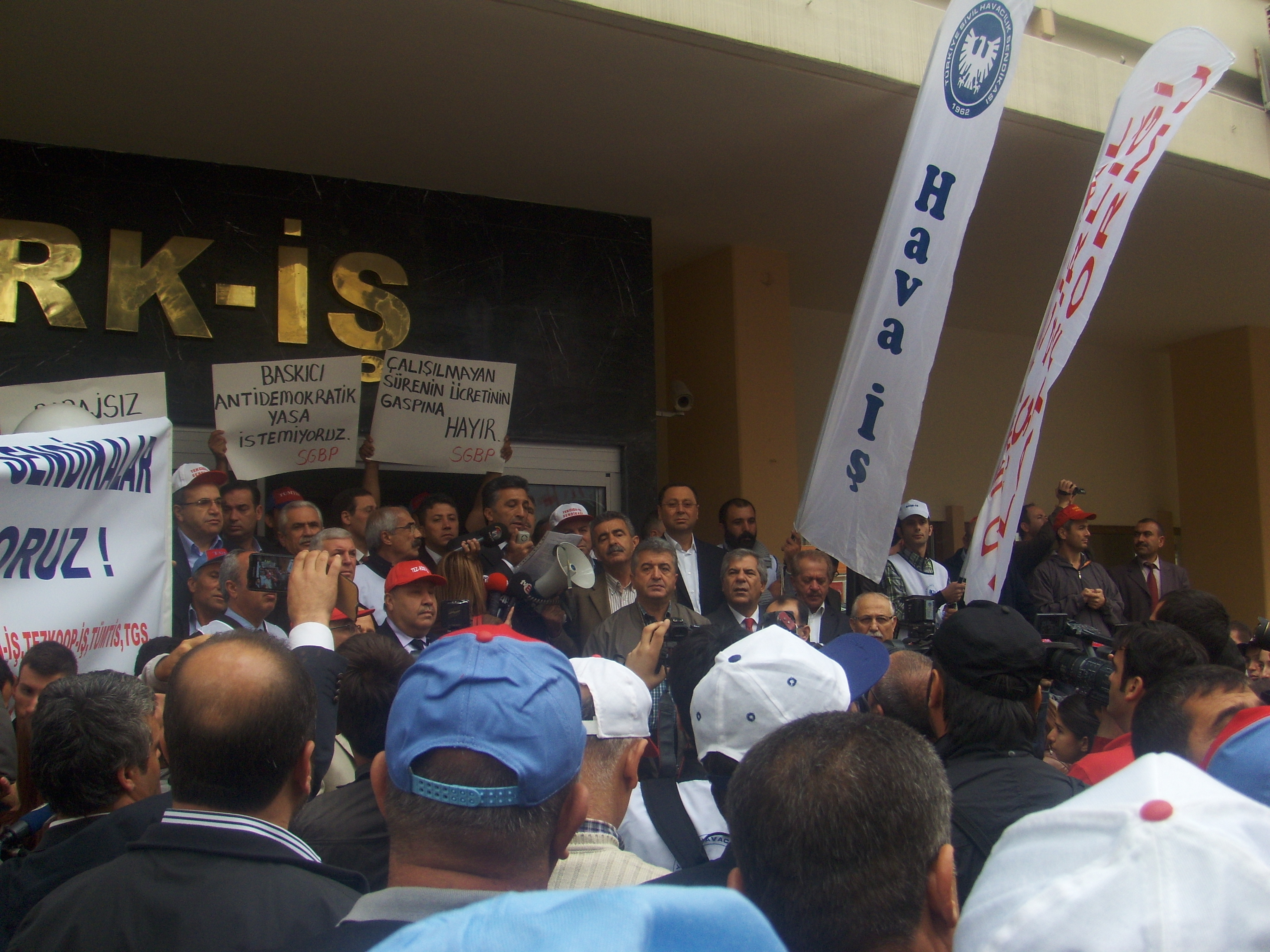 Uzun bir bekleyişin ardından burada ilk açıklamayı, Türk-İş’e bağlı sendikaların oluşturduğu SGBP sözcüsü Kenan Öztürk yaptı. AKP’nin ileri demokrasisini bir kez daha gördüklerini belirten Öztürk, “Karşılaştığımız muamele gaz bombası ve coptur. AKP’nin zulmüne karşı sonuna kadar mücadele edeceğiz. Bu yasaya karşı asla geri adım atmayacağız” dedi. “Sendikalarla anlaştık, mutabakat sağlandı” sözlerinin doğru olmadığını belirten Öztürk, “Sendikalar burada. Biz DİSK’le de diğer sendikalarla da omuz omuza bu mücadeleyi sürdüreceğiz” dedi.