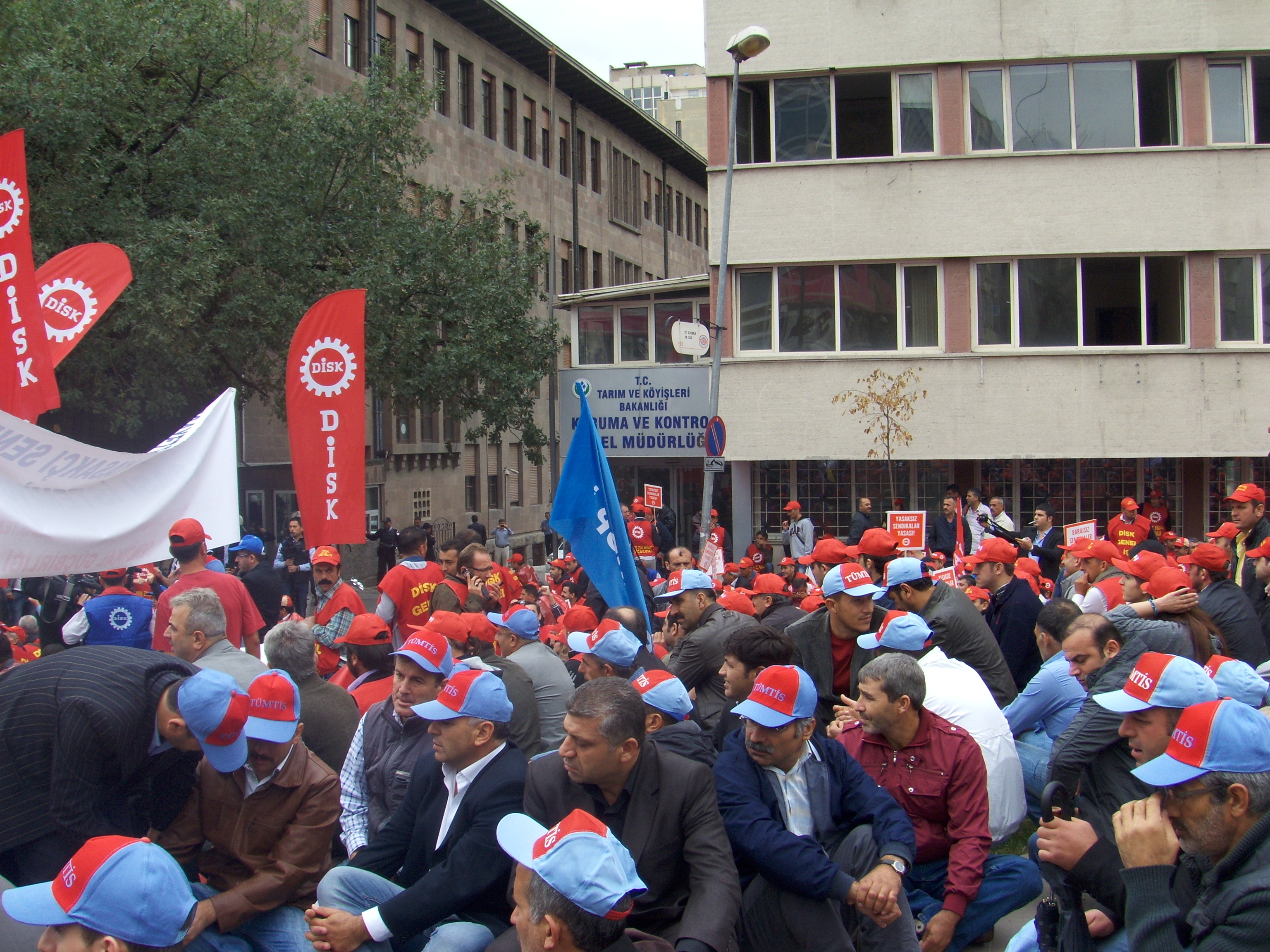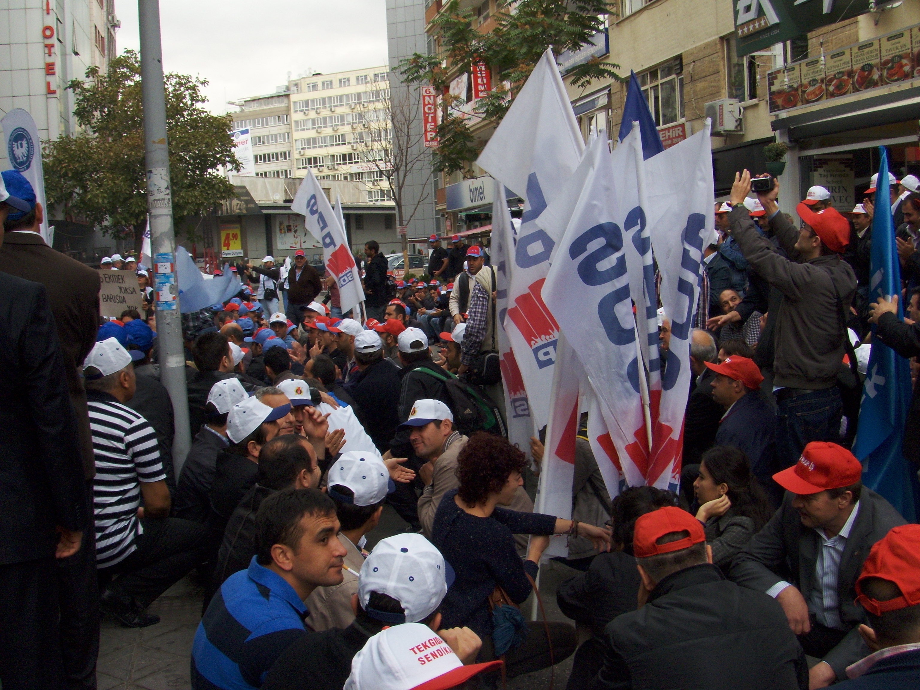 DİSK ve bağlı sendikalar ise Mithatpaşa’da Genel-İş önünde toplandı. “Zalimin zulmüne karşı direneceğiz”, “Yüz binlerce işçi sözleşme için yetki bekliyor, sendika düşmanlığı AKP ile sürüyor” yazılı pankartlar ve “yasaksız sendikalar yasası” dövizleri ile Sakarya Caddesi’ne yürüyen DİSK üyeleri, Tük-İş yakınlarında SGBP ile birleşerek, Meclis’e doğru birlikte yürüdü.