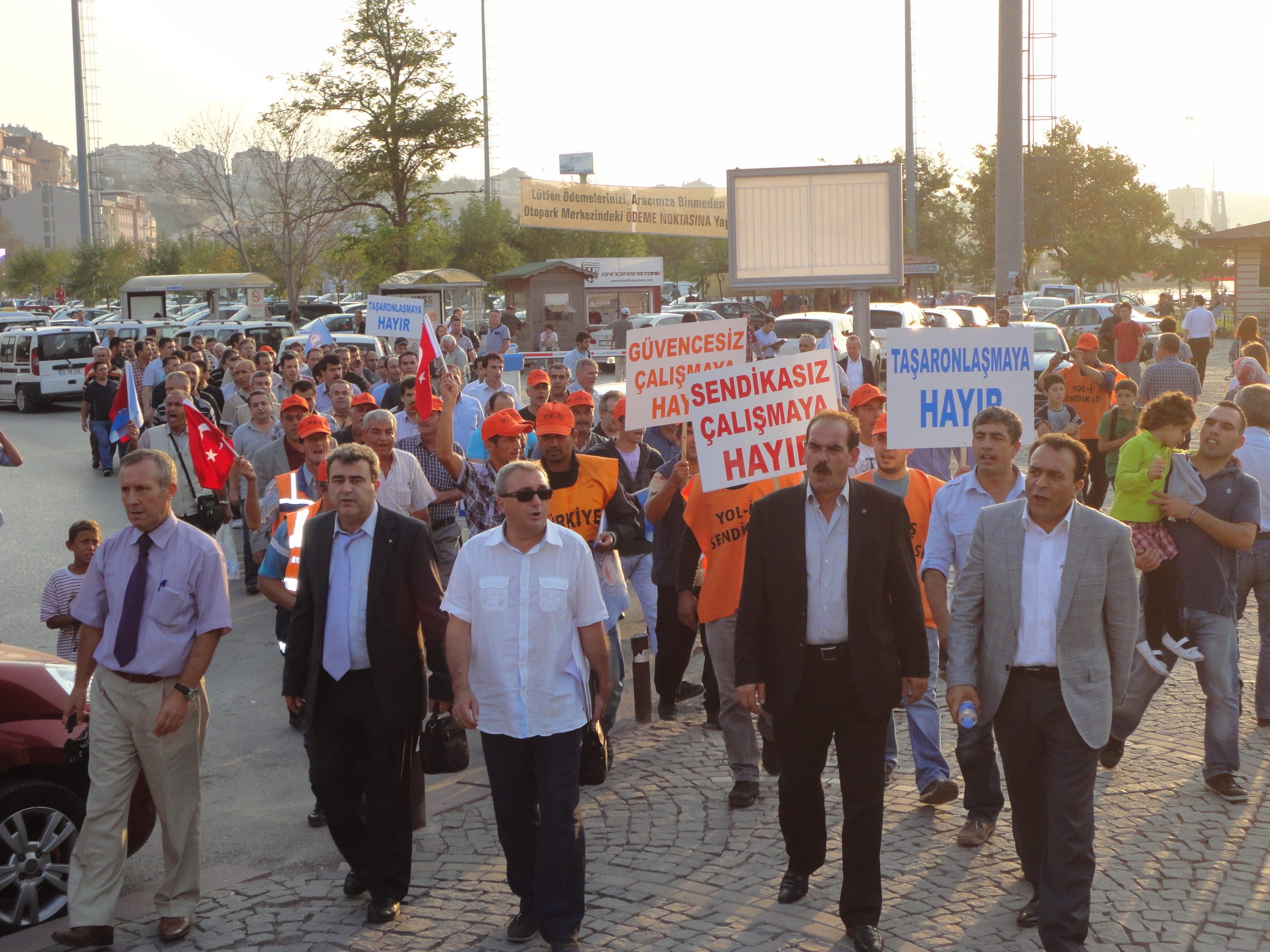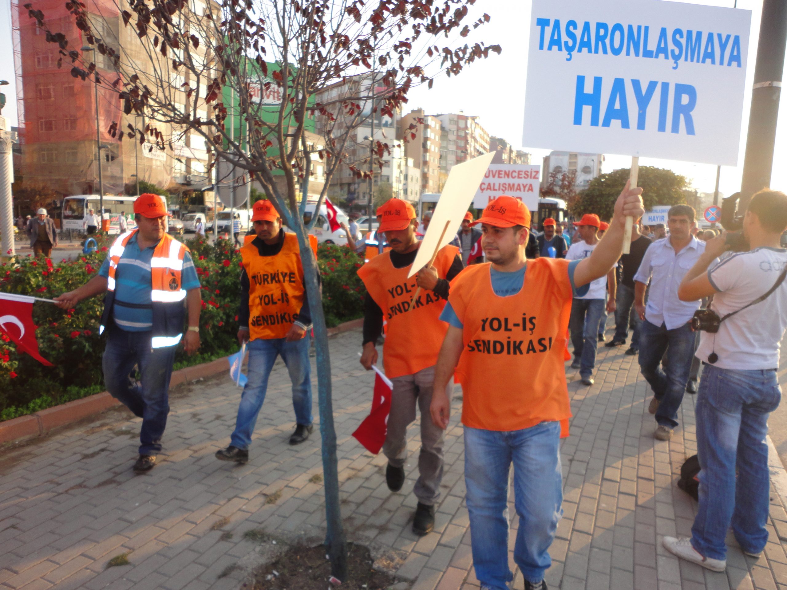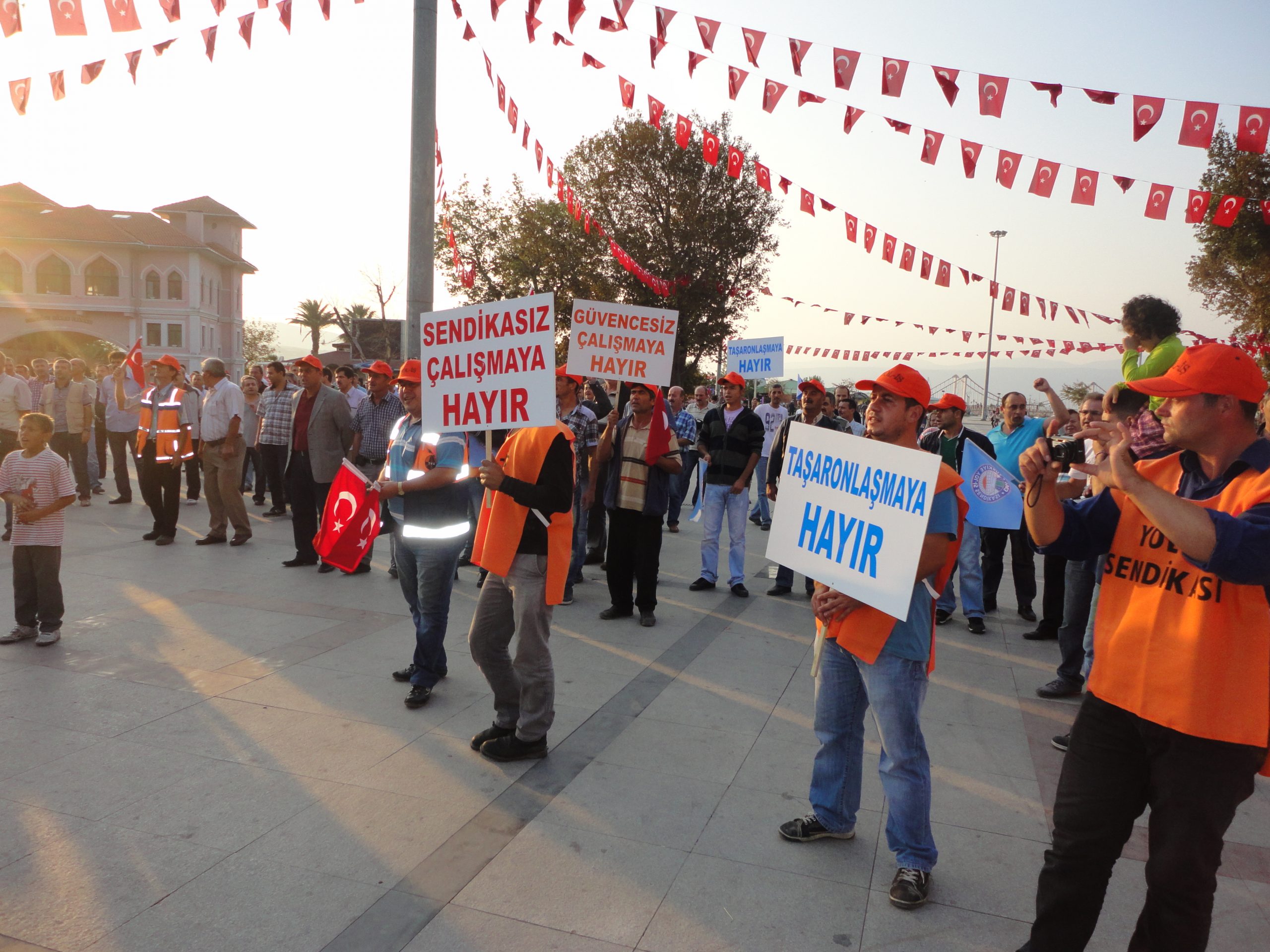 Daha sonra konuşan Yol-İş 1.nolu  Şube başkanı Muharrem Yıldız ise “Yol-İş in hukuk kazanımlarının ortadan kaldırma noktasında sürdürülen yasal düzenlemeler ve ardından hayata geçirilmek istenen yeni iş kanunu ile gerek kamu, gerekse özel sektörlerin eylem ve direnme gücü kırılmış çalışan kesimle donatılacak işçi çalıştırma ofislerinin oluşturulacağını, bu uygulamanın kelimenin tanımı ile yeni köle düzeni olduğunu” söyledi. Yıldız “Yapılmak istenen hırsızlıkları kent kent gezerek AKP  teşkilatları önlerinde vatandaşa anlattıklarını birçok kentte Bandırma da olduğu gibi iktidarın kamu gücünü kullanarak parti teşkilatlarının önlerinde eylem yaptırmadığını” söyledi.  İktidarın bu köle düzenini bozmak adına verdikleri mücadelenin, Hem hukuk, hem de eylem bazındaki mücadelenin devam edeceğini belirten başkan Yıldız yeni oluşturulmak istenen işçi ofisleri ile çalışan kesimi ıslah ederken, Devletin trilyonluk iş makinelerinin de depolarda saklanarak kısa bir süre sonra iş satın alımı yöntemi ile yandaşlara ihale edilecek yol yapım çalışmaları için bu kişilere iş makinelerinin peşkeş çekileceğini söyledi.