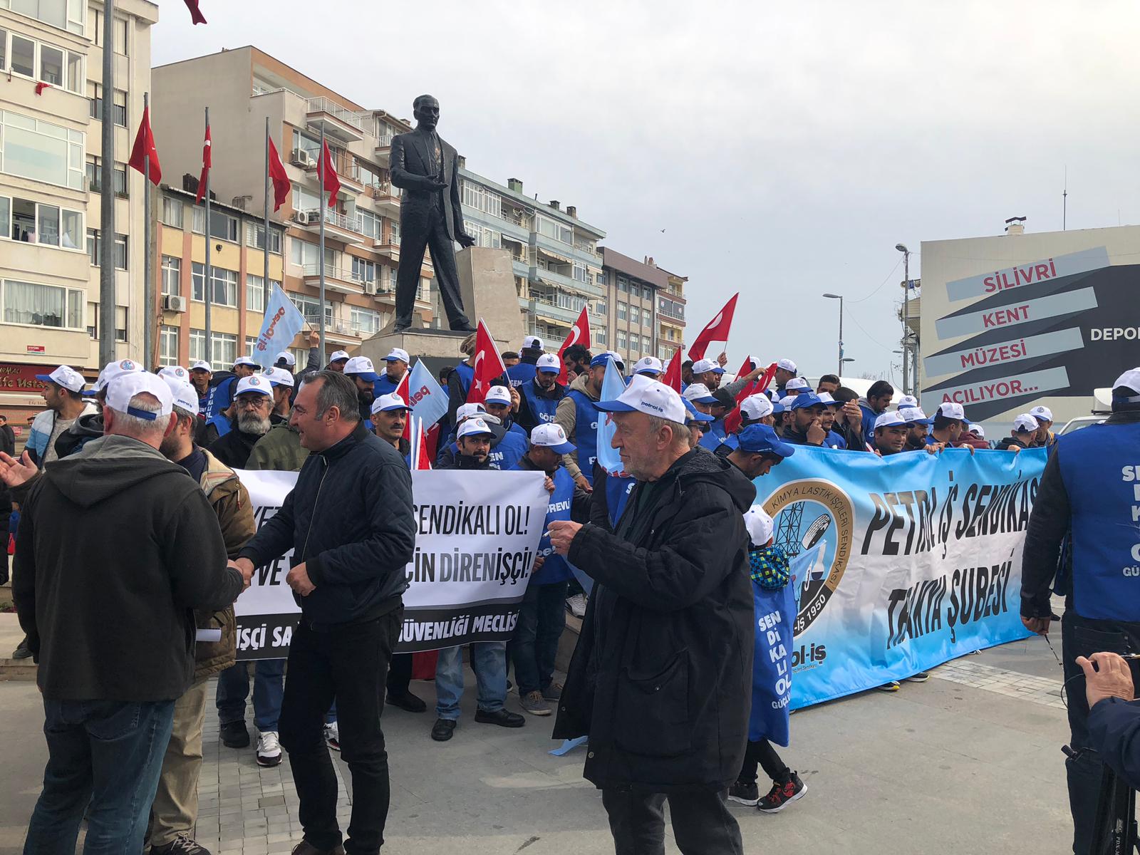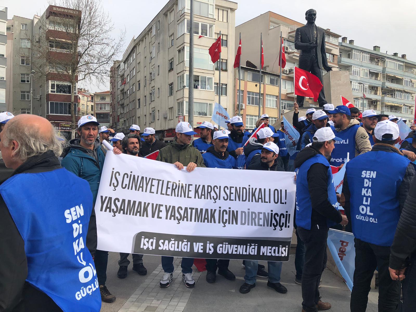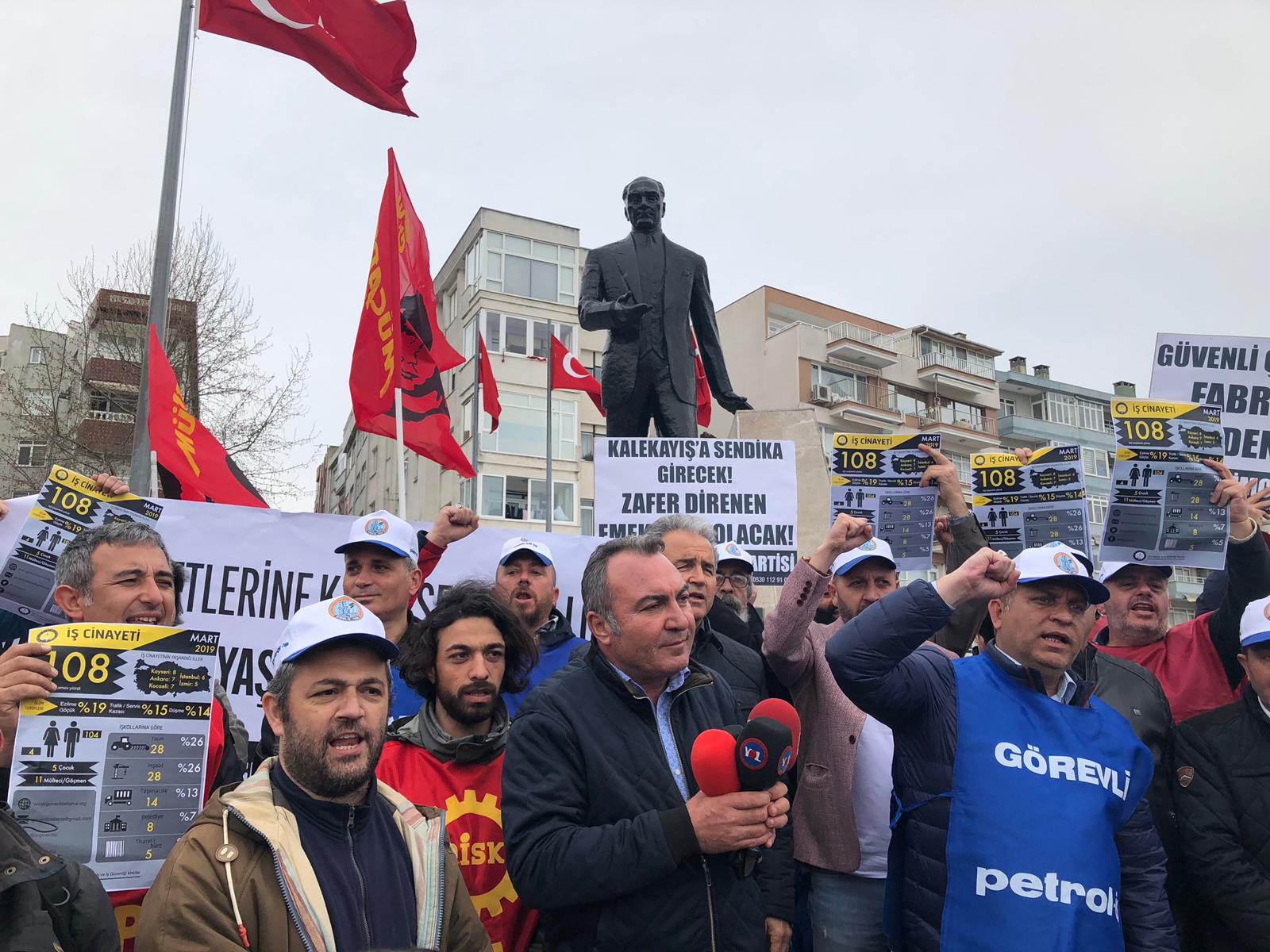 Basın açıklaması saat 17.00’de Silivri sahilinde, Atatürk Heykeli önünde yapıldı. Basın açıklamasında ilk konuşmayı, Petrol-İş Trakya Şube Başkanı Ercan Yavuz yaptı. Yavuz, destek için gelenlere teşekkür ederek başladığı konuşmasında, Silivri’de, Kale Kayış’ın olduğu bölgede, 450 civarında fabrika olduğunu ve bunların hiçbirinde sendika olmadığını, sendikalı tek işyerinin Kale Kayış olduğunu, patronun da bunu hazmedemediğini söyledi. Petrol-İş Trakya Şubesi olarak, örgütlenme çalışmalarına 2018’in ocak ayında başladıklarını, aynı yılın ekim ayında bakanlıktan yetki aldıklarını, yetkiyi aldıktan sonra patronun baskılarının arttığını, 2 işçiyi işten attığını, üye olan 150 işçiyi sendikadan istifaya zorladığını söyledi. İşçilerin sendikalı olmalarının bir hak olduğunu hatırlatan Yavuz, Kale Kayış işçilerinin de bu hakkı kullandığını vurguladı. Bu mücadelenin fabrikadaki işçi sağlığı ve iş güvenliği sorunları ortadan kalkana kadar devam edeceğinden kimsenin şüphesinin olmaması gerektiğini belirten Yavuz’dan sonra sözü İşçi Sağlığı ve İş Güvenliği Meclisi Genel Koordinatörü Murat Çakır aldı. Çakır, Mart ayında 108 işçinin çalışırken öldüğünden bahsedip, 108 işçinin hepsinin de sendikasız yerlerde çalıştığına dikkat çekti ve ekledi: “sendikasız çalışmak ölüm demektir.”