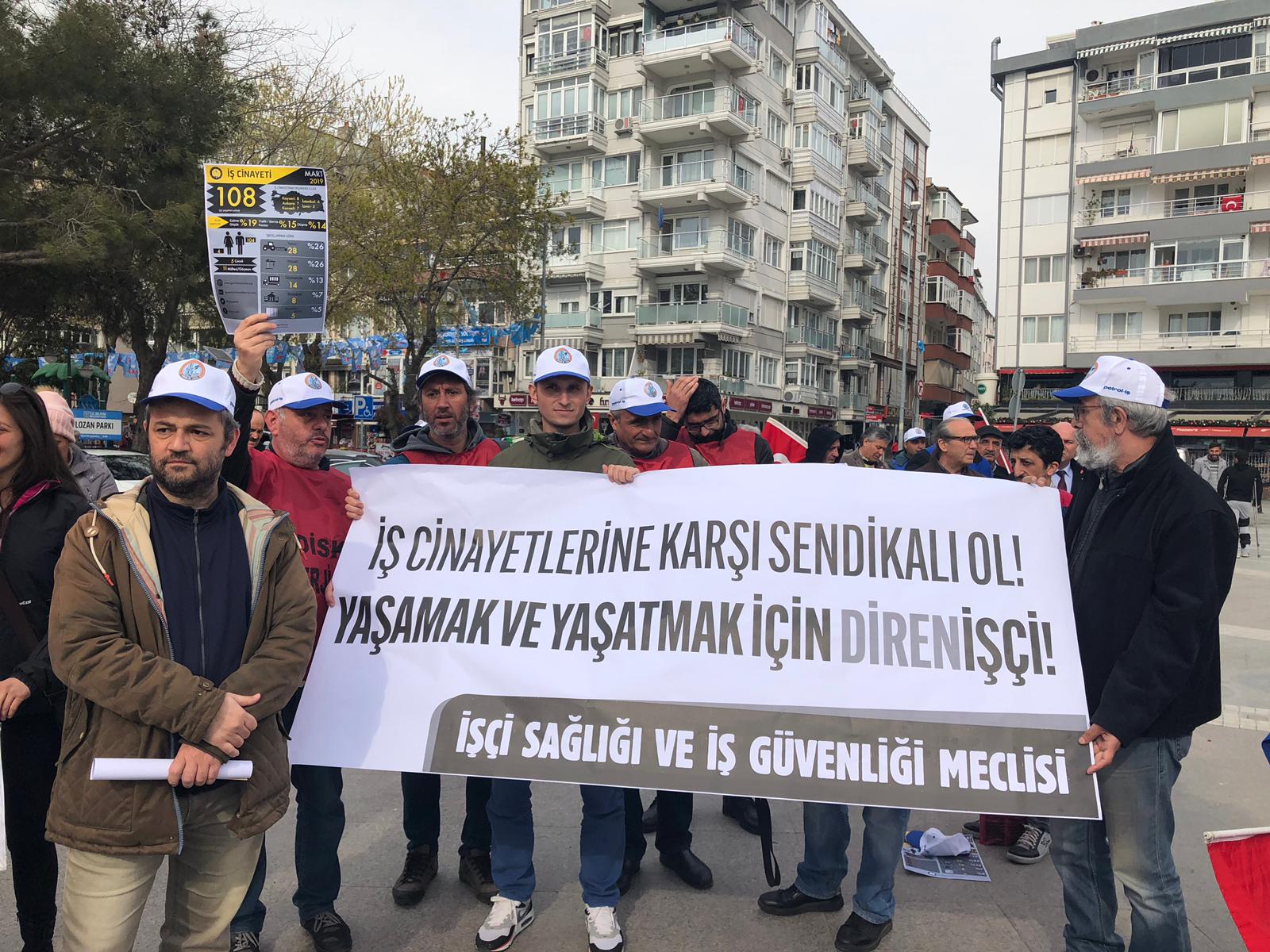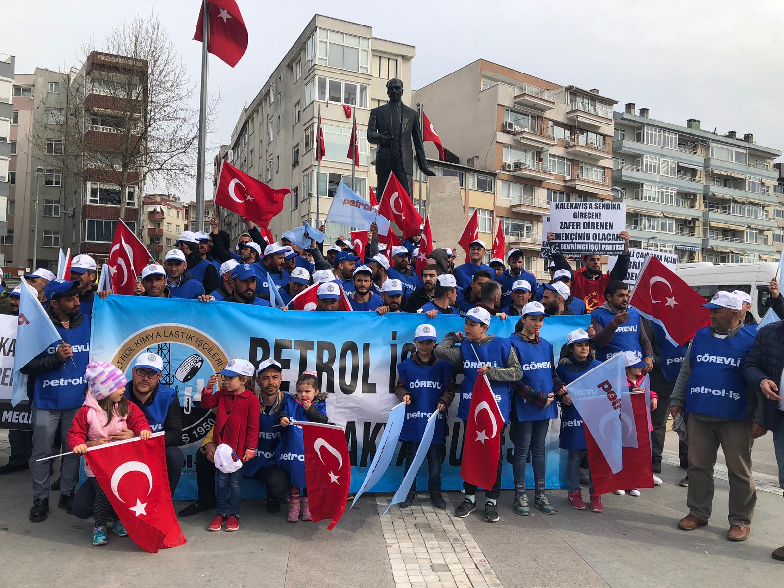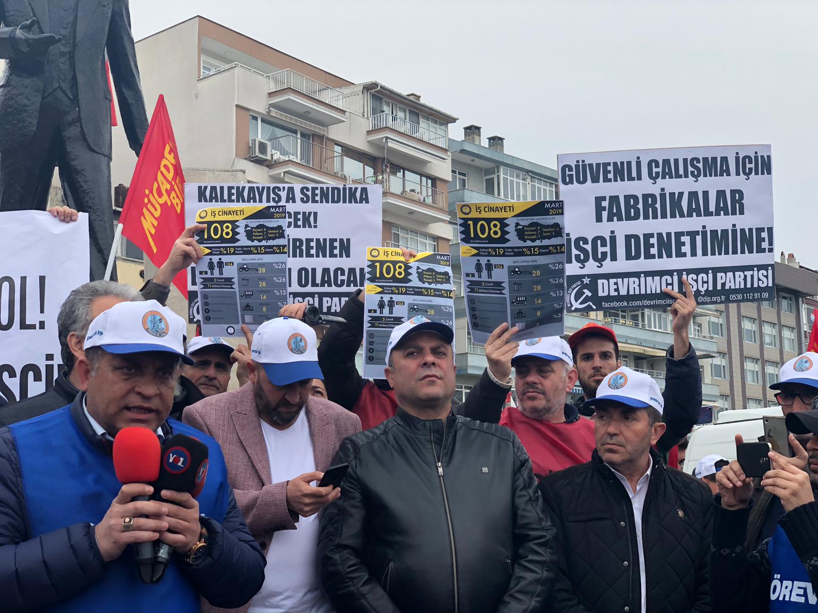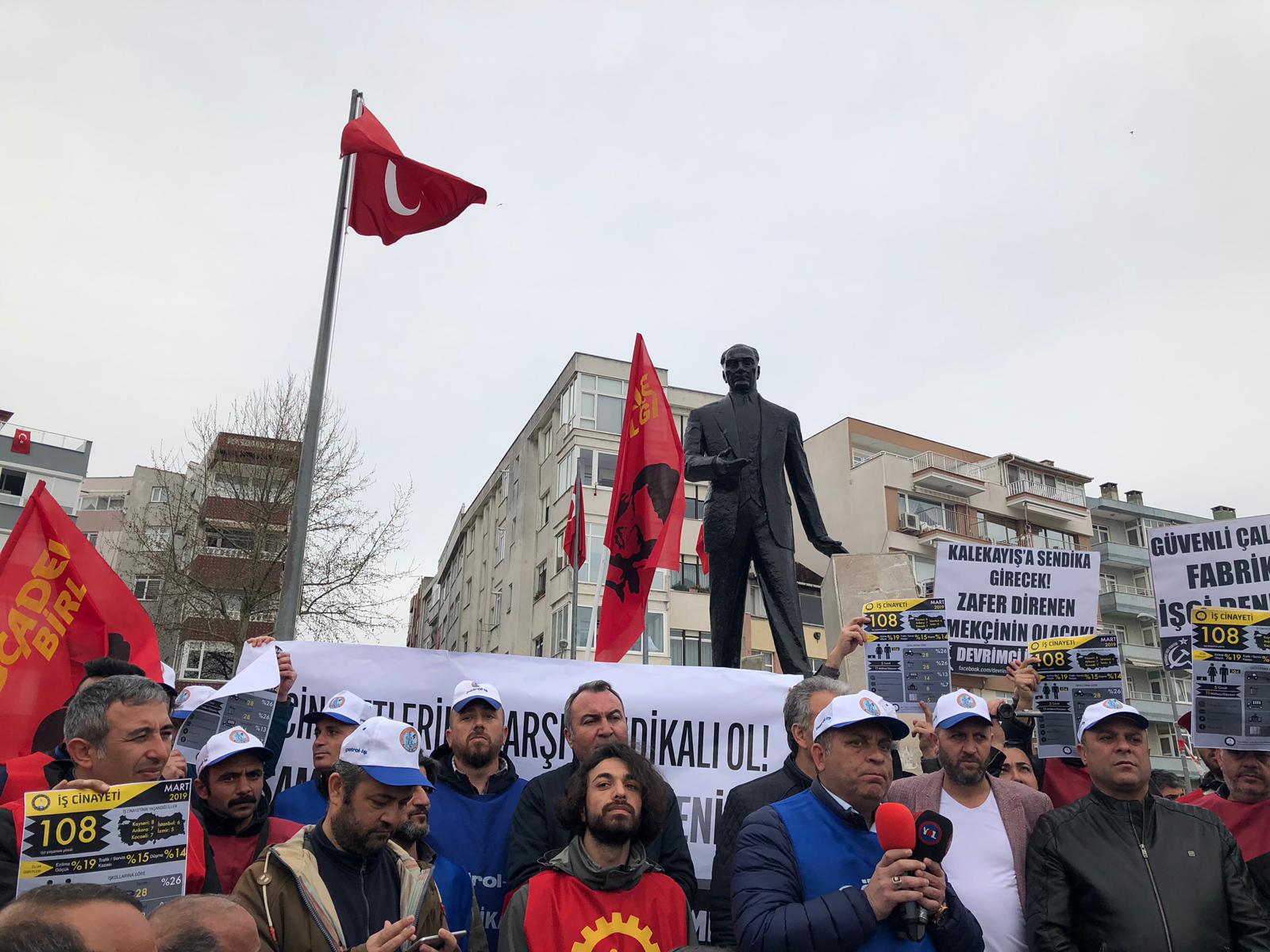 Basın açıklaması saat 17.00’de Silivri sahilinde, Atatürk Heykeli önünde yapıldı. Basın açıklamasında ilk konuşmayı, Petrol-İş Trakya Şube Başkanı Ercan Yavuz yaptı. Yavuz, destek için gelenlere teşekkür ederek başladığı konuşmasında, Silivri’de, Kale Kayış’ın olduğu bölgede, 450 civarında fabrika olduğunu ve bunların hiçbirinde sendika olmadığını, sendikalı tek işyerinin Kale Kayış olduğunu, patronun da bunu hazmedemediğini söyledi. Petrol-İş Trakya Şubesi olarak, örgütlenme çalışmalarına 2018’in ocak ayında başladıklarını, aynı yılın ekim ayında bakanlıktan yetki aldıklarını, yetkiyi aldıktan sonra patronun baskılarının arttığını, 2 işçiyi işten attığını, üye olan 150 işçiyi sendikadan istifaya zorladığını söyledi. İşçilerin sendikalı olmalarının bir hak olduğunu hatırlatan Yavuz, Kale Kayış işçilerinin de bu hakkı kullandığını vurguladı. Bu mücadelenin fabrikadaki işçi sağlığı ve iş güvenliği sorunları ortadan kalkana kadar devam edeceğinden kimsenin şüphesinin olmaması gerektiğini belirten Yavuz’dan sonra sözü İşçi Sağlığı ve İş Güvenliği Meclisi Genel Koordinatörü Murat Çakır aldı. Çakır, Mart ayında 108 işçinin çalışırken öldüğünden bahsedip, 108 işçinin hepsinin de sendikasız yerlerde çalıştığına dikkat çekti ve ekledi: “sendikasız çalışmak ölüm demektir.”