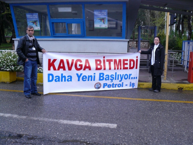 Pazartesi sabahı 08.00 – 16.00 vardiyasına gelen işçiler ile gece vardiyasından çıkan üyelerimiz Tüpraş’ın ana kapısında toplanarak, ‘Kavga bitmedi, daha yeni başlıyor’ pankartlarını açarak 1 saat iş bıraktı.