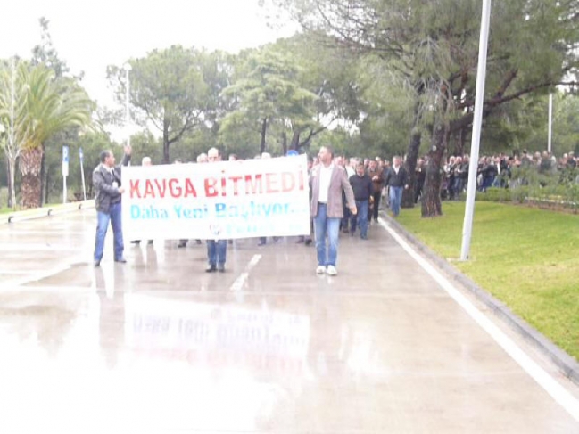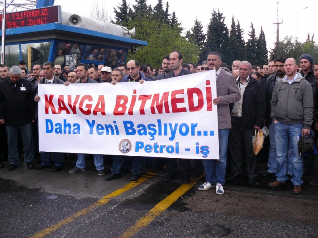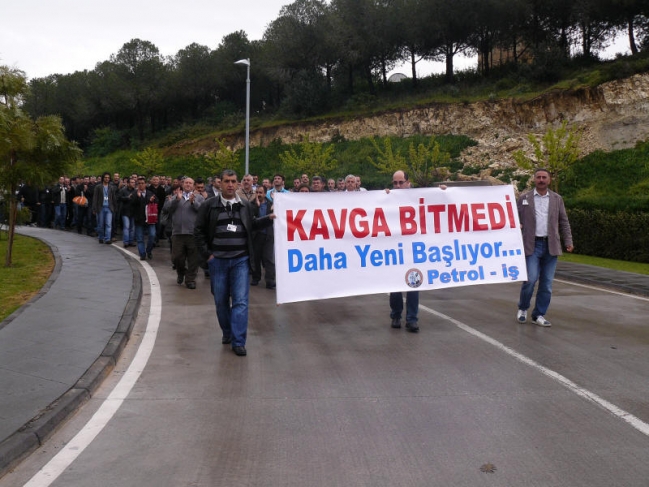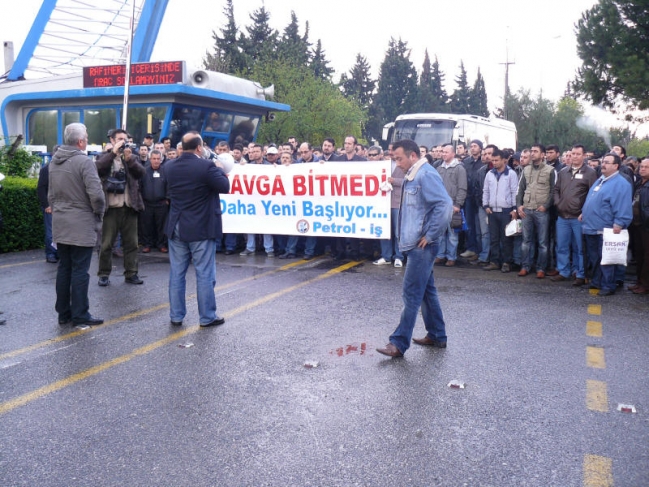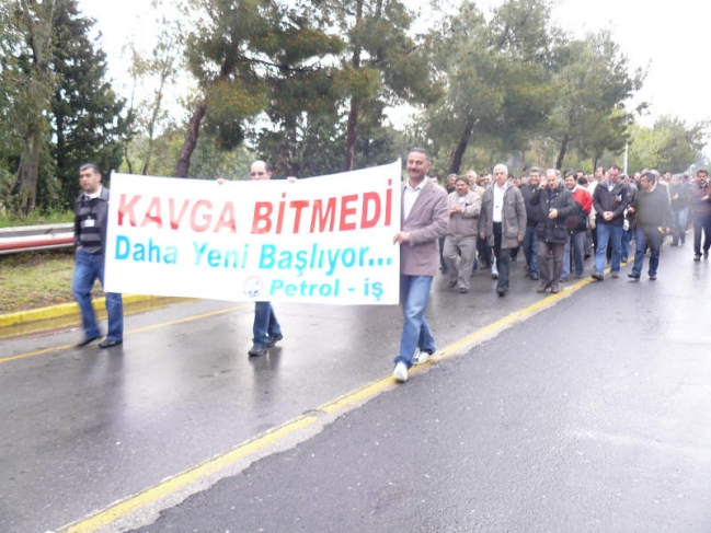 Giriş kapısında yapılan basın açıklamasının ardından, ‘İş ekmek yoksa barış da yok’, ‘Zafer direnen işçilerin olacak’, ‘Örgütlü işçi asla yenilmez’ sloganlarıyla Rafineri Bölge Müdürlüğünün önünden yürüyen Petrol-İş üyeleri bir saat sonra işbaşı yaptı.