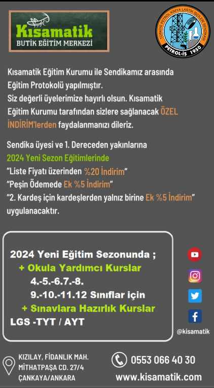 Üyelerimiz ve birinci derece yakınlarının uygun fiyatlarla eğitim hizmeti alabilmesi konusunda Kısamatik Butik Eğitim Merkezi ile Ankara Şubemiz arasında kurumsal anlaşma yapıldı. Anlaşma Ankara Şube Yönetimimiz ve Kısamatik Butik Eğitim Merkezi yetkilileri arasında imzalandı. Detaylı bilgiye sendikamızın web sayfası Kurumsal Anlaşmalar bölümünden ulaşabilirsiniz.