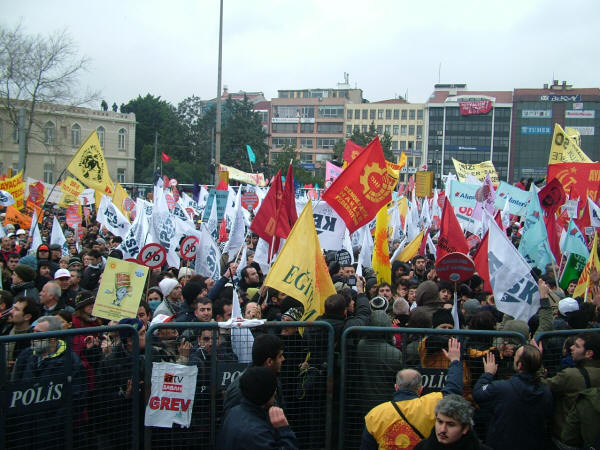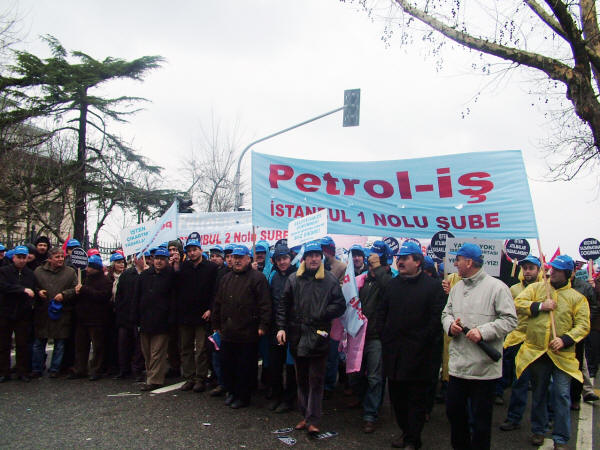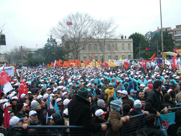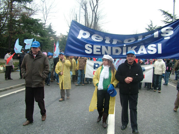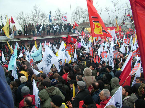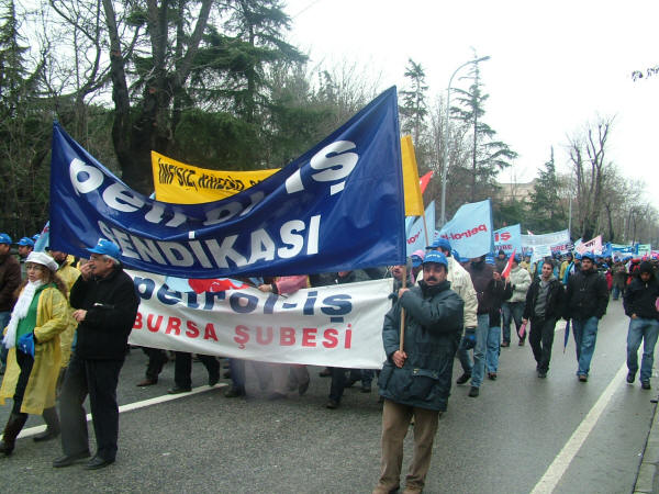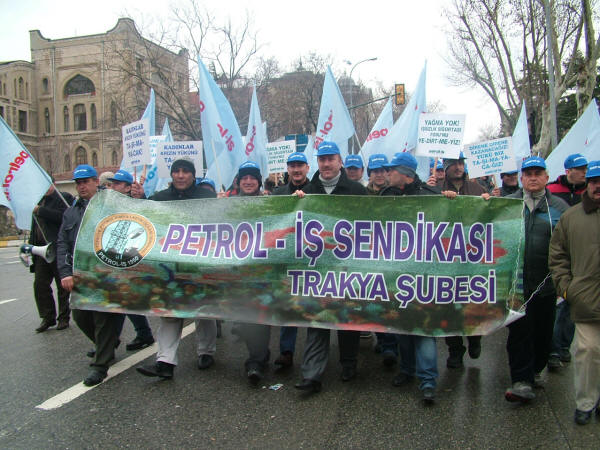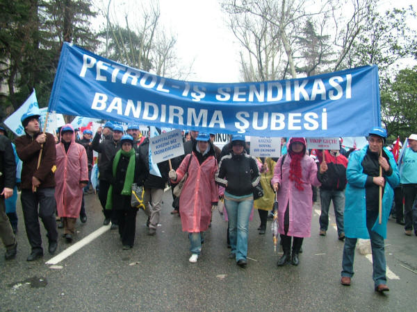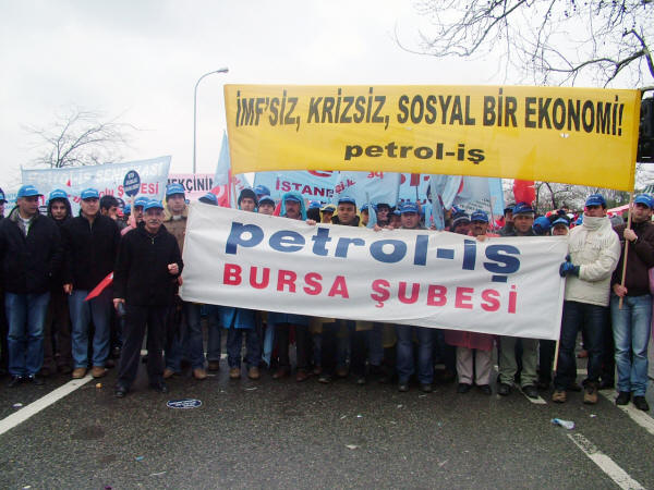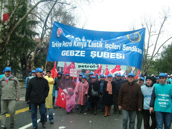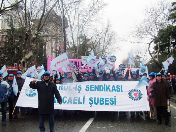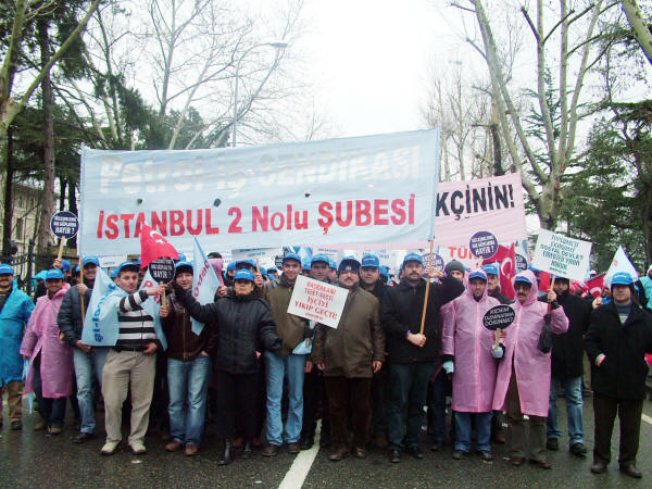 Mitinge 100 bin civarında işçi ve emekçi katıldı. İşten çıkarmalara, işsizliğe ve yoksulluğa karşı çıkan onbinlerce emekçi, 15 Şubat’ta Kadıköy İskele Meydanı’nda yapılan mitingde ekonomik krizin faturasını ödemeyeceklerini haykırdı. İşsizliğe ve yoksulluğa karşı birleşik mücadele çağrısı yapılan mitingde işten çıkarmaların yasaklanması istenirken, krizin faturasını emekçilere çıkarmak isteyen sermaye ve siyasi iktidar da protesto edildi. “Krizin Bedelini Ödemeyeceğiz: İşsizliğe ve Yoksulluğa Karşı Birleşik Mücadele, Emek ve Demokrasi Mitingi”ne katılmak için işçi ve emekçiler, Pazar sabahı, saat 9.30”dan itibaren Haydarpaşa Numune Hastanesi, Tepe Nautilus Alış Veriş Merkezi ve Haydarpaşa Garı önünde toplandılar. Türk-İş, DİSK ve KESK’e bağlı sendikalarla TMMOB, Türk Tabipler Birliği, diğer meslek örgütleri, siyasi partiler, sivil toplum kuruluşları ve demokratik kitle örgütlerinin katıldığı miting için işçi ve emekçiler, sermayeyi ve AKP iktidarını protesto eden sloganlarla İskele Meydanı’na doğru yürüyüşe geçtiler. Sendikamızın Bandırma, Bursa, Gebze, İstanbul 1 Nolu, İstanbul 2 Nolu, Kocaeli ve Trakya şubelerinde örgütlü Petrol-İş üyeleri mitinge yoğun katılım gösterdi. Petrol-İş, mitingde kitleselliğiyle dikkat çekti. Sendikamız Genel Başkanı Mustafa Öztaşkın, Genel Sekreter Mustafa Çavdar, Genel Mali Sekreter İbrahim Doğangül, Genel Örgütlenme ve Eğitim Sekreteri Nimetullah Sözen, Genel Yönetim Sekreteri Mehmet Güray, şube başkanları ve yöneticilerimiz de mitinge katıldı. Coşkulu geçen mitinge 100 bin civarında işçi ve emekçi katıldı. Petrol-İş üyeleri mitingde, “ Yeter Söz Emekçinin”, “Kapitalizmin Krizini Biz Taşımayacağız”, “İşsizlik, Yoksulluk Kaderimiz Değil, “IMF’siz, Krizsiz, Sosyal Bir Ekonomi,”, “Emekçinin Sesi Sermaye Kadar Çıkmadıkça Bu Düzen Değişmez”, “Krizsiz ve Savaşsız Bir Dünya Mümkün”, “İşçi-Memur Elele, Genel Greve, “Ekmeğimizle Oynamayın, 15-16 Haziran’ı Unutmayın” pankartlarını açtılar. Saat 11.00’de Türk-İş korteji Haydarpaşa Numune Hastanesi önünden, DİSK ve KESK korteji Tepe Nautilus’tan, diğer konfederasyon ve sendikaların bir kısmı da Haydarpaşa Garı’nın önünden yürüyüşe geçti. Yürüyüş boyunca, “ Krizin bedelini ödemeyeceğiz”, “İşten atmalar yasaklansın”, “Ayaklar baş olsun, kıyamet kopsun,” “Emeklilik yaşı 65, doğal gaz zammı 85,” Doğalgaz sayacı 250 dolar, bu halk seni sandıkta boğar” dövizleri taşıyan işçi ve emekçiler, “İşçilerin birliği sermayeyi yenecek”, “Genel grev, genel direniş”, “İşçi memur elele, genel greve” sloganları attılar. Sendikamız üyeleri işçiler de “Bizde sadece kuru ekmek kaldı, krizin faturasını pasta yiyenler ödesin”, “Özelleştirme masalı artık bitsin”, “Özelleştirmeler durdurulsun, ÖİB kapatılsın”, “Yağma yok, İşsizlik Sigortası Fonu’nu yedirmeyiz”, “Sizin düzeniniz iflas etti, çekilin, sıra bizde,” “Sosyal devlet, insanca bir yaşam, iş güvencesi”, “Kadınlar krizin yükünü taşımayacak”, “Kriz kadınları hapsedemeyecek”, “Hamdolsun kriz Başbakanı teğet geçti,” “Şov yapma, İsrail ile ikili anlaşmaları iptal et,” “ İşsizlik Sigortası Fonu kaynakları işçilere”, “Direne direne kazanacağız, yükü biz taşımayacağız” “Başbakanı teğet geçti, işçiyi yıkıp geçti”, “Emperyalizme ve IMF’ye tavrını koy, bu halk yanında olacaktır” şeklinde dövizlerle yürüyüşe geçtiler. Kadıköy İskele Meydanı’nda miting başlarken kortejin arka bölümünde yürüyüş hala sürüyordu. İşçilerin, emekçilerin yoğun bir katılım gösterdiği mitinge sendikal haklar için grevde ve direnişte olan işçiler de katıldı. 29 yıl aradan sonra ilk basın grevini gerçekleştiren TGS üyesi Sabah ve ATV çalışanları grev önlükleriyle yürüdüler. Grevde olan Basın-İş üyesi E Kart işçileri, Deri-İş üyesi Desa işçileri, Belediye-İş üyesi Çapa işçileri, Liman-İş üyesi Arkas Holding işçileri, Tez Koop üyesi IBM işçileri sendikal direnişlerini miting alanına taşıdılar. Türk-İş Başkanı Kumlu: Kriz fırsatçılarına karşı birleştik Kitle miting alanında toplanınca mitingi düzenleyen konfederasyonların genel başkanları ile sendikaların genel sekreterleri kürsü platformuna çıkarak mitinge katılanları “Türkiye’nin dört bin yanından bu kış günü yağmuru çamuru hiçe sayıp yola düşen işçiler, emekçiler, memurlar, emekliler, işsizler, gençler, bacılar, kardeşler, hoşgeldiniz. Hoşgeldiniz onbinler…” diye selamladılar. Mitingde ilk konuşmayı yapan Türk-İş Genel Başkanı Mustafa Kumlu, 15 Şubat’ta 10 binlerce emekçinin mitin meydanında toplanarak, umudu tercih ettiklerini söyledi. Kumlu “Kriz fırsatçılığı yapanlara, krizin emekçileri yüreğinden vurmasına sebep olanlara karşı birleşmeyi tercih ettik” dedi. Kumlu, işçilerin fabrikaların çalışmasını, kazandıklarıyla geçinebilmeyi, çocuklarını okutmayı ve memleket için çalışmak istediklerini, Türkiye’de üretilen her değerde işçilerin alın terinin olduğunu, Türkiye’nin AB kapısına gelmesinde de işçilerin çalışkanlığı ve demokrasi aşkının bulunduğunu söyledi. Kumlu, “Değerli kardeşlerim, ‘Mühür kimdeyse Süleyman O’dur’ diyorlar. ‘Para kimdeyse güç ondadır’ demek için daha fazla kar için çocuklarımızın, gençlerimizin geleceğini karartıyorlar” diye konuştu. Krizin yoksullaştırarak ve işsiz bırakarak aşılacak bir kriz olmadığını ifade eden Kumlu, “Dünya biliyor, görüyor önlemini alıyor. Sadece zenginler korunarak bu çark artık dönmüyor. Ey hükümet sen de gör