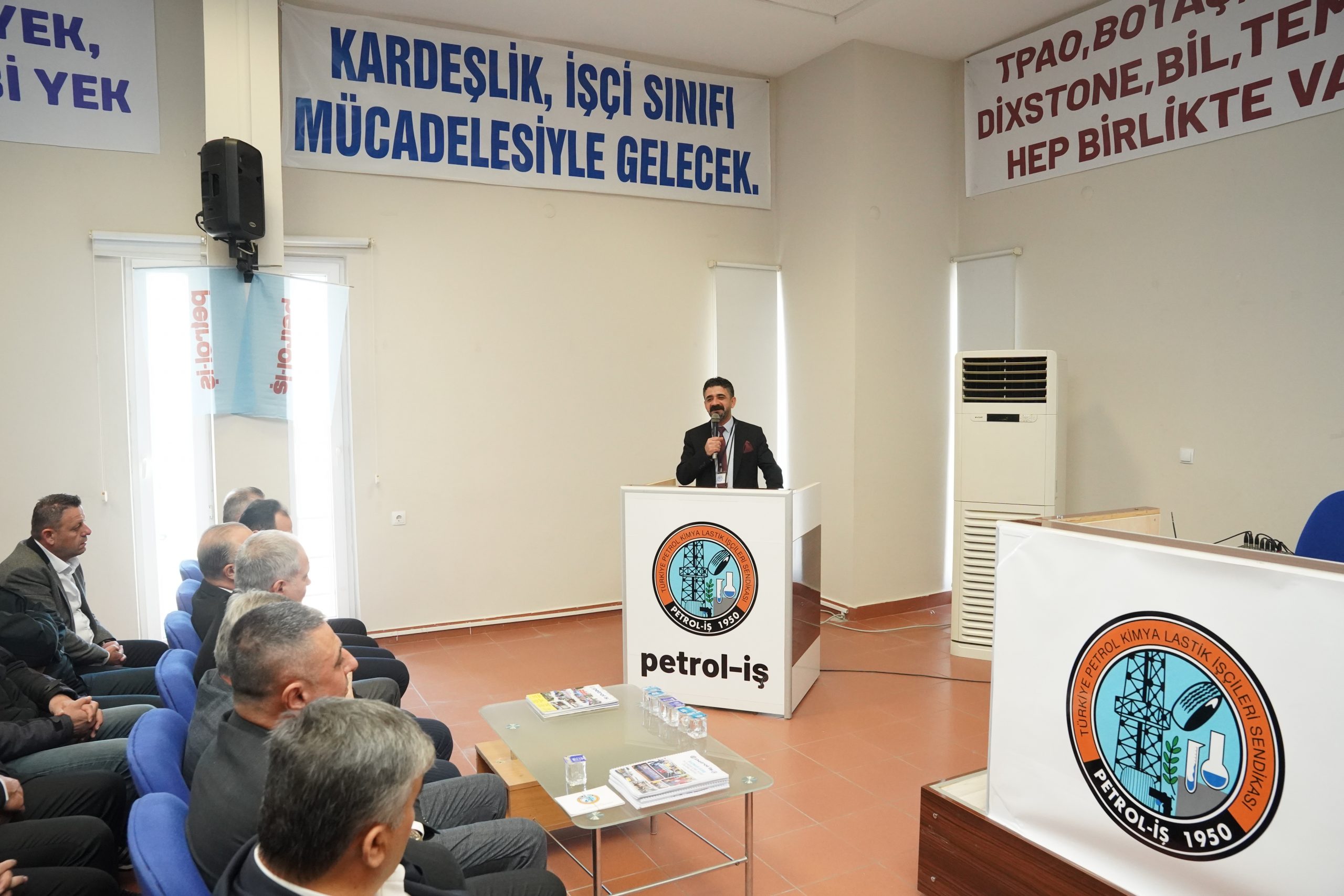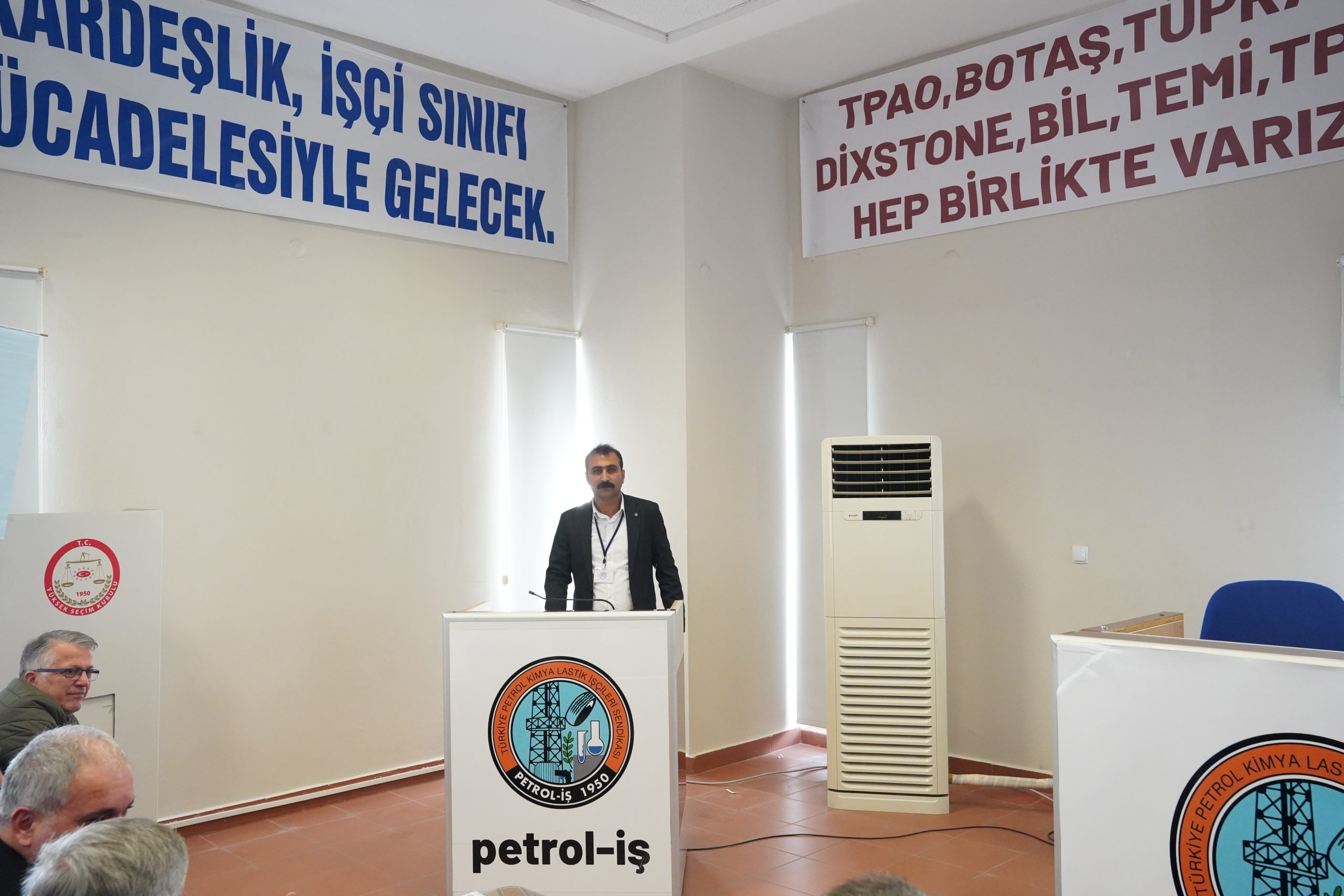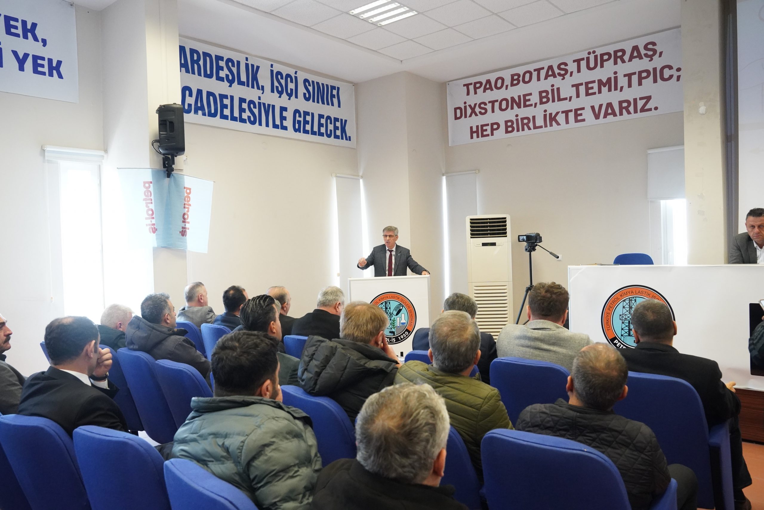 “Petrol-İş Sendikası Türkiye sendikal hareketinde demokrasinin, çok renkliliğin ve kültürel mozaiğin temsilcisidir. Petrol-İş Sendikası’nın iradesi ve bu iradenin hakimi üyeleridir, üyelerinin seçtiği delegasyon ve yönetimlerdir. Dolayısıyla bu denli demokratik, insan haklarına önem veren, sınıf mücadelesinde öncü olan, tarihi boyunca hiçbir iktidarın arka bahçesi olmayarak varlığını devam ettiren bir sendikaya kimse müdahale edemez, buna yeltenemez. Batman’ın önemini anlamadan, Batman’ın sınıf mücadelesi içindeki önemini anlamadan kimse hesap yapmamalı. Siyasi görüşleri, farklılıkları bu sendika hiçbir zaman ayırmamıştır, ayırmayacaktır da. Bu sendikayı, bu sendikanın üyesini kimse işiyle, aşıyla, görüşüyle korkutamaz, tehdit edemez çünkü biz yanlış ya da eksik yapmıyoruz. Bir usta başından tedirgin olan ve korkan nasıl sınıf mücadelesini verecek? Dolayısıyla korkuya ve tehdide kimse aldırış etmesin, bunlara karşı nasıl mücadele edeceğimizi öğrenelim. Eğer bir ustabaşından ya da amirden sınıfsal tercihlerimize müdahale etmesine razı gelirsek bizler daha büyük sorunlara karşı nasıl mücadele vereceğiz. Eğer sınıfsal, sendikal iradenizi birilerine ihaleye verirsek haklarımıza sahip çıkamayız.” dedi.