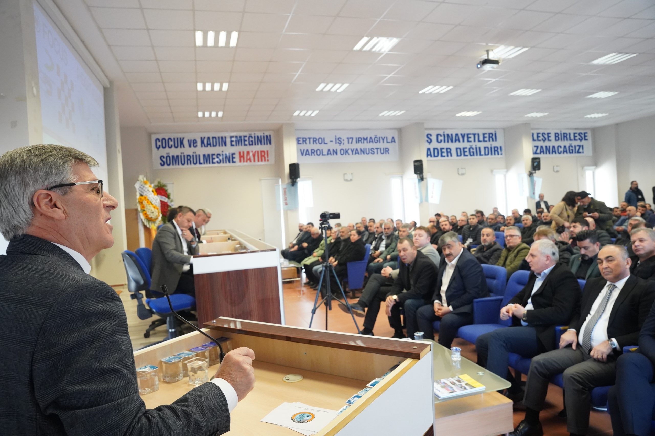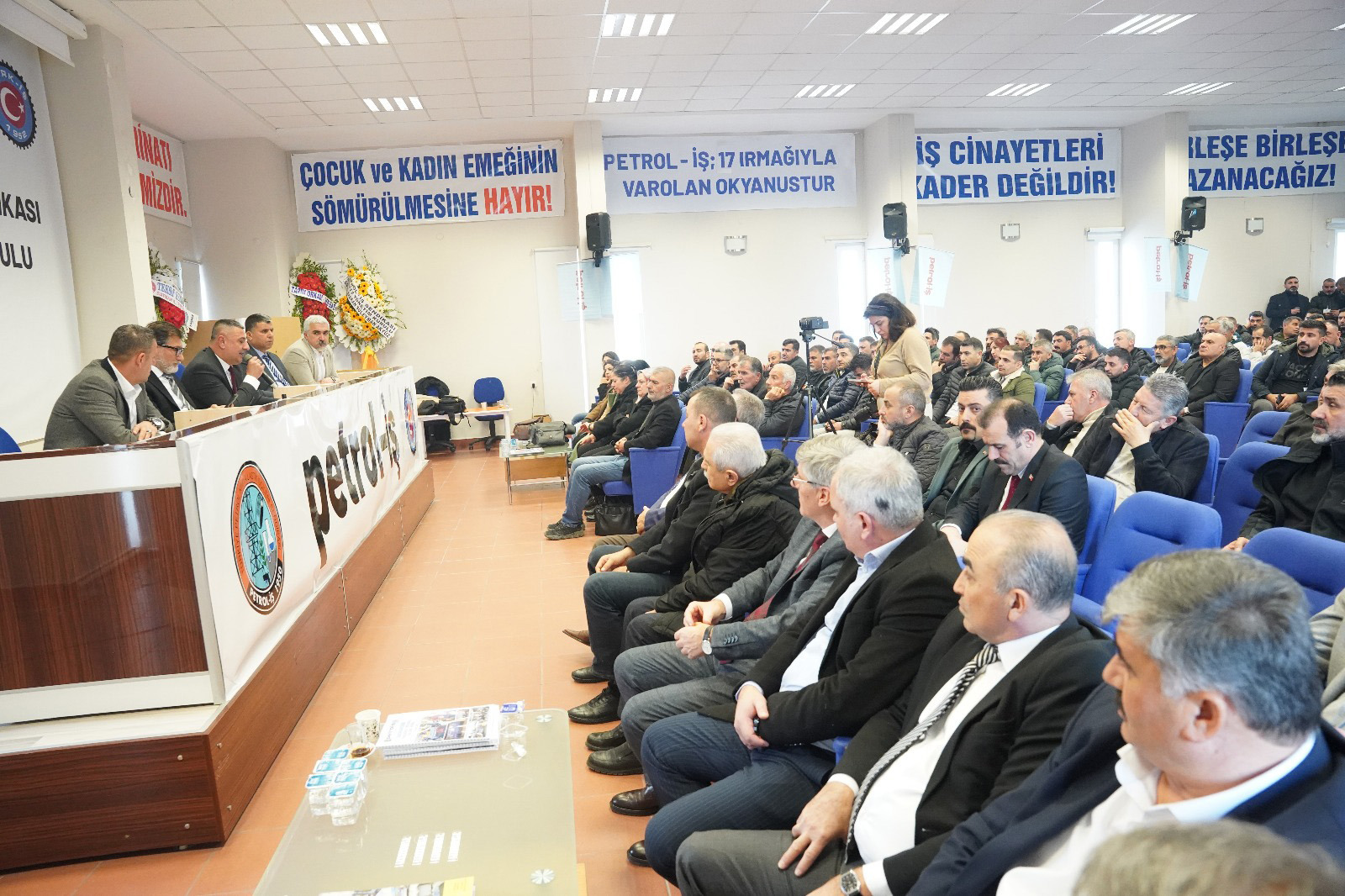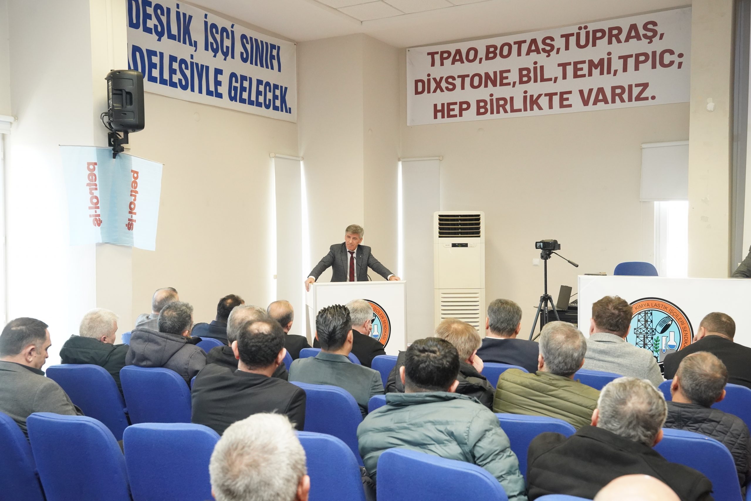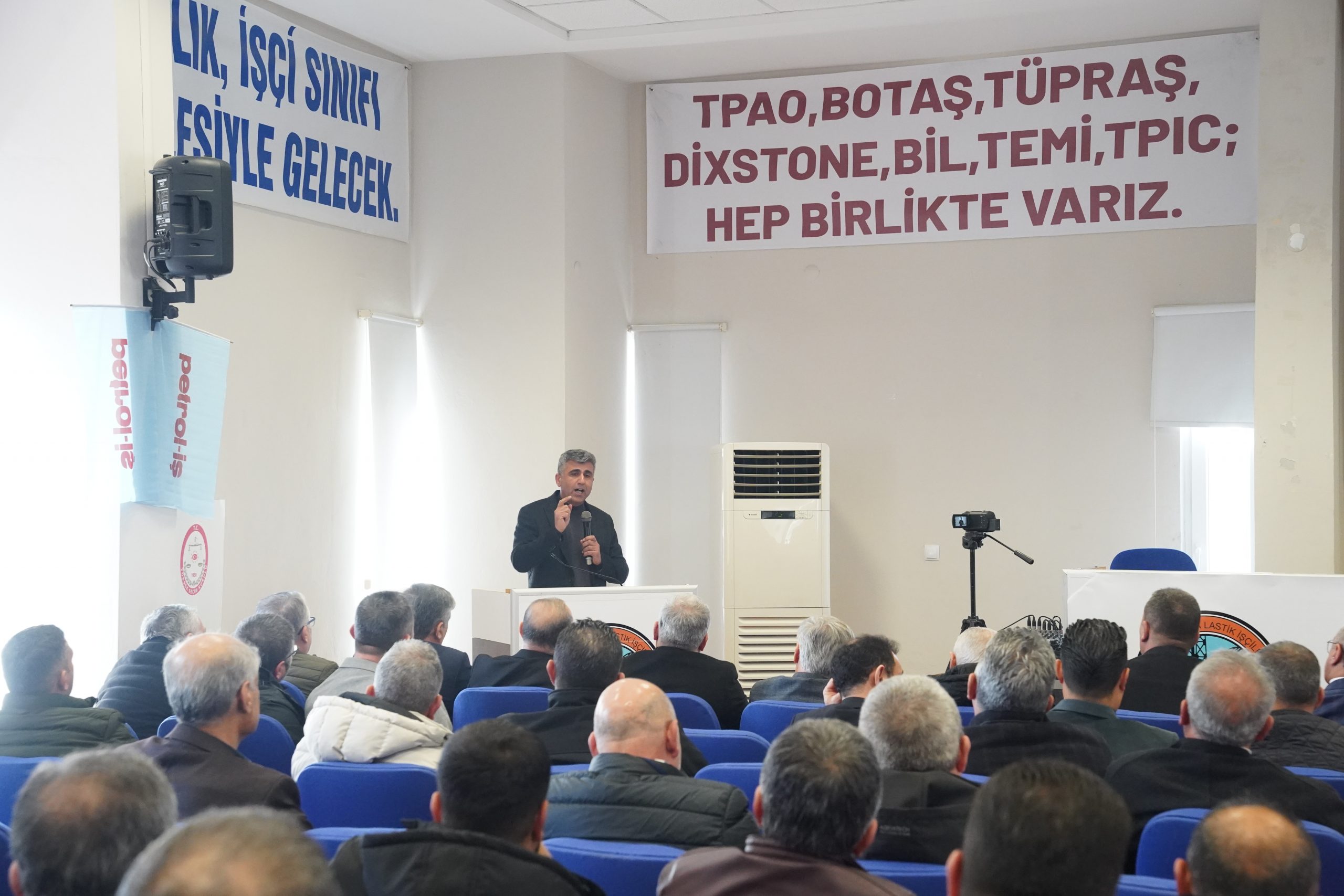 “Petrol-İş Sendikası Türkiye sendikal hareketinde demokrasinin, çok renkliliğin ve kültürel mozaiğin temsilcisidir. Petrol-İş Sendikası’nın iradesi ve bu iradenin hakimi üyeleridir, üyelerinin seçtiği delegasyon ve yönetimlerdir. Dolayısıyla bu denli demokratik, insan haklarına önem veren, sınıf mücadelesinde öncü olan, tarihi boyunca hiçbir iktidarın arka bahçesi olmayarak varlığını devam ettiren bir sendikaya kimse müdahale edemez, buna yeltenemez. Batman’ın önemini anlamadan, Batman’ın sınıf mücadelesi içindeki önemini anlamadan kimse hesap yapmamalı. Siyasi görüşleri, farklılıkları bu sendika hiçbir zaman ayırmamıştır, ayırmayacaktır da. Bu sendikayı, bu sendikanın üyesini kimse işiyle, aşıyla, görüşüyle korkutamaz, tehdit edemez çünkü biz yanlış ya da eksik yapmıyoruz. Bir usta başından tedirgin olan ve korkan nasıl sınıf mücadelesini verecek? Dolayısıyla korkuya ve tehdide kimse aldırış etmesin, bunlara karşı nasıl mücadele edeceğimizi öğrenelim. Eğer bir ustabaşından ya da amirden sınıfsal tercihlerimize müdahale etmesine razı gelirsek bizler daha büyük sorunlara karşı nasıl mücadele vereceğiz. Eğer sınıfsal, sendikal iradenizi birilerine ihaleye verirsek haklarımıza sahip çıkamayız.” dedi.
