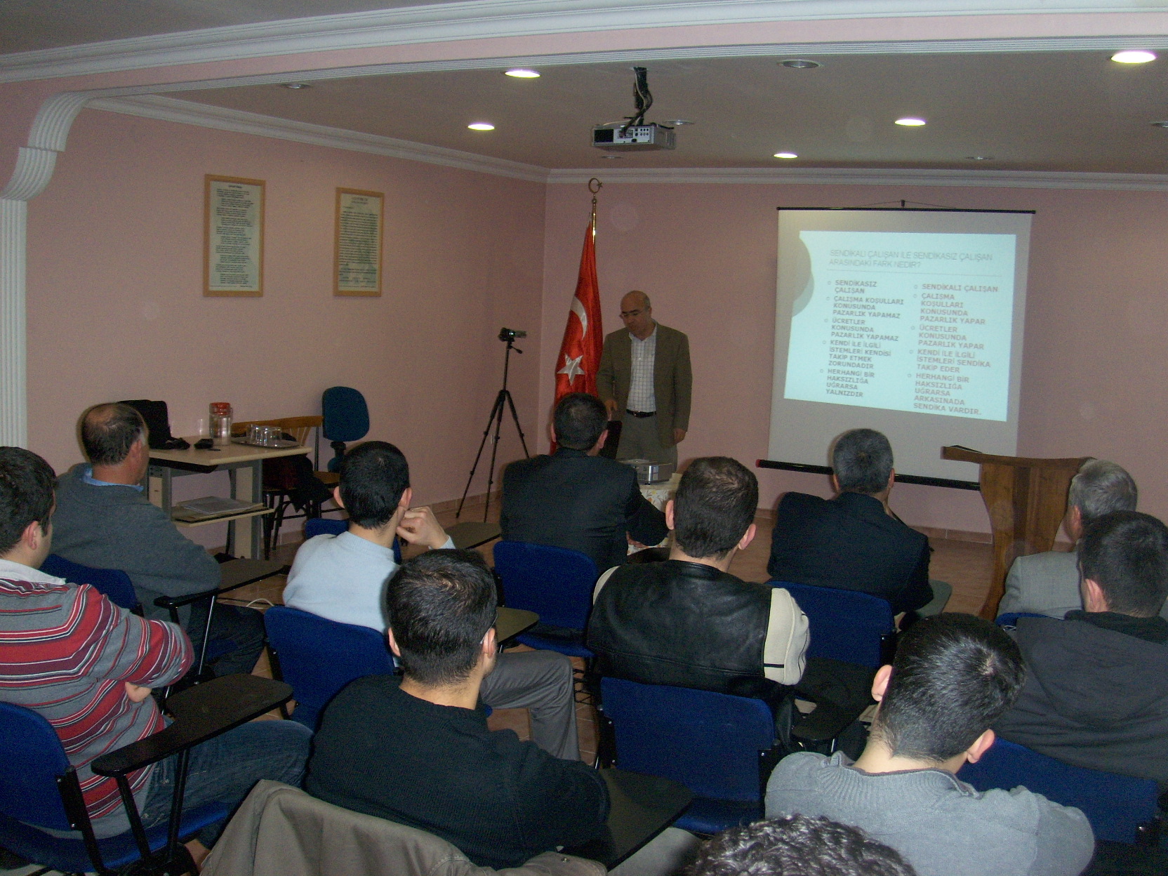 Eğitim semineri Şube Başkanı Şuayip GÜL’ün açış konuşmasıyla başladı ve Eğitim Uzmanımız İsmail Hakkı KURT’un sendikal eğitim programıyla devam etti. Programa katılan üyelerimize sendikanın tarihi, sendika ve örgütlülüğün önemi, sosyal haklarla ilgili bilgiler verildi.