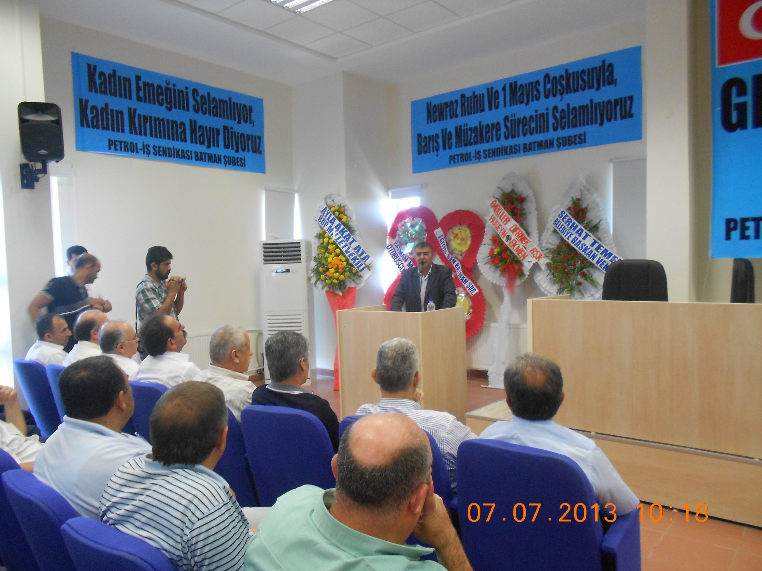 Petrol-İş Batman Şube Başkanımız Mustafa Mesut Tekik kongrenin açılış konuşmasında dünyada ve Ortadoğu’da yaşanan gelişmelere değindikten sonra, yüzyıllardır özgürlük arayışı içersinde olan Kürt ulusunun kardeşlik, eşitlik, özgürlük için çok büyük bir sınavı başarıyla geçtiklerine vurgu yaptıktan sonra, Türkiye’deki bütün halklarla ortak yaşamak için bir proje başlatıldığını belirterek şöyle devam etti: “Kürt halkı ve onun buradaki dinamikleri barış istiyor. Kürt halkı ve onun politik dinamikleri, 21. yüzyılda kendi anadiliyle, kültürüyle ve bölgedeki bütün halklarla barış içinde ve özgür bir biçimde yaşamak istiyor. ”