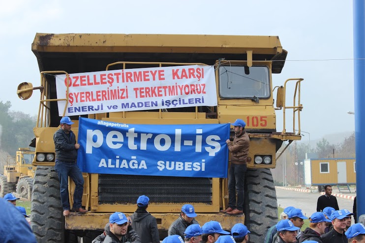 Petrol-İş Sendikası Aliağa şube yönetimi ve Petkim, Tüpraş, Star Rafinerisi, Ravago ve Saybolt çalışanları, 5 Aralık Cuma günü, Yatağan termik santrali ve bu santrale kömür sağlayan maden sahalarının özelleştirmesine karşı direnen enerji ve maden işçilerini ziyaret ettiler.