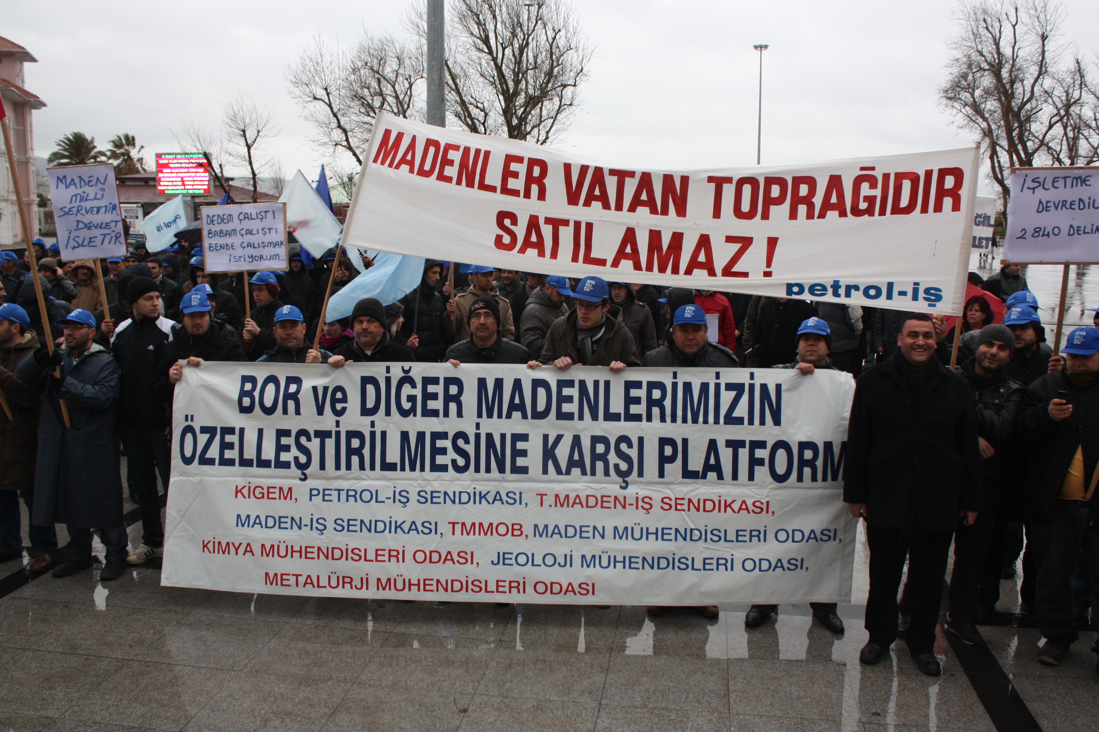 “Aksi takdirde geleceğimiz için, çocuklarımız için, vatanımız ve halkımız için tüm varlığımızla eylem ve protestolarımızı en etkin biçimde kullanmaktan çekinmeyeceğimizi bildiririz. Enerji ve Tabii Kaynaklar Bakanı Taner Yıldız tarafından 05 Mart 2012 tarihindeki Bakanlar Kuruluna sunulan taslağa göre bor madenlerinin özel sektör tarafından işletilmesinin önü açılıyor. 10 Haziran 1983 tarih ve 2840 sayılı Kanun gereğince bor tuzları, uranyum ve toryum madenlerinin aranması ve işletilmesi devlet eliyle yapılmaktadır. Ve bu yetki devlet adına Eti Maden İşletmeleri tarafından kullanılmaktadır. 2840 sayılı Kanunun 2. Maddesine “Bu Madenlerin üretimi ve zenginleştirilmesi, teknik, ticari ve ekonomik sebeplerle, ürünün mülkiyeti teşebbüste kalmak üzere ihale yoluyla üçüncü şahıslara gördürebilirler. Ancak üçüncü şahıslara gördürülecek işlerin ihale süresinin üç yıldan fazla olması durumunda konuya ilişkin talepler Yüksek Planlama Kurulu tarafından karara bağlanır” şeklindeki ifadeyle bu yetkinin özel sektöre devredilmesi amaçlanıyor. Yapılması öngörülen tek maddelik kanun değişikliği ile daha önce pek çok Kamu İktisadi Teşebbüsünün özelleştirilmesine benzer şekilde, mülkiyeti devlette kalmak üzere(!) aldatmacasıyla arama, üretim ve pazarlamanın özel sektöre devri isteniyor. Değişikliğin gerekçesi şu ifadelerle Bakanlar Kuruluna sunuldu: