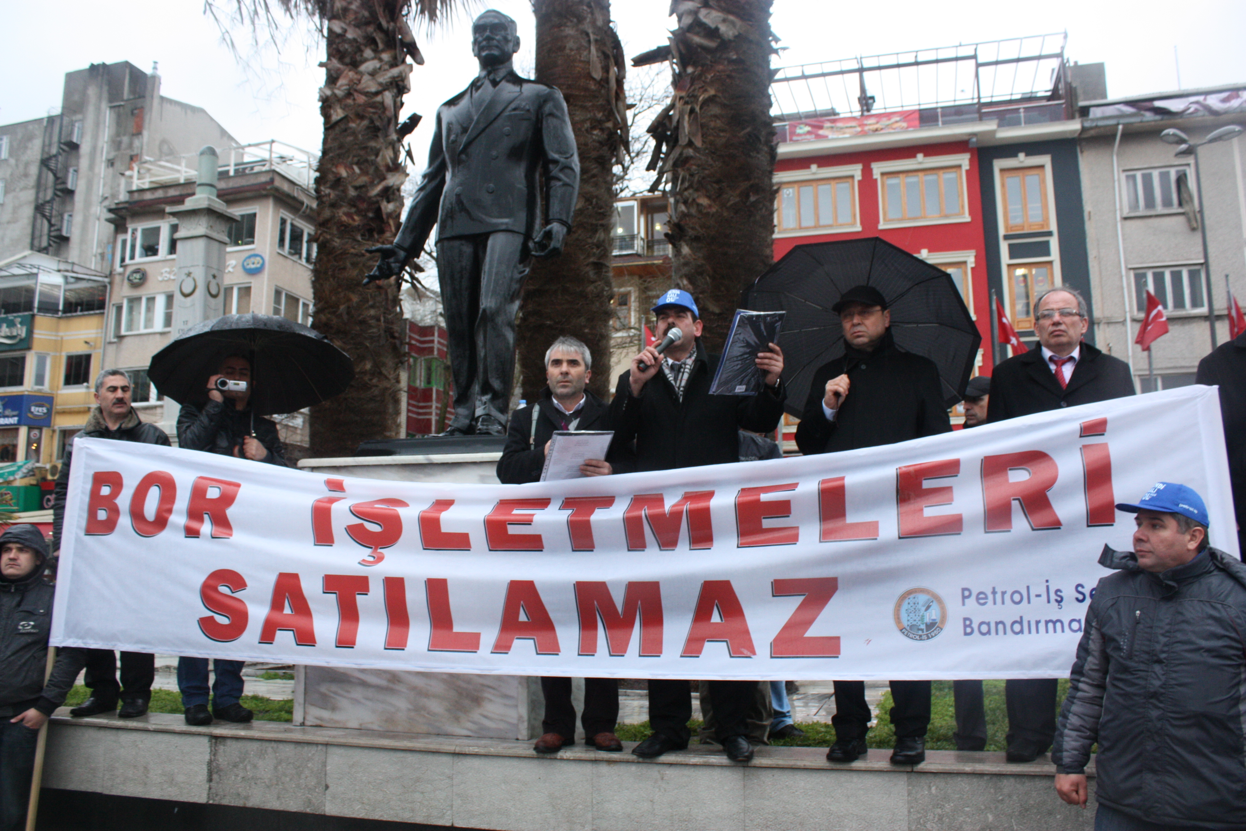 Borların özelleştirilmesine karşı Bandırma şubemizin 12 Mart’ta Bandırma Cumhuriyet Meydanı’nda düzenlediği protesto eylemine katılan Genel Başkanımız Mustafa Öztaşkın, “Bundan 11 yıl önce yine bu meydanda miting yaparak bor madenlerinin özelleştirilmesine karşı mücadele başlatmış ve “Borlar özelleştirilemez” diye haykırmıştık. O haykırışımız, bütün Türkiye kamuoyunda, toplumda yankı bulmuş, sizlerin mücadelesiyle borlar özelleştirme kapsamından çıkartılmıştı. Borların özelleştirilmesine karşı yine aynı meydanda meşaleyi yaktık” dedi.