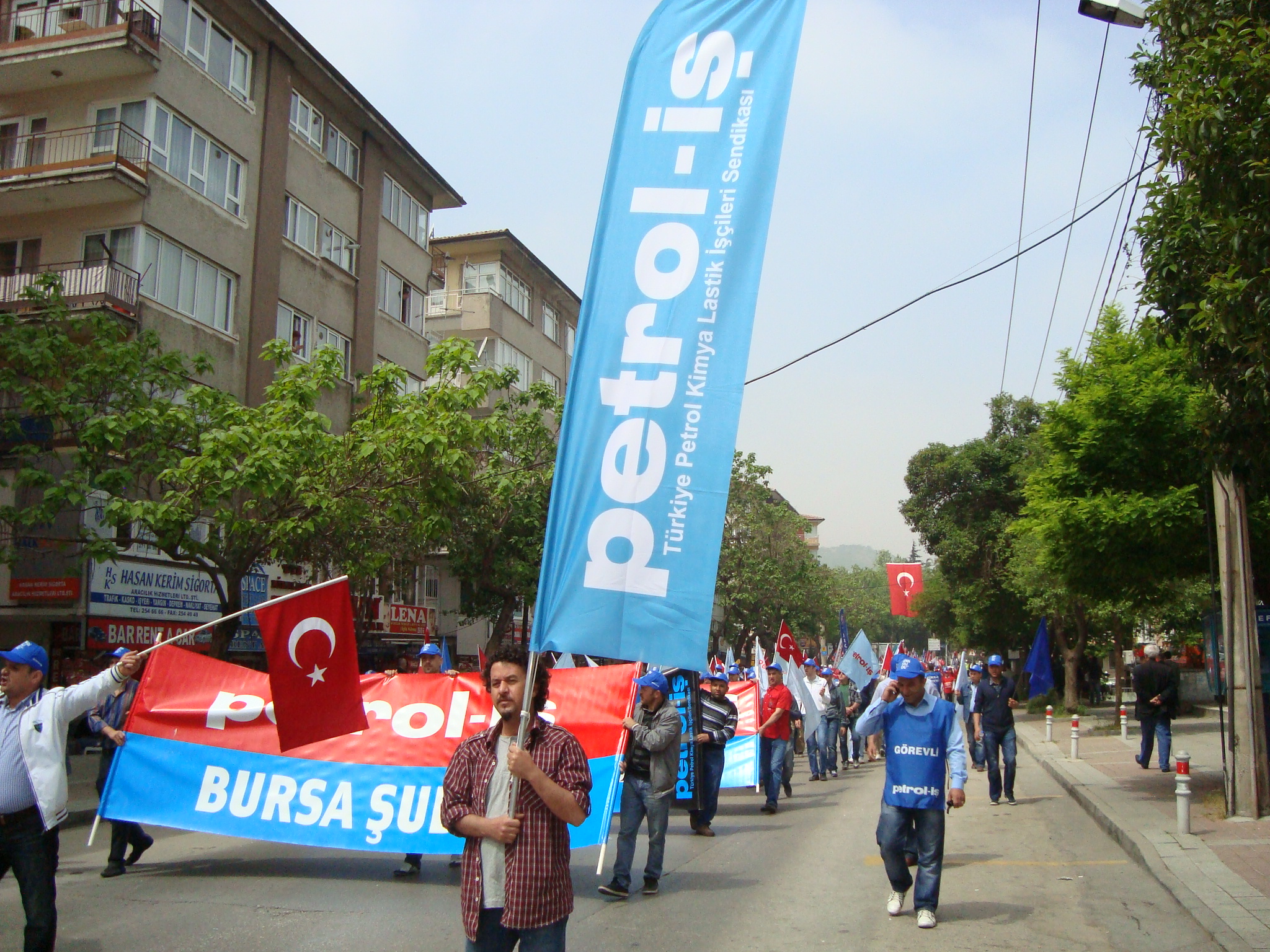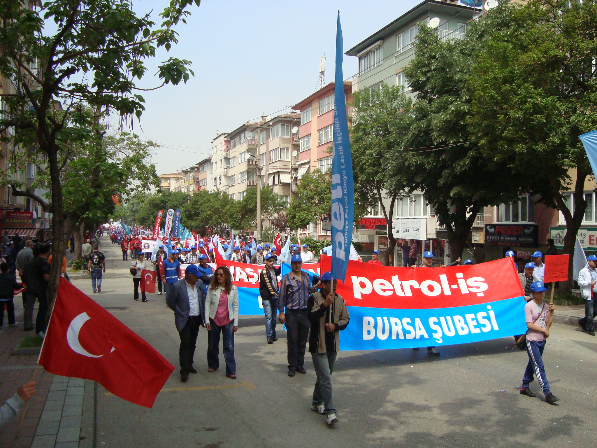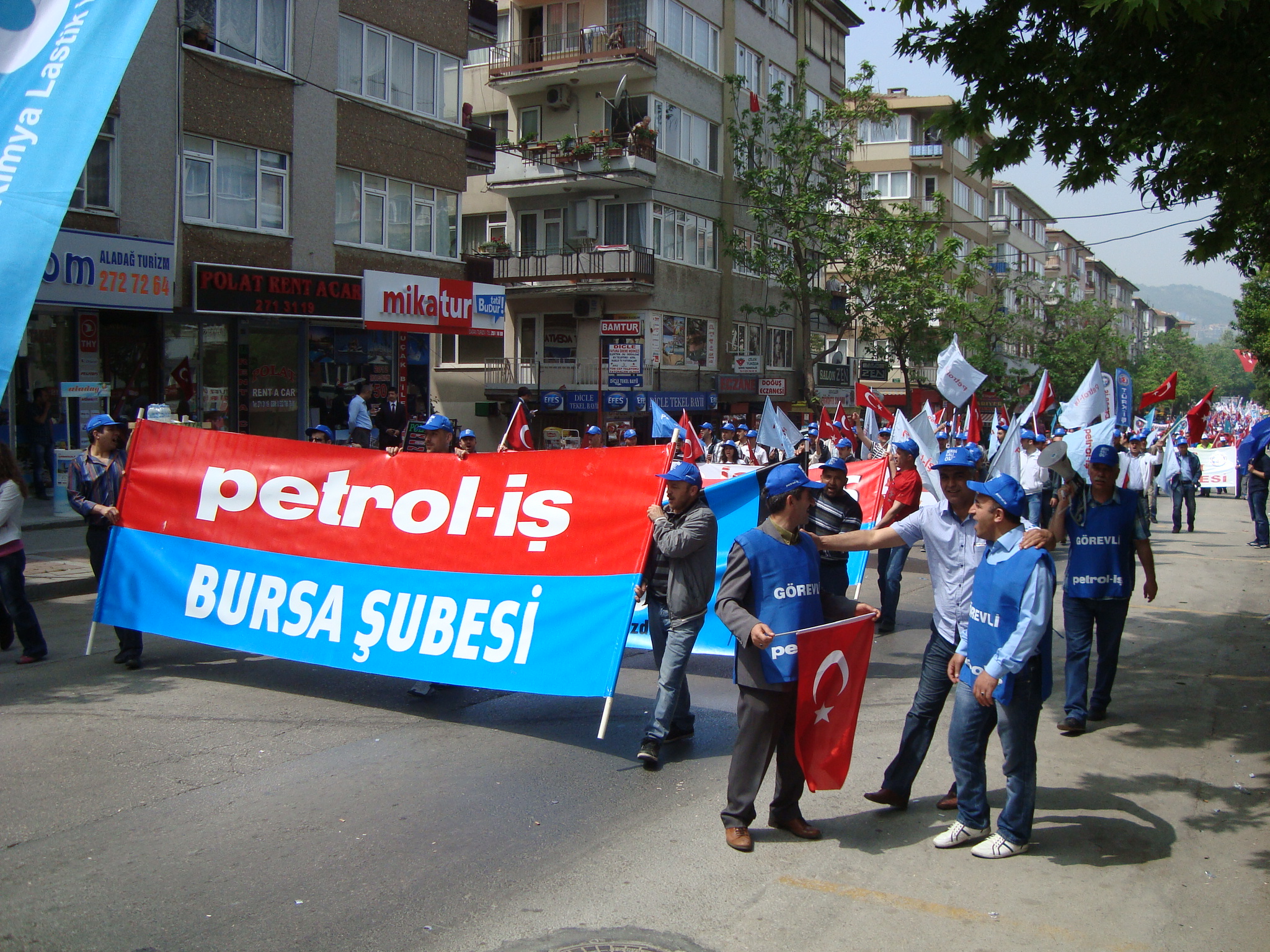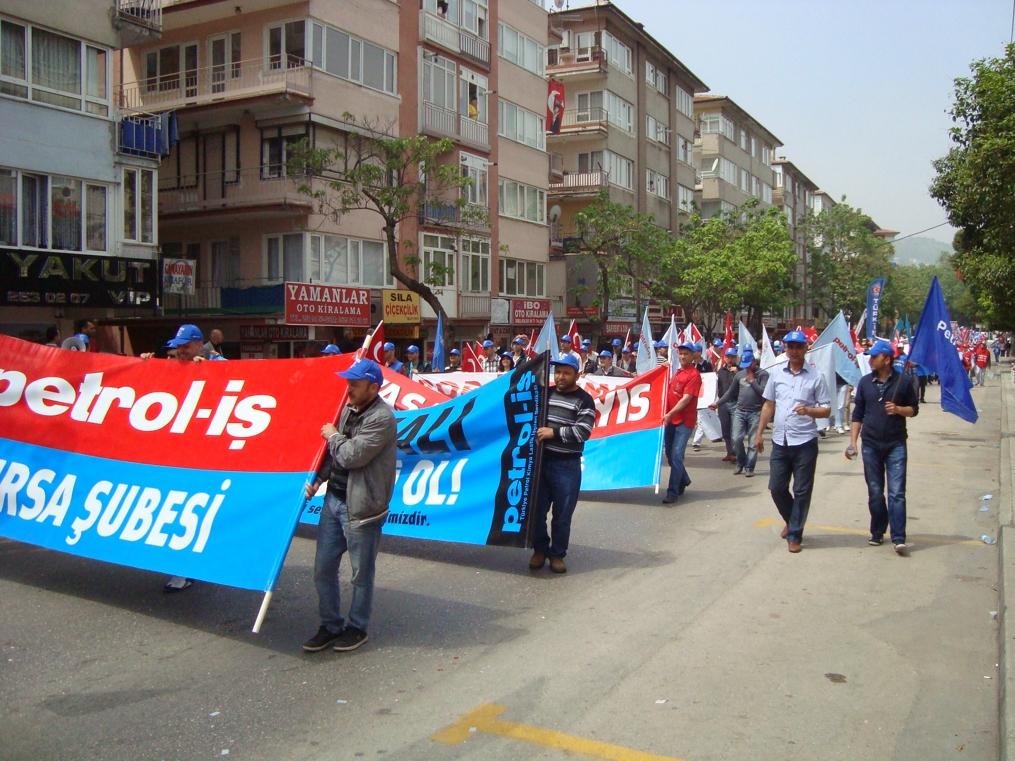 Petrol- İş Sendikası Bursa Şubesi 1 Mayıs işçi, emekçi bayramını coşkuyla kutladı. Orhangazi Polifleks, Gemlik Gübre’den, Botaş ve Rietter Erkut işyerlerinden gelen üyelerimiz, 1 Mayıs sabahı saat 10.30’da Bursa Stadyumu karşısında toplanarak kortejdeki yerlerini aldılar. Petrol-İş Bursa Şubesi üyeleri kent meydanındaki 1 Mayıs alanına yürüyerek, kutlamaya katıldılar.