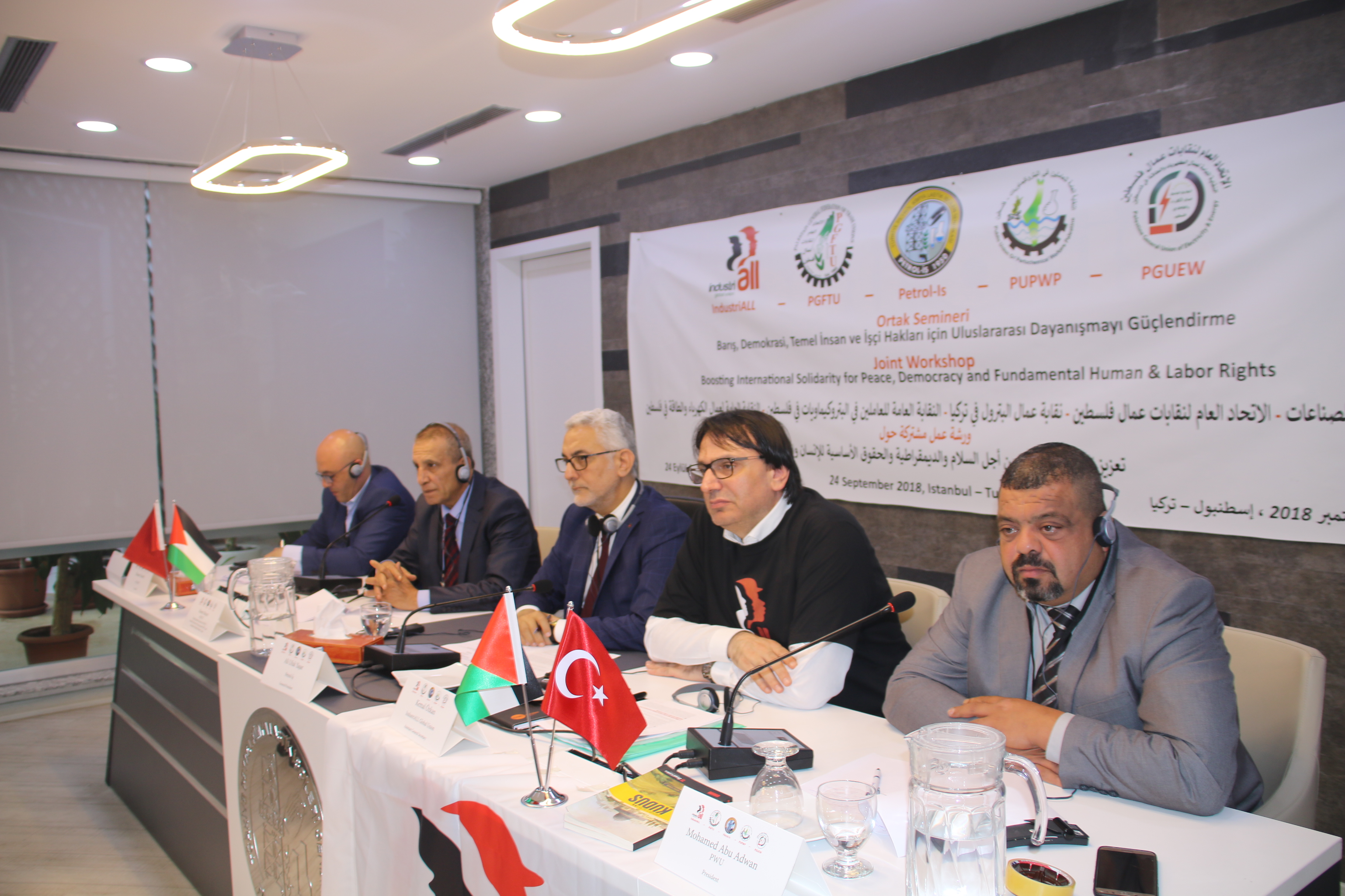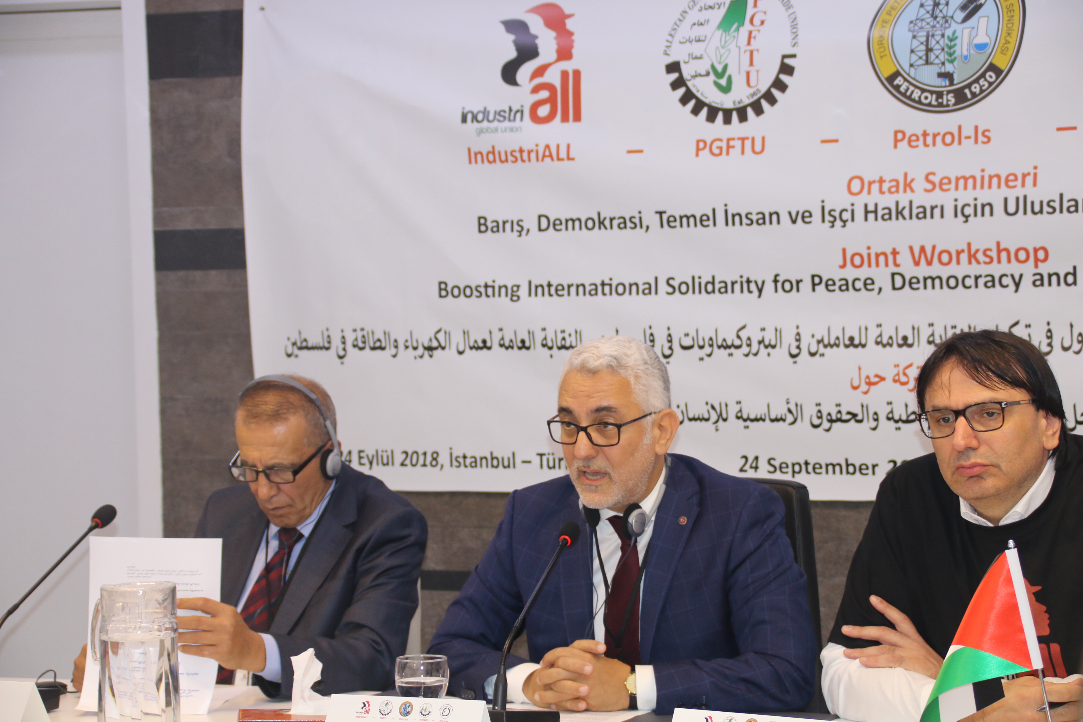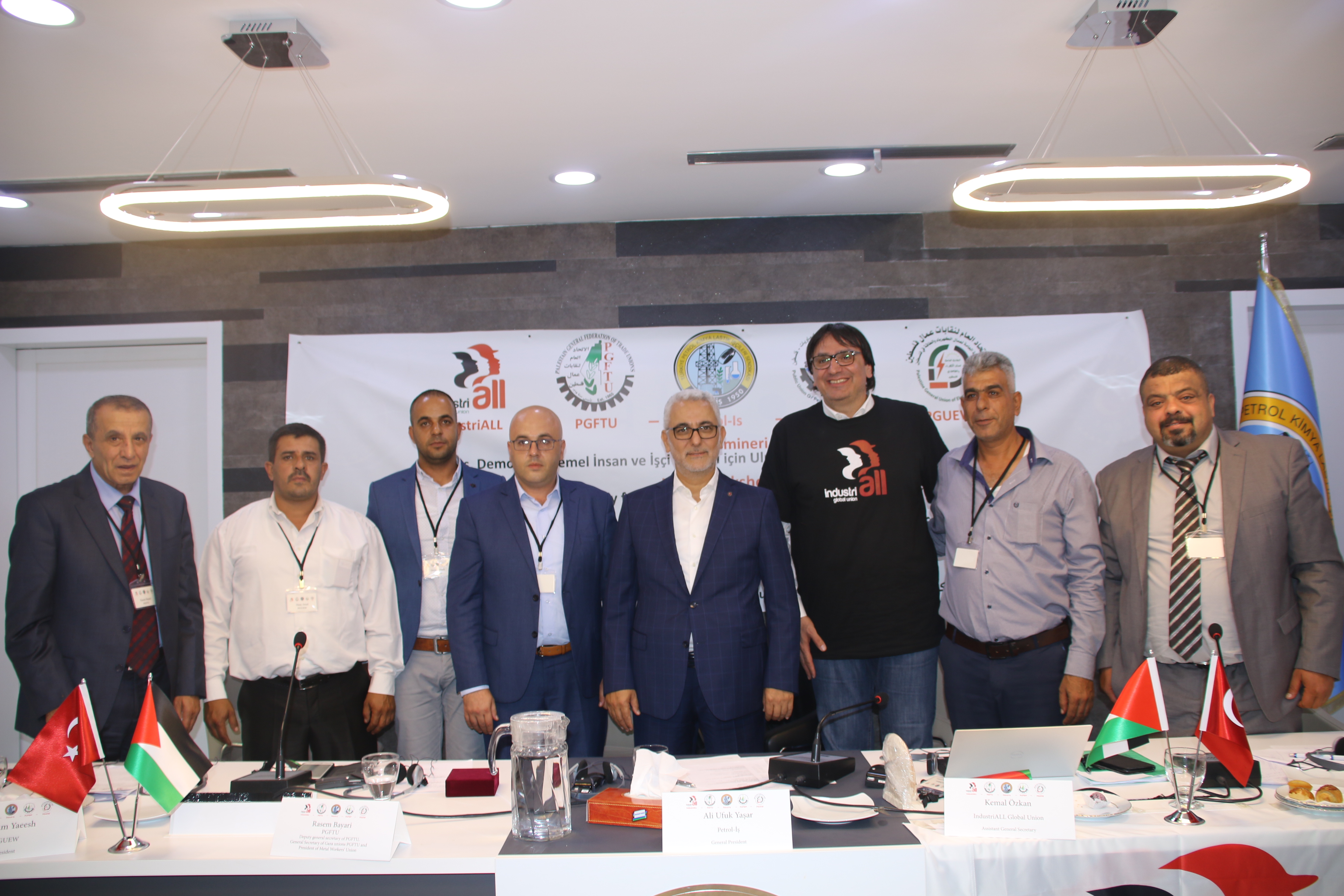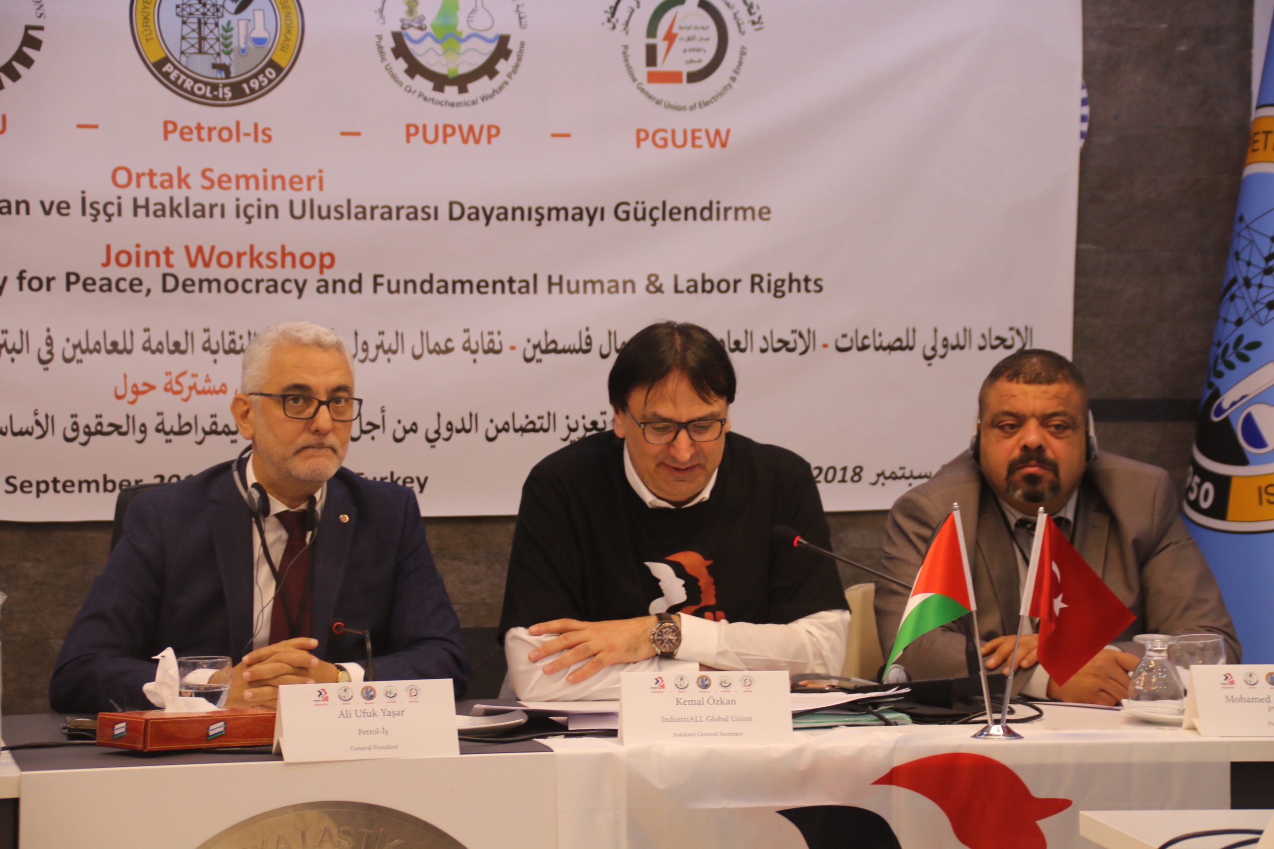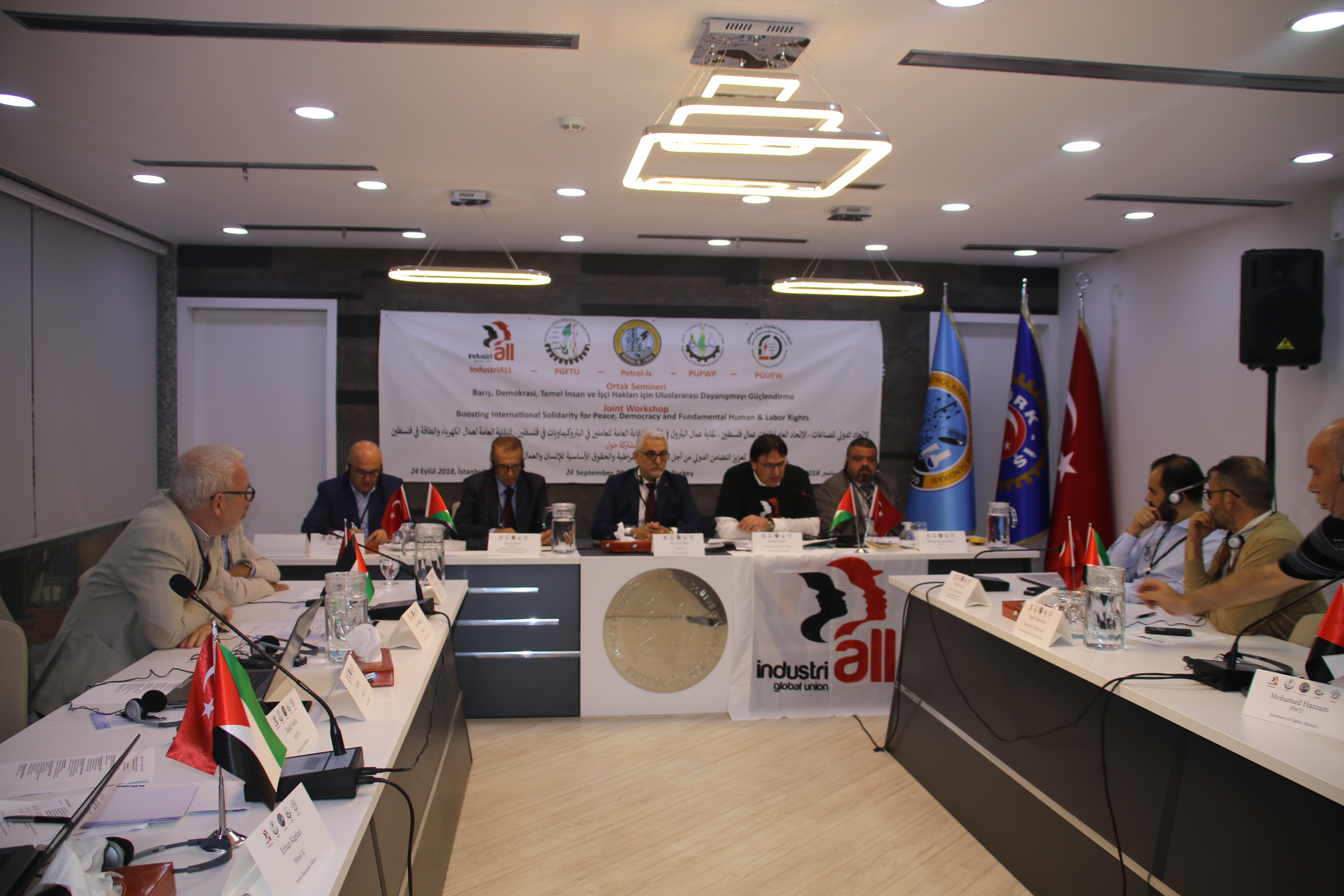 Sendikamızın son olarak 26 Mart tarihinde Filistin’e yaptığı ziyaretin ardından Filistin Sendikaları ile dayanışma ve işbirliği süreci devam ediyor. Bugün (24 Eylül 2018), Filistin halkı ve sendikaları ile varolan ilişkileri daha da ilerletmek için Petrol-İş Genel Merkezinde “Barış, Demokrasi, Temel İnsan ve İşçi Hakları İçin Uluslararası Dayanışmayı Güçlendirme Semineri” yapıldı.
