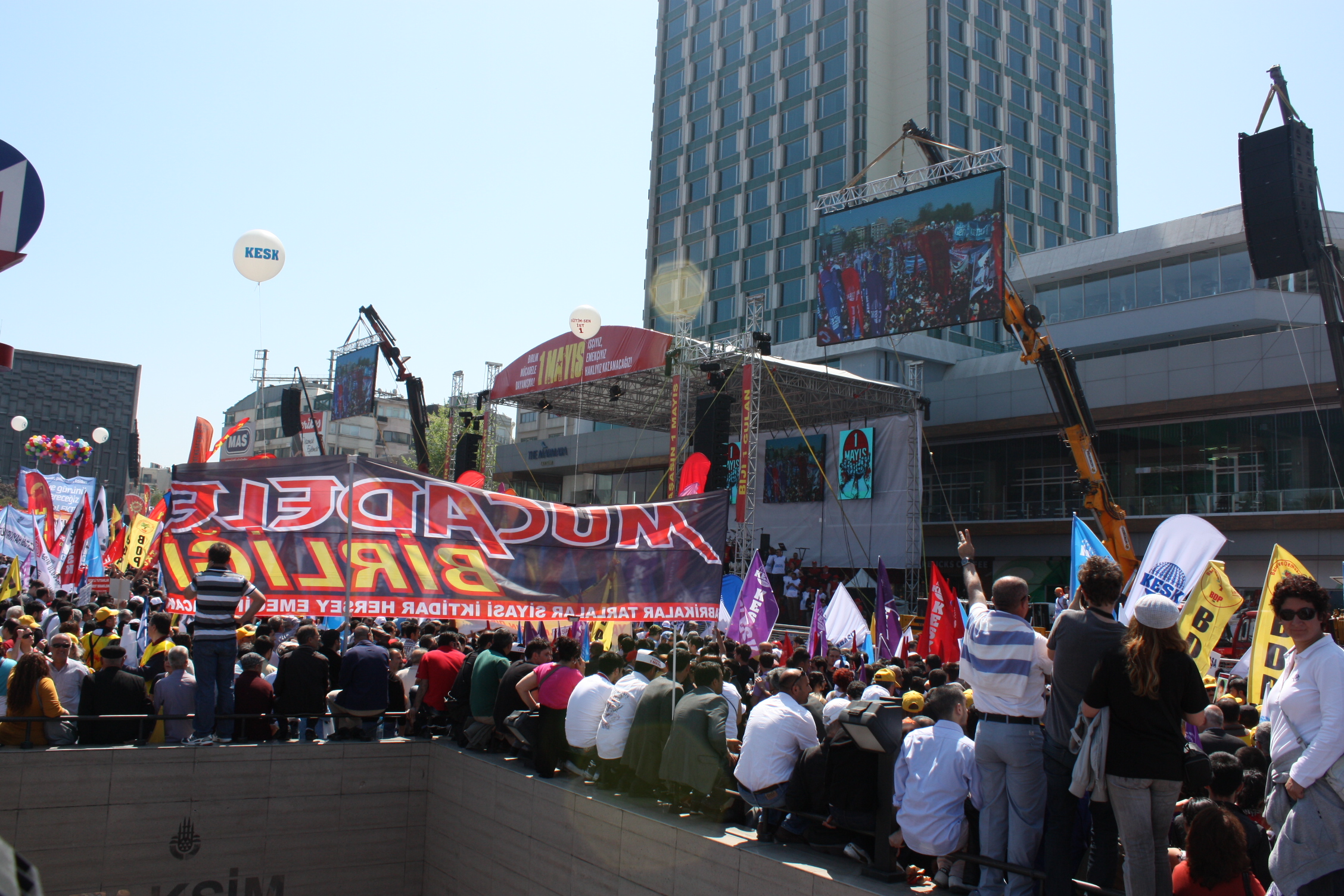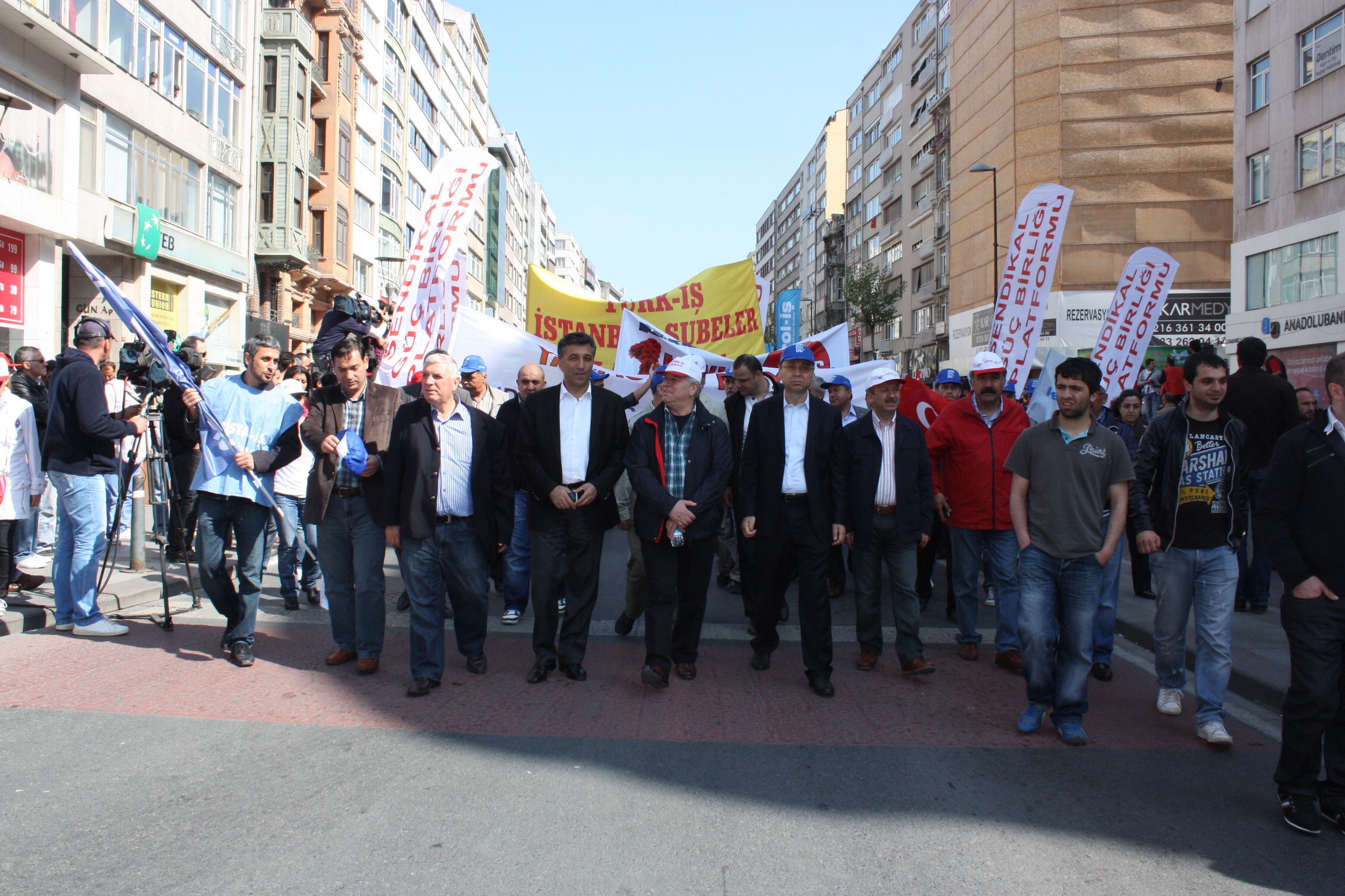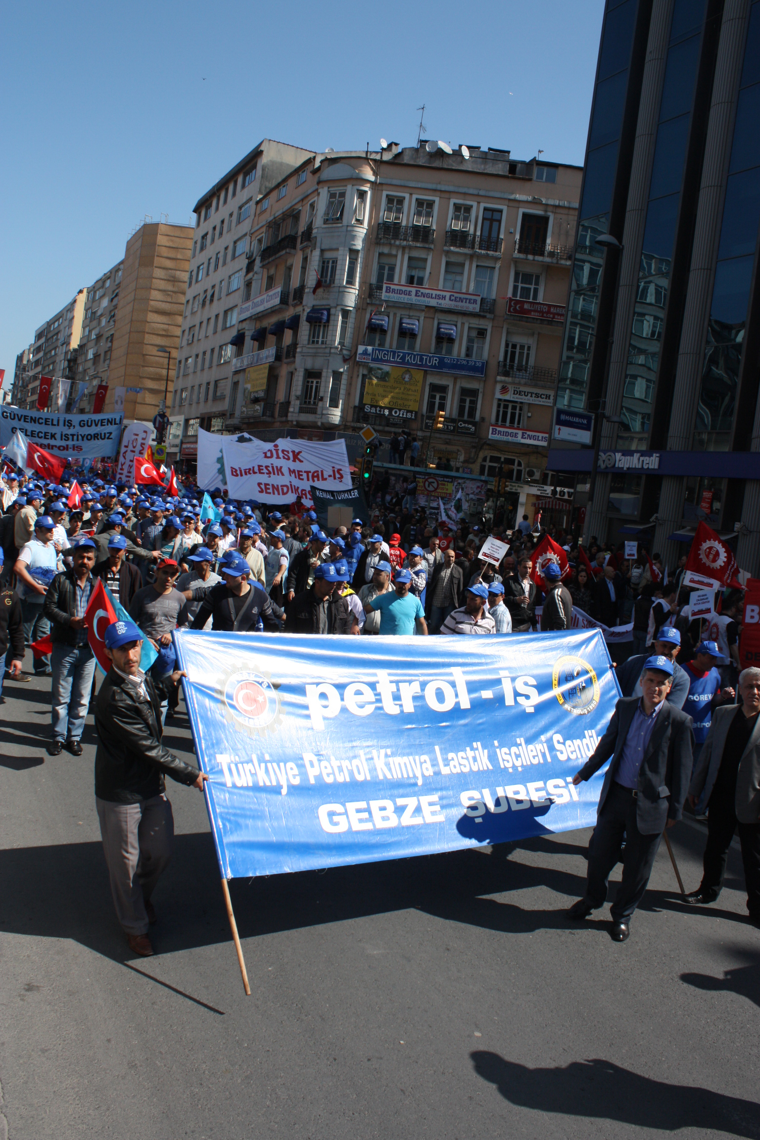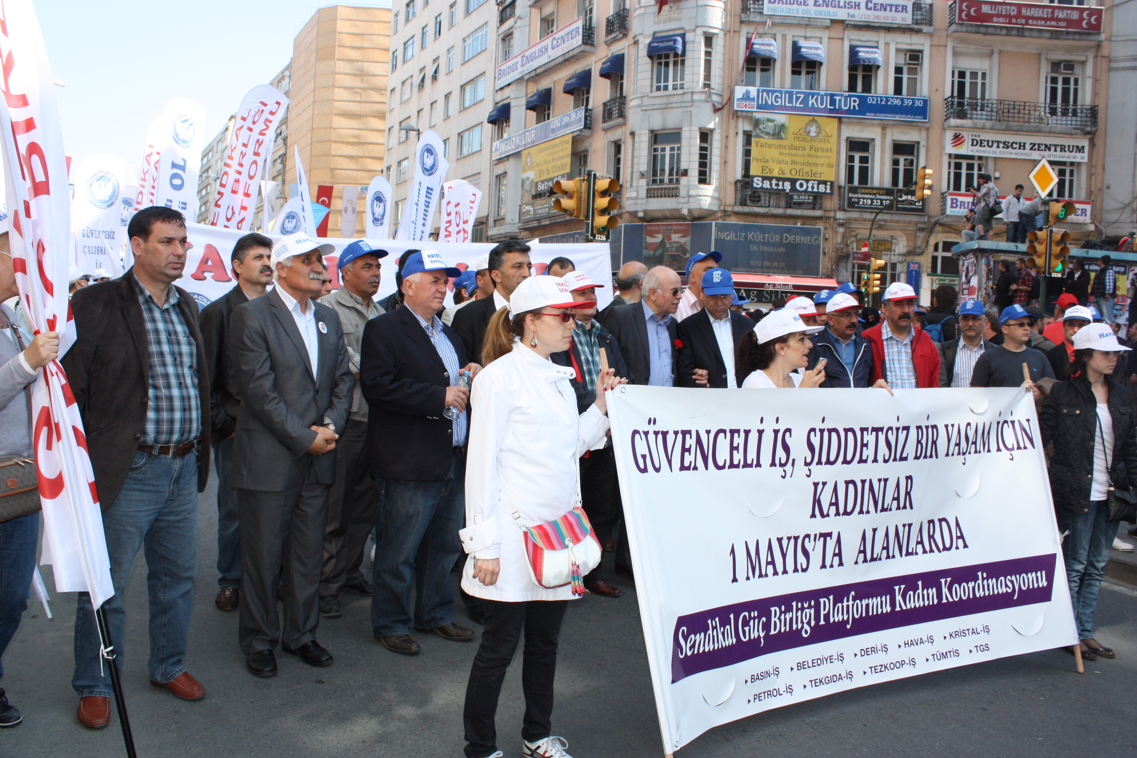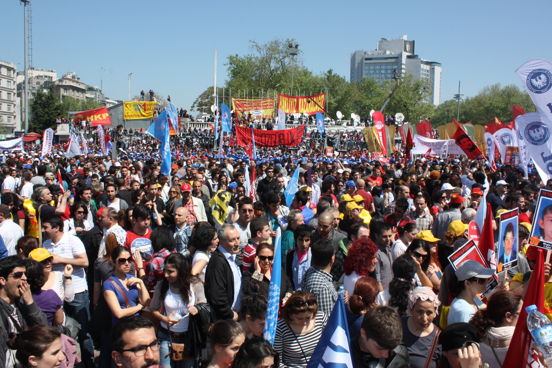 “Yeni Saldırı Politiklarına Hayır”, “ Güvenceli İş, Güvenli Gelecek İstiyoruz” şiarıyla Taksim 1 Mayıs alanına yürüyen kitleler, “Adaletsizliğe, hukuksuzluğa, tutuklamalara, emperyalizme, kapitalizme, özelleştirmelere, taşeronlaşmaya, güvencesizliğe, zamlara karşı birleşerek kazanacağız” dediler ve AKP’nin politikalarını protesto ettiler. Sendikalar, “ Kıdem tazmintına uzanan eller kırılsın”, “Çocuklarımızın geleceğini kararttırmayacağız” pankartlarını açtılar.