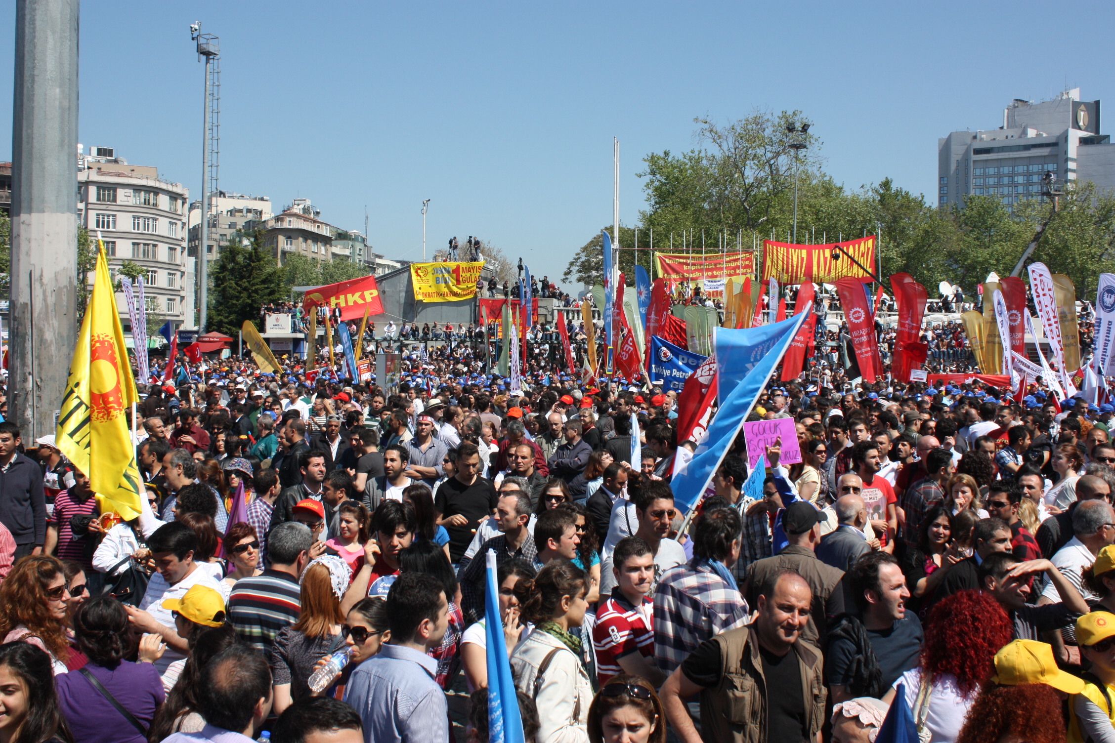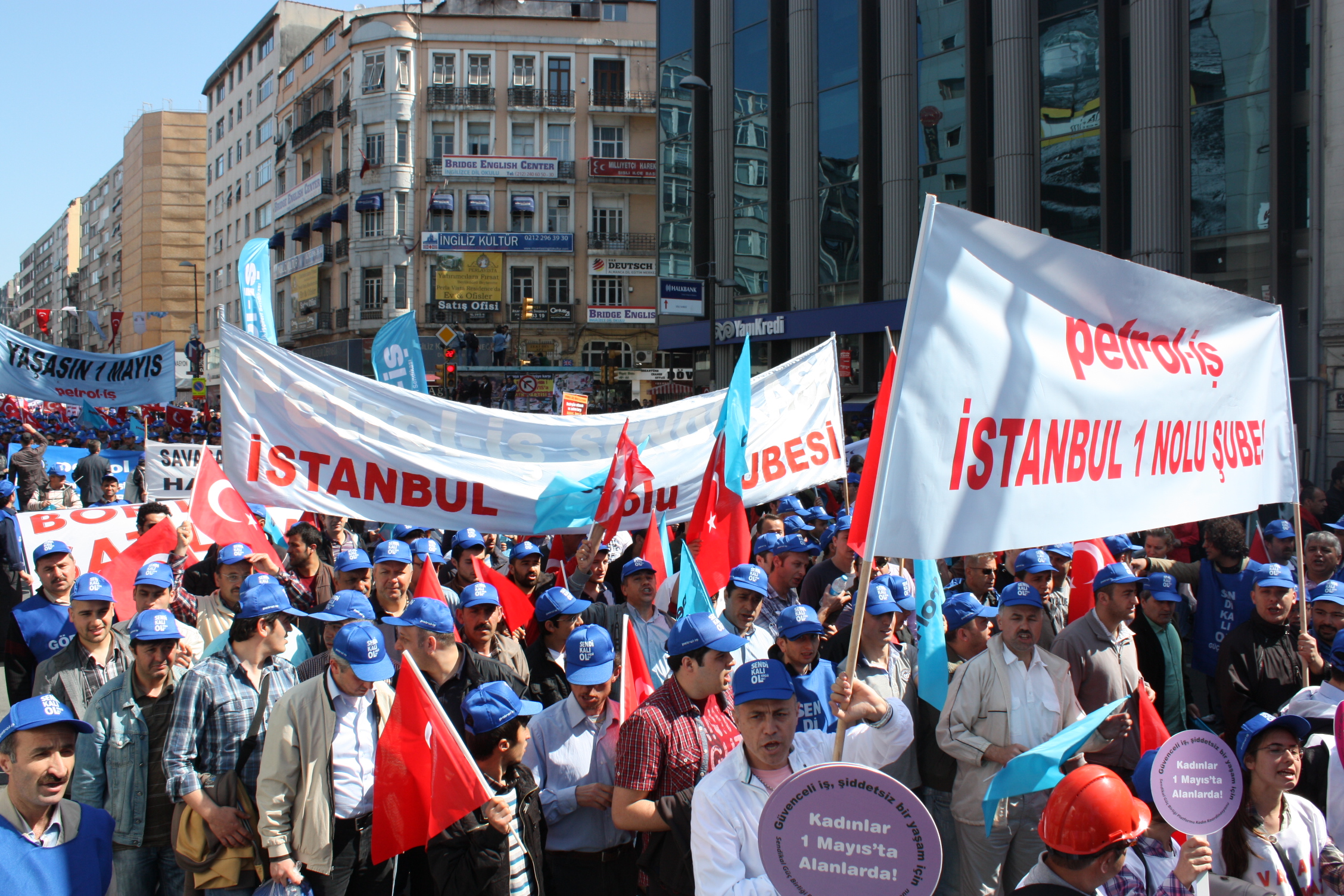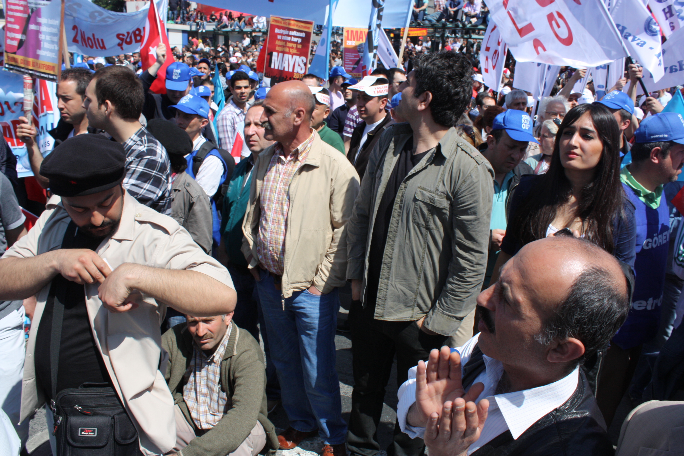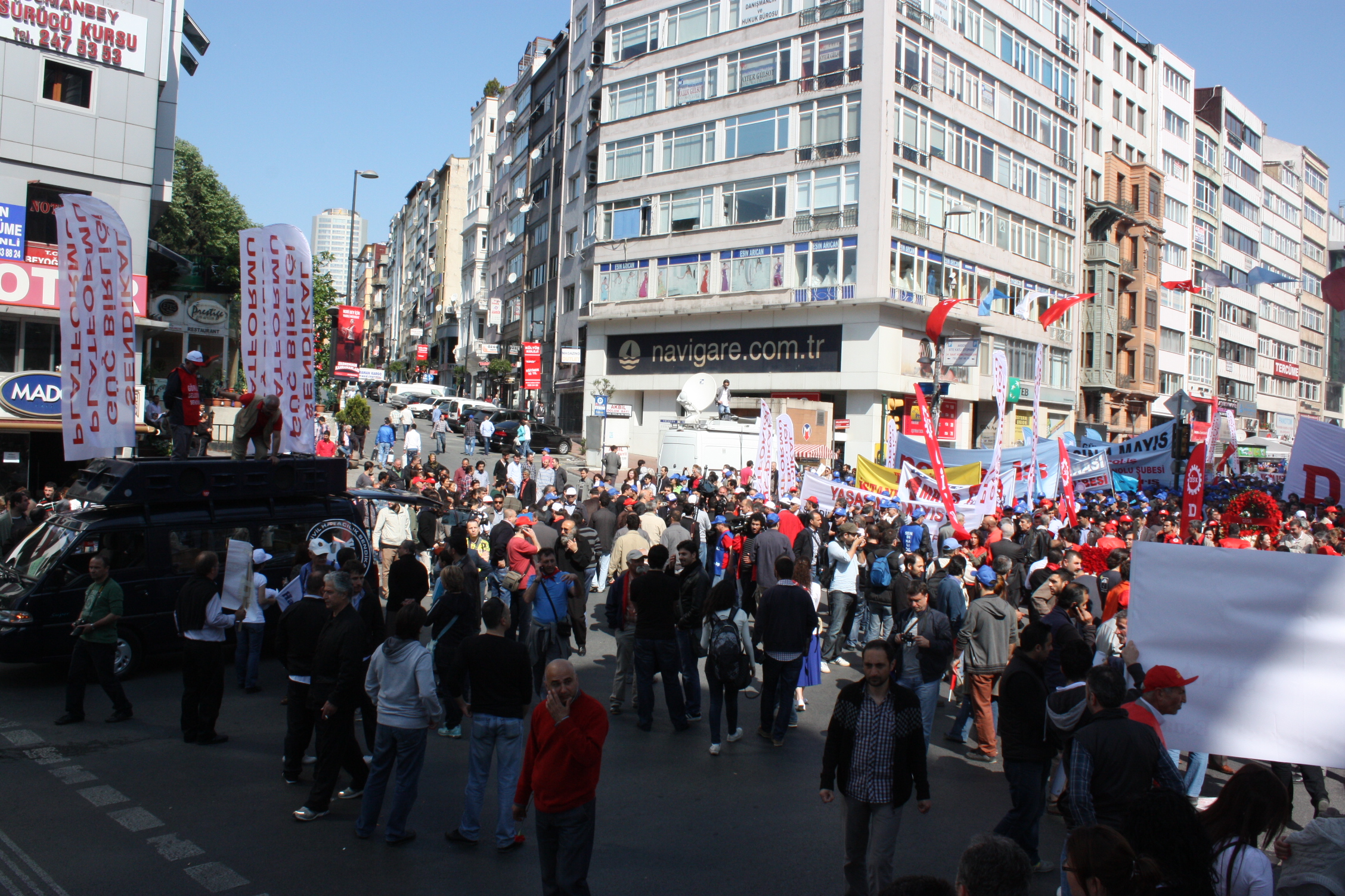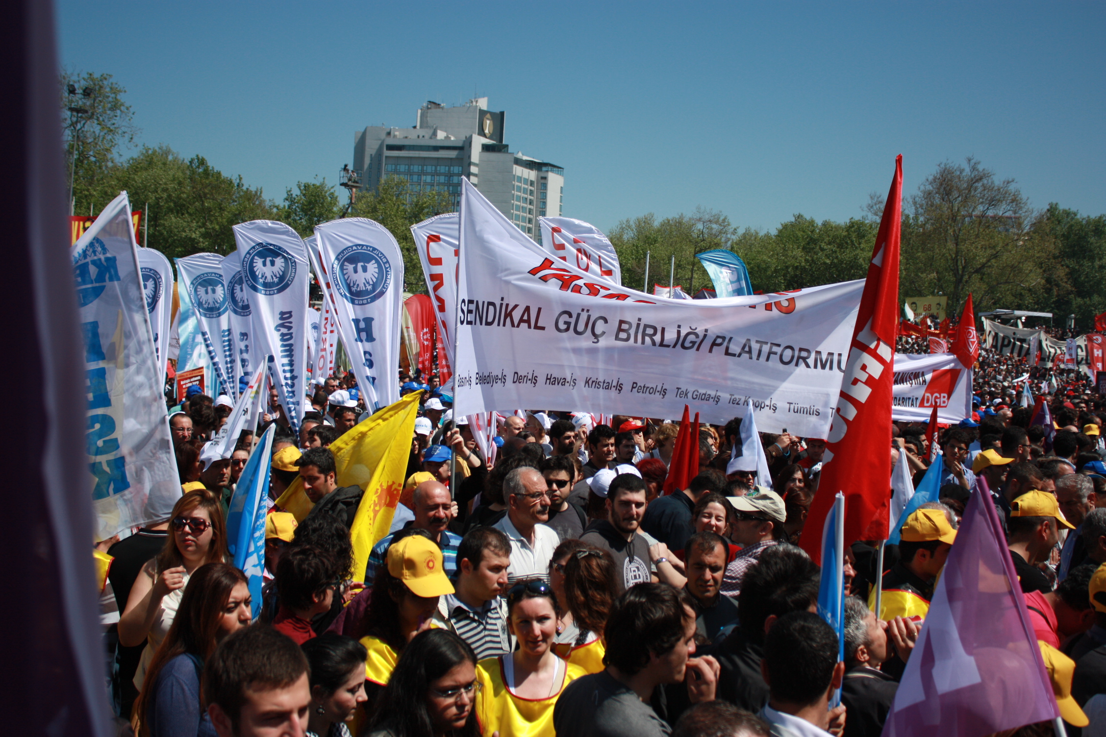 “Yeni Saldırı Politiklarına Hayır”, “ Güvenceli İş, Güvenli Gelecek İstiyoruz” şiarıyla Taksim 1 Mayıs alanına yürüyen kitleler, “Adaletsizliğe, hukuksuzluğa, tutuklamalara, emperyalizme, kapitalizme, özelleştirmelere, taşeronlaşmaya, güvencesizliğe, zamlara karşı birleşerek kazanacağız” dediler ve AKP’nin politikalarını protesto ettiler. Sendikalar, “ Kıdem tazmintına uzanan eller kırılsın”, “Çocuklarımızın geleceğini kararttırmayacağız” pankartlarını açtılar.