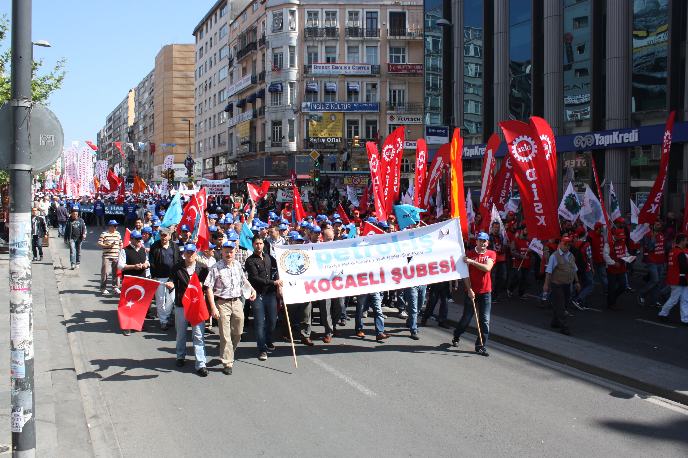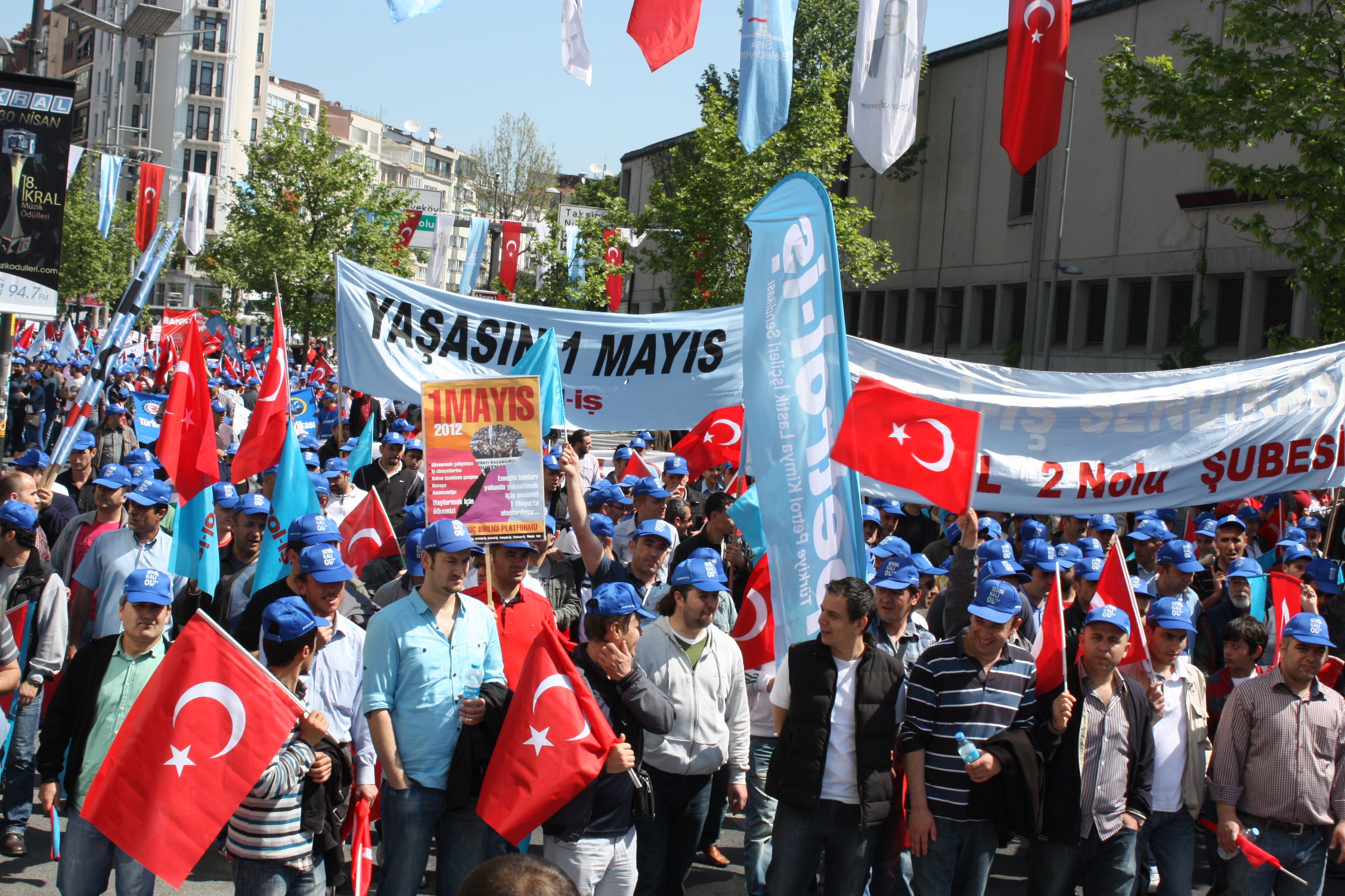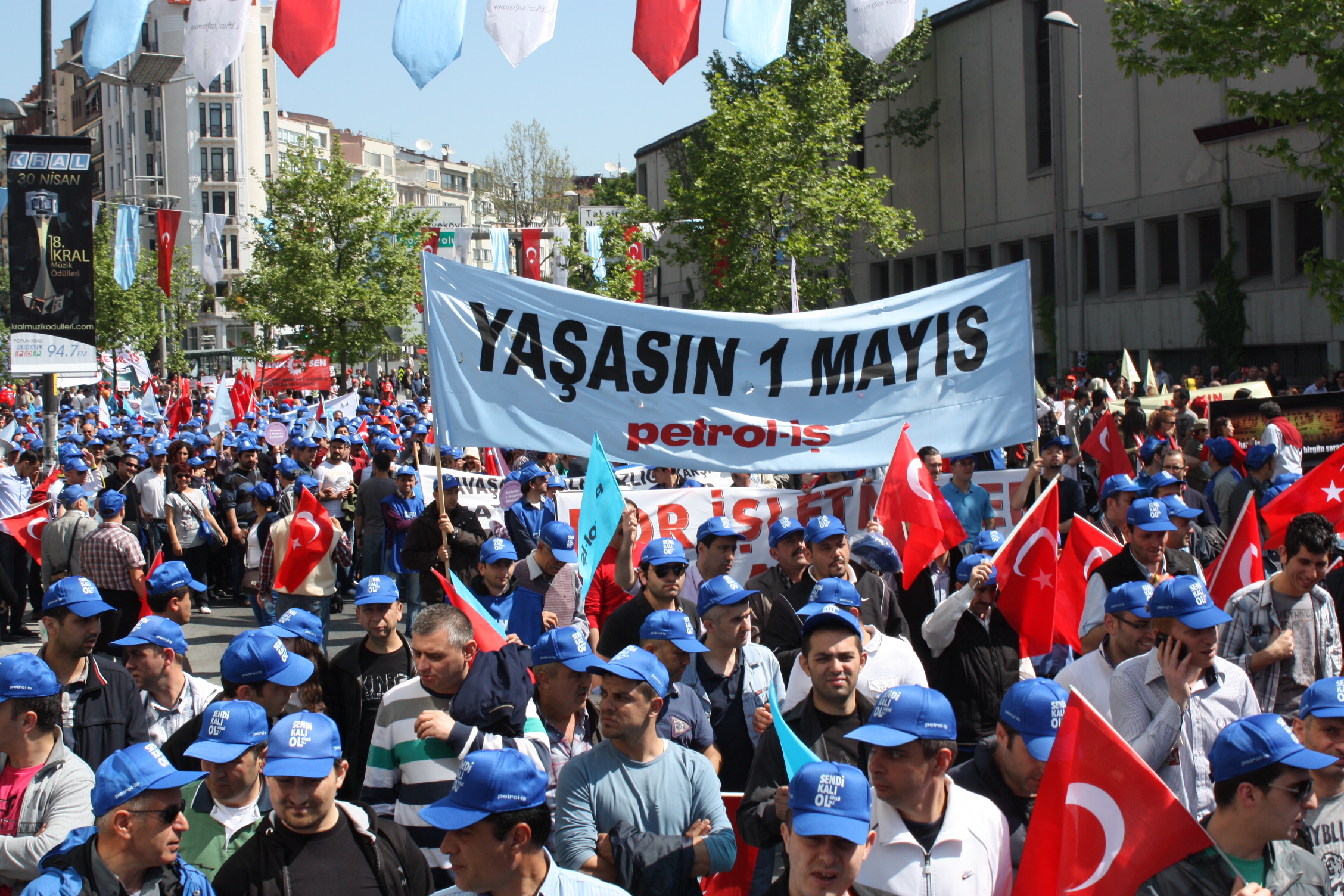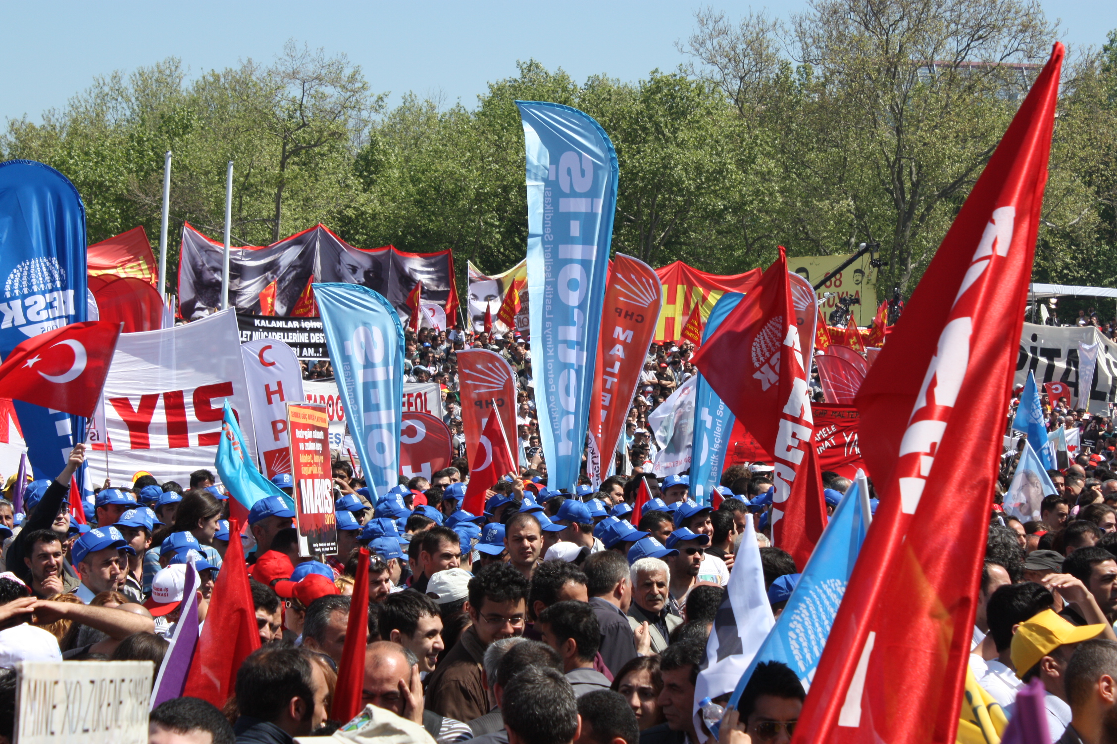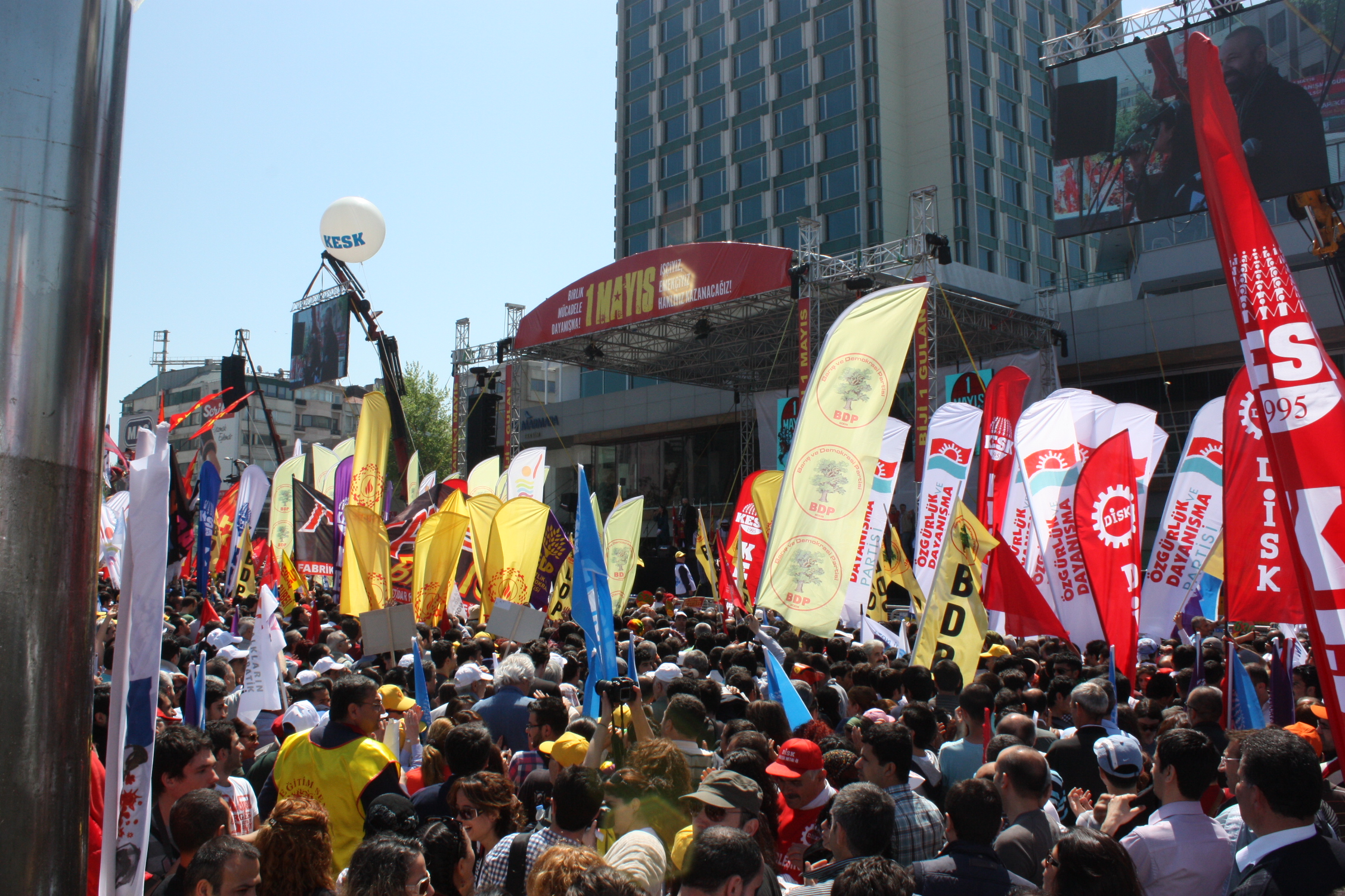 “Yeni Saldırı Politiklarına Hayır”, “ Güvenceli İş, Güvenli Gelecek İstiyoruz” şiarıyla Taksim 1 Mayıs alanına yürüyen kitleler, “Adaletsizliğe, hukuksuzluğa, tutuklamalara, emperyalizme, kapitalizme, özelleştirmelere, taşeronlaşmaya, güvencesizliğe, zamlara karşı birleşerek kazanacağız” dediler ve AKP’nin politikalarını protesto ettiler. Sendikalar, “ Kıdem tazmintına uzanan eller kırılsın”, “Çocuklarımızın geleceğini kararttırmayacağız” pankartlarını açtılar.