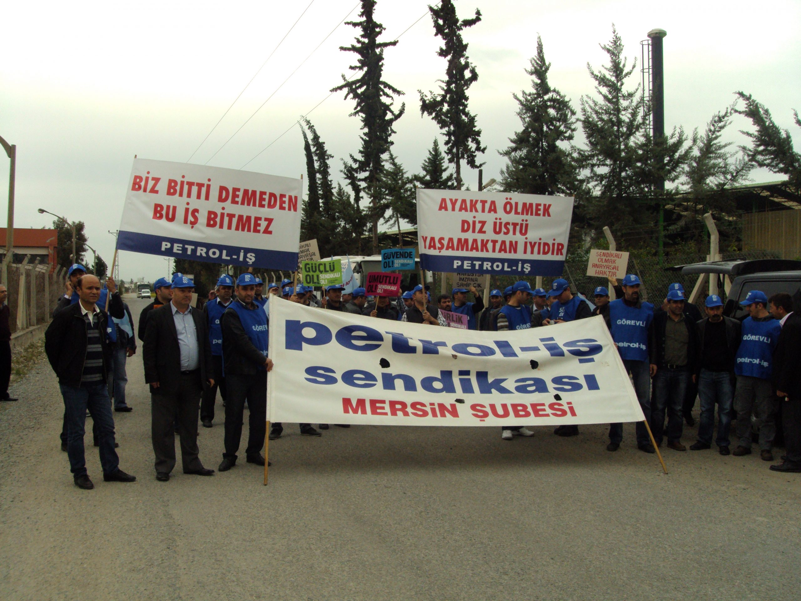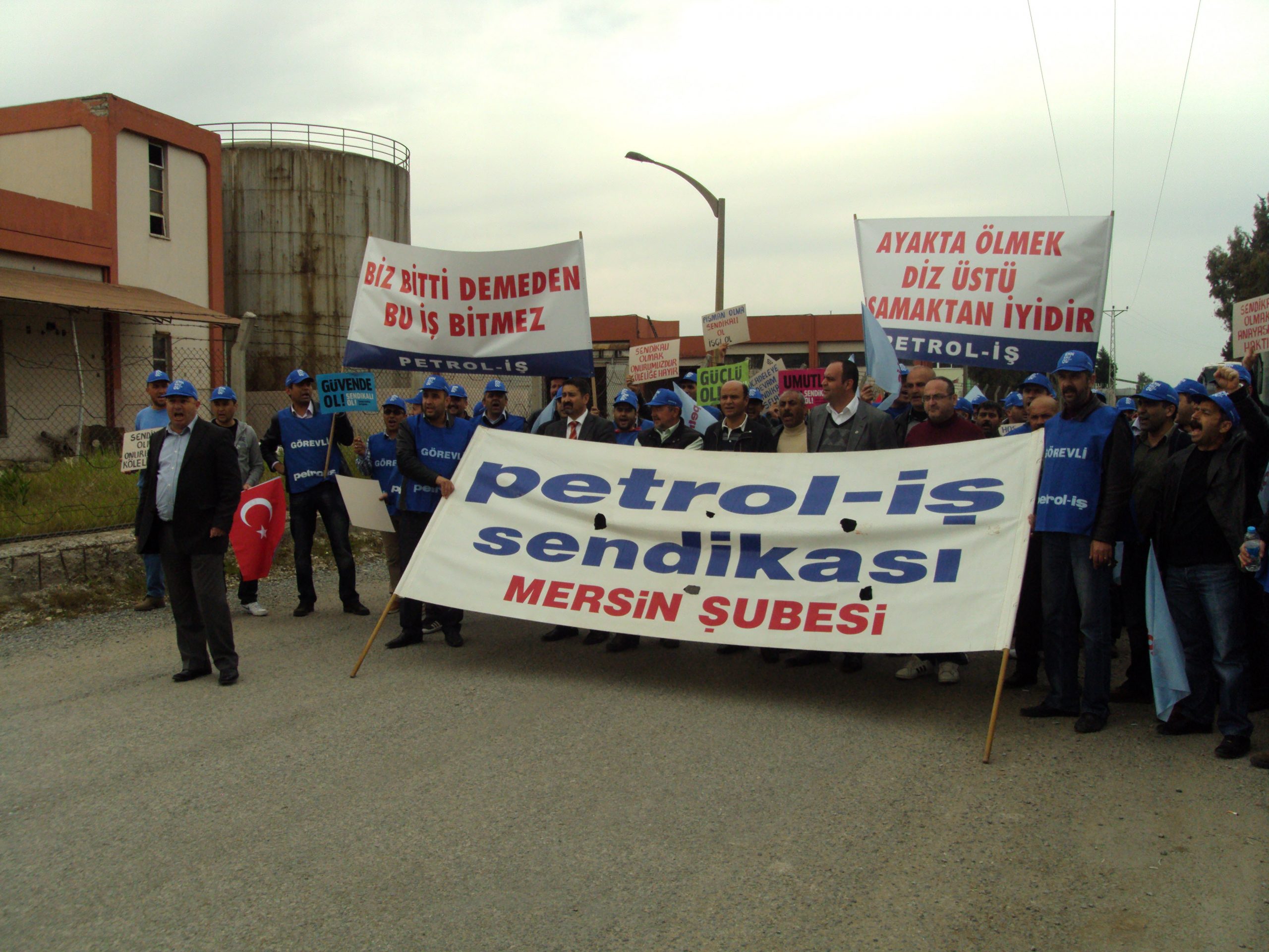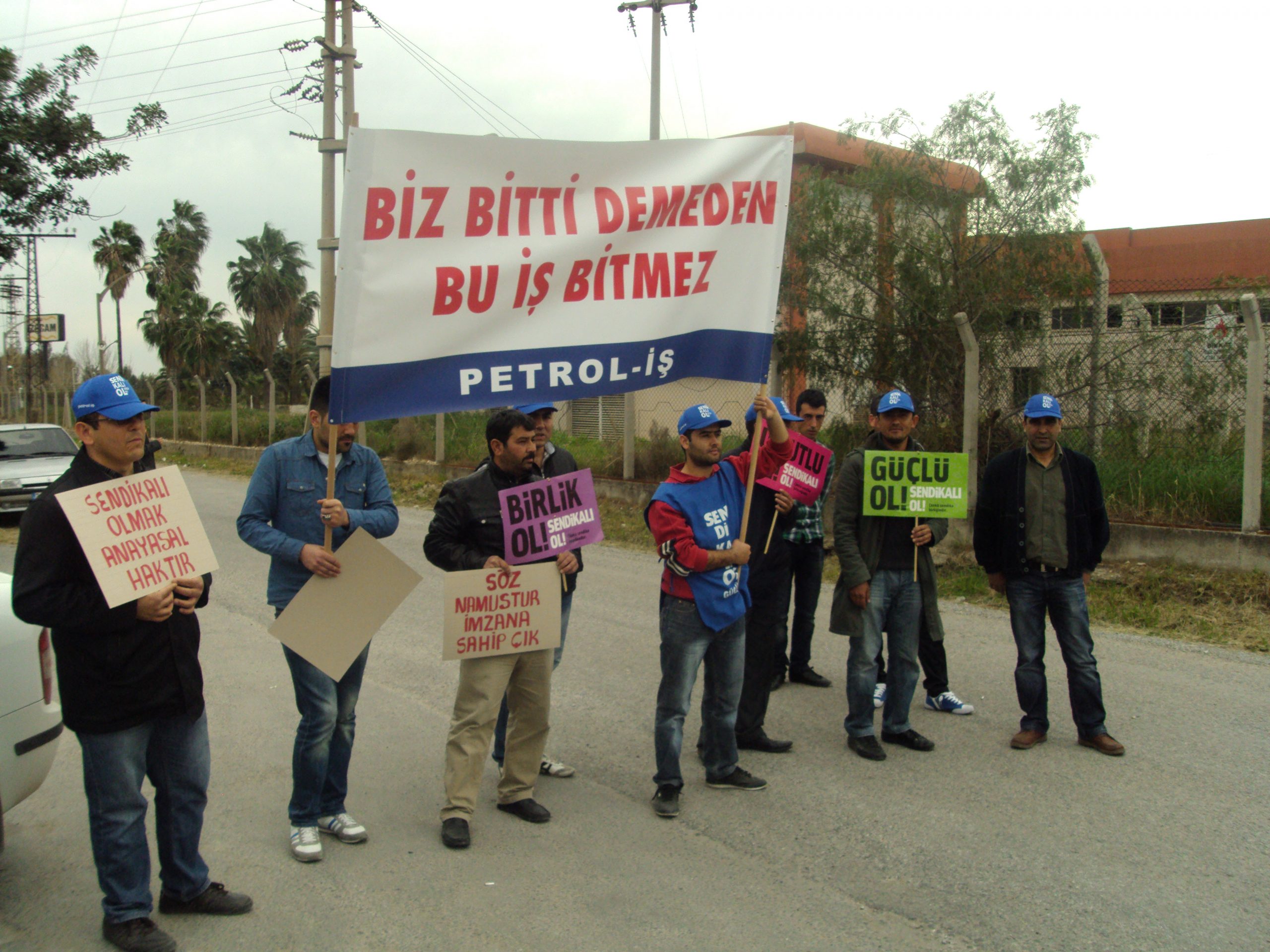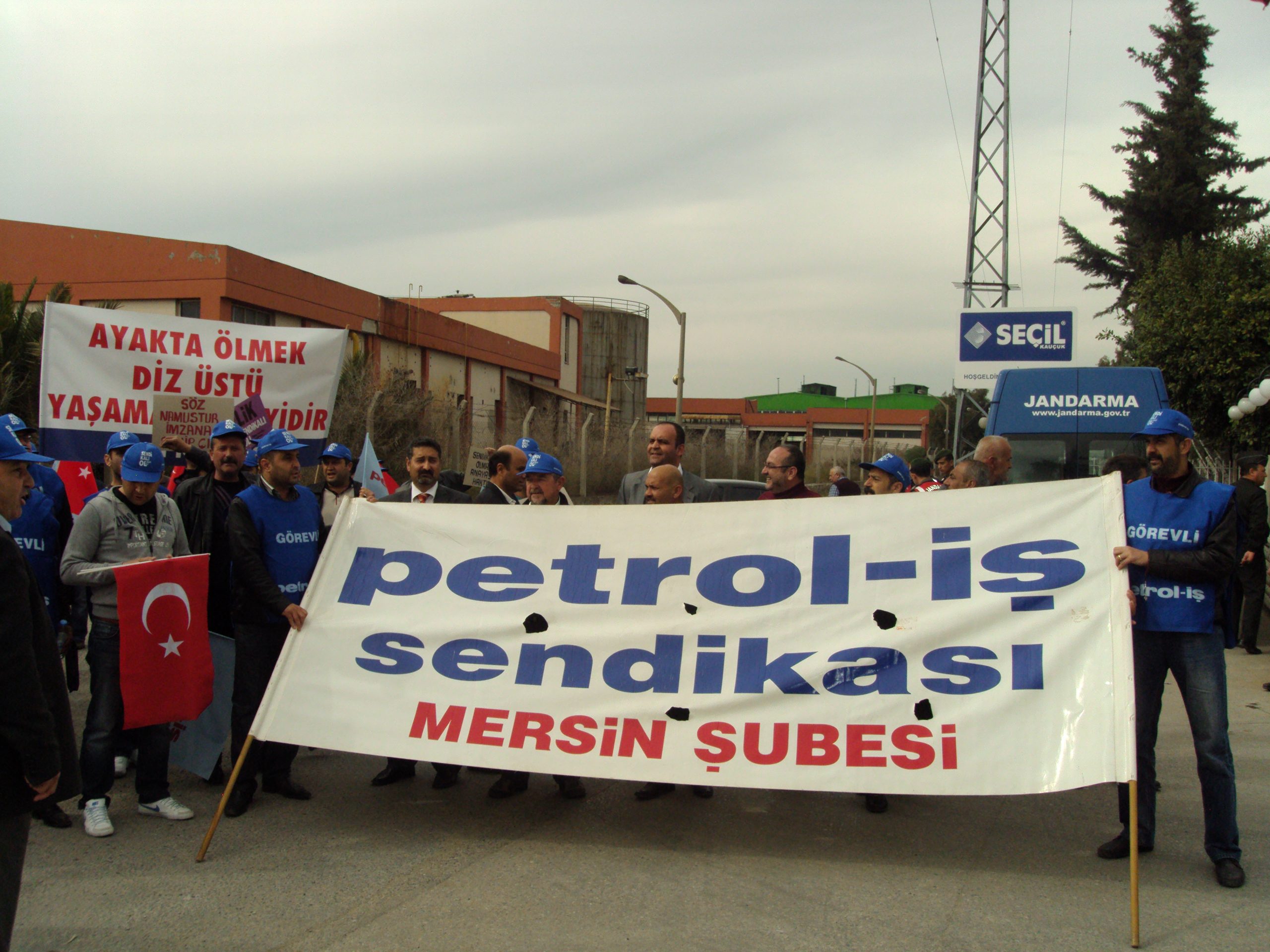 Mersin Şubemiz 26 Mart tarihinde Türk-İş’e bağlı sendika başkanları işyeri temsilcileri ve yöneticileri ile birlikte işten atılmaları protesto amacıyla bir basın açıklaması yaptı. Basın açıklamasını okuyan Mersin Şube Başkanımız Murat Marangoz, Seçil Kauçuk işçilerinin ağır çalışma koşullarına değindikten sonra şöyle dedi:“12-13 yıllık işçilere asgari ücret veriliyor. Patronun kârı büyürken işçiler hacizcilerin eline düşmüştür. İşveren üye olan arkadaşlarımızı işten çıkarmanın yanı sıra içerde çalışan arkadaşlarımıza mobbing uygulamakta ve onları tehdit ederek sindirmeye çalışmaktadır.” Konuyla ilgili savcılığa suç duyurusunda bulunduklarını bildiren Marangoz, işverenin tüm yıldırma taktiklerine rağmen Petrol-İş’in işyerine gireceğini sözlerine ekleyerek: ”