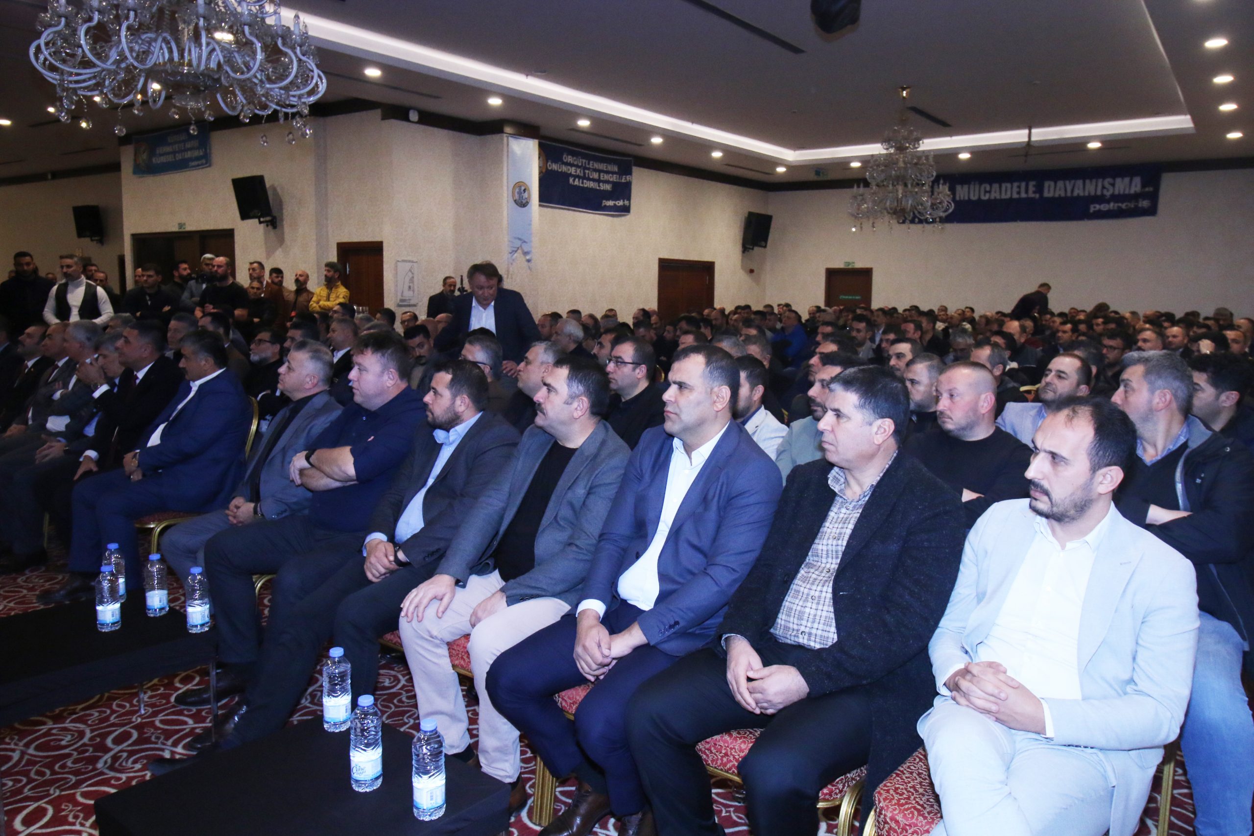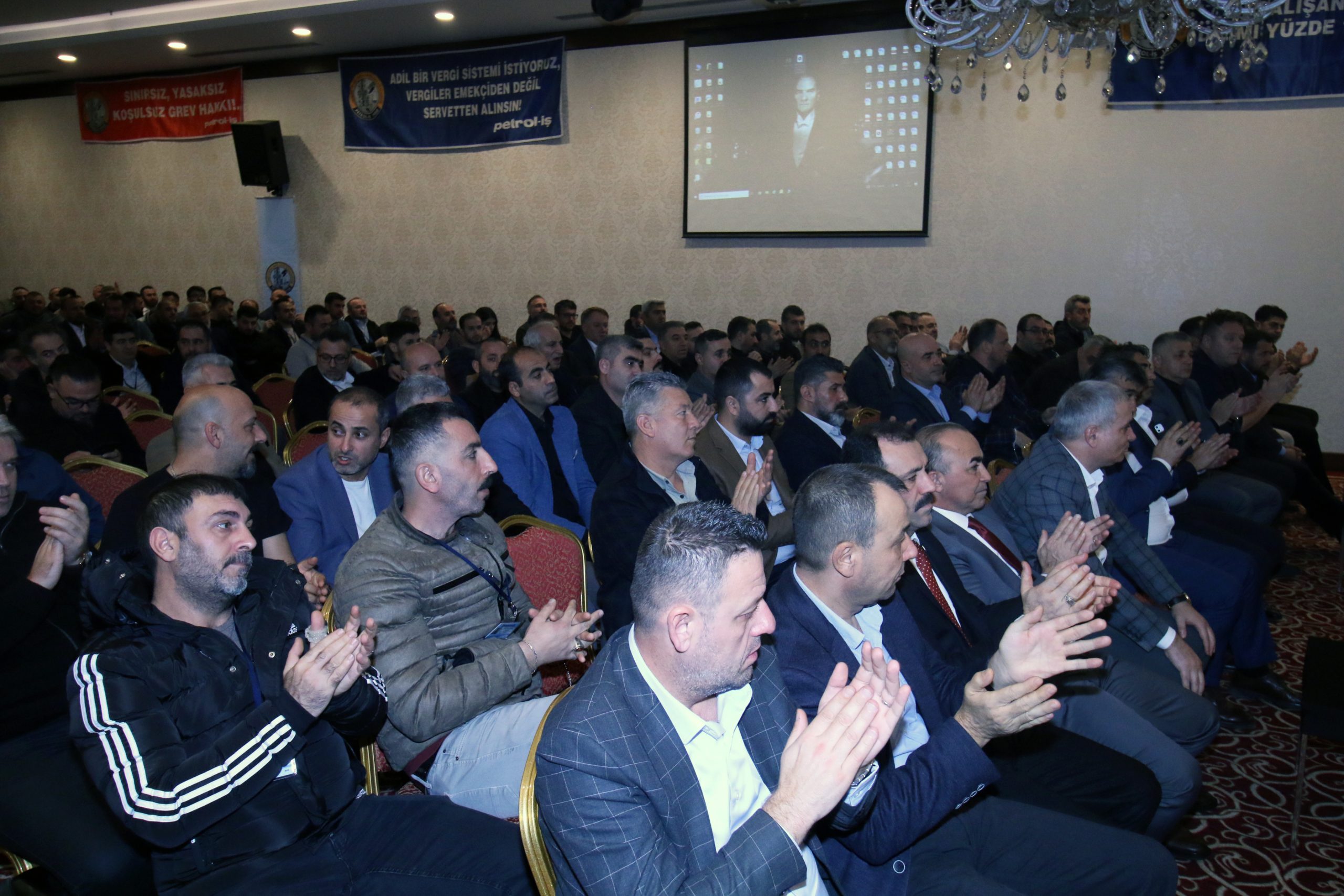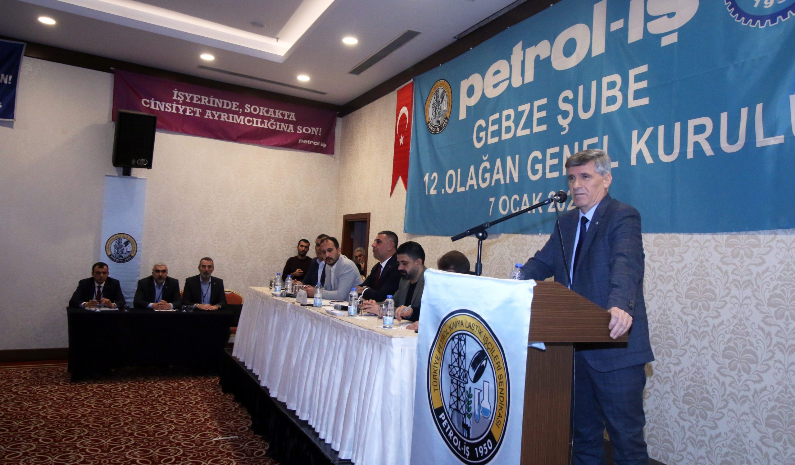 İstiklal Marşı’nın okunmasının ardından sendikamız Genel Başkanı Süleyman Akyüz konuşmasını yapmak üzere kürsüye davet edildi. Akyüz konuşmasına kongre katılımcılarını selamlayarak başladı. Konuşmasının başında Gebze Şubenin Petrol-İş tarihi içerisindeki önemine vurgu yapan Akyüz, 12 Eylül sonrası kurulan bir şube olan Gebze Şubenin 12 Genel Kurulun tamamına üye, temsilci, kurucu delege, şube başkanı ve sendika genel başkanı olarak katıldığını belirtti. Ülke olarak zor bir dönemden geçildiğine dikkat çeken Akyüz, “Topraklarımız, limanlarımız, fabrikalarımız satılıyor, özelleştirmeler yapıldı yapılmaya devam ediyor. Biz bu özelleştirmelere karşı mücadele verirken, bu kaynakların atıl, verimli kullanılmadığı söylendi. Bugün ise ülke ekonomisine değer katan en büyük firmalar bunlar. Biz kendi kaynaklarımızı yok ettik, bugün bunun bedelini ödüyoruz.” dedi.