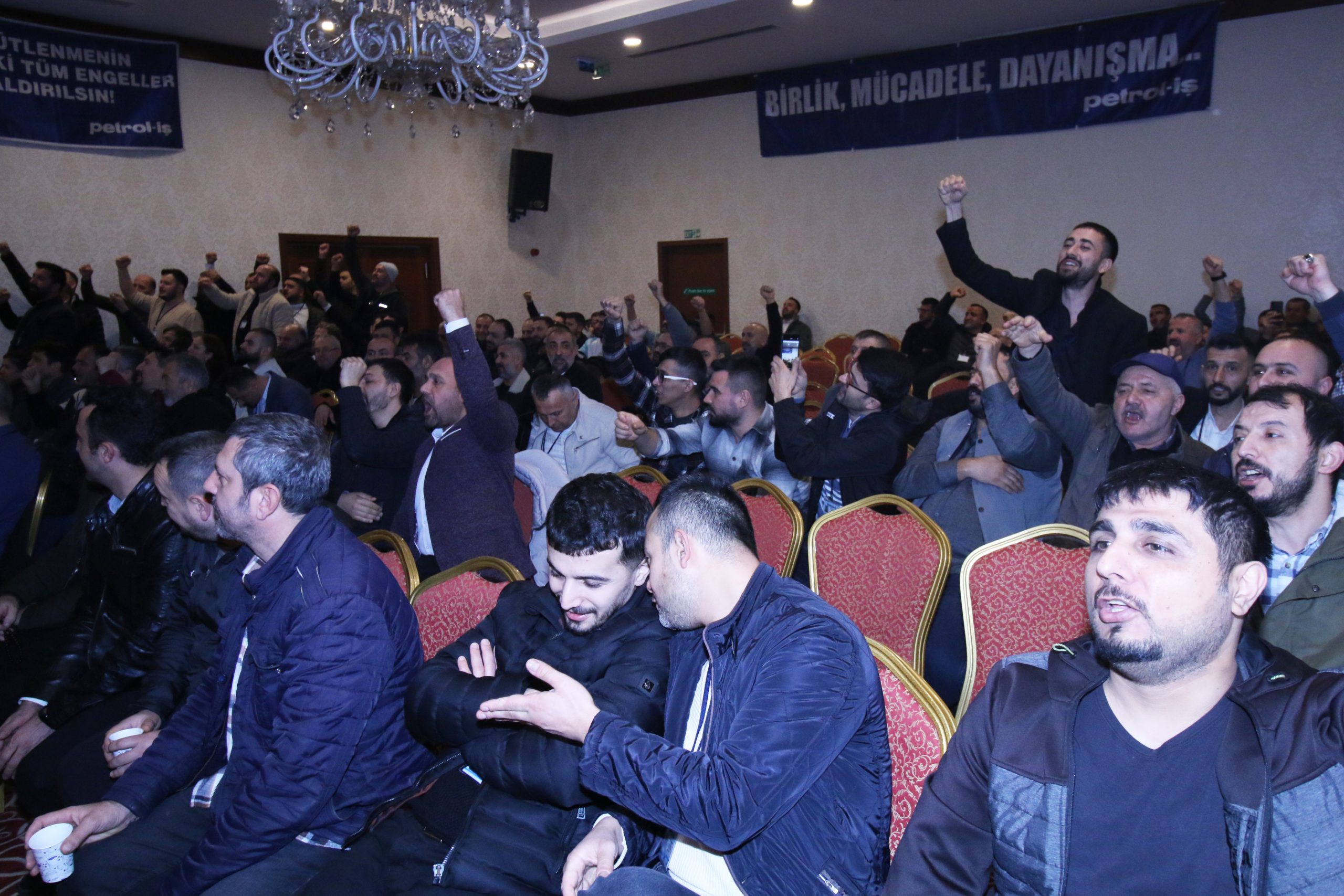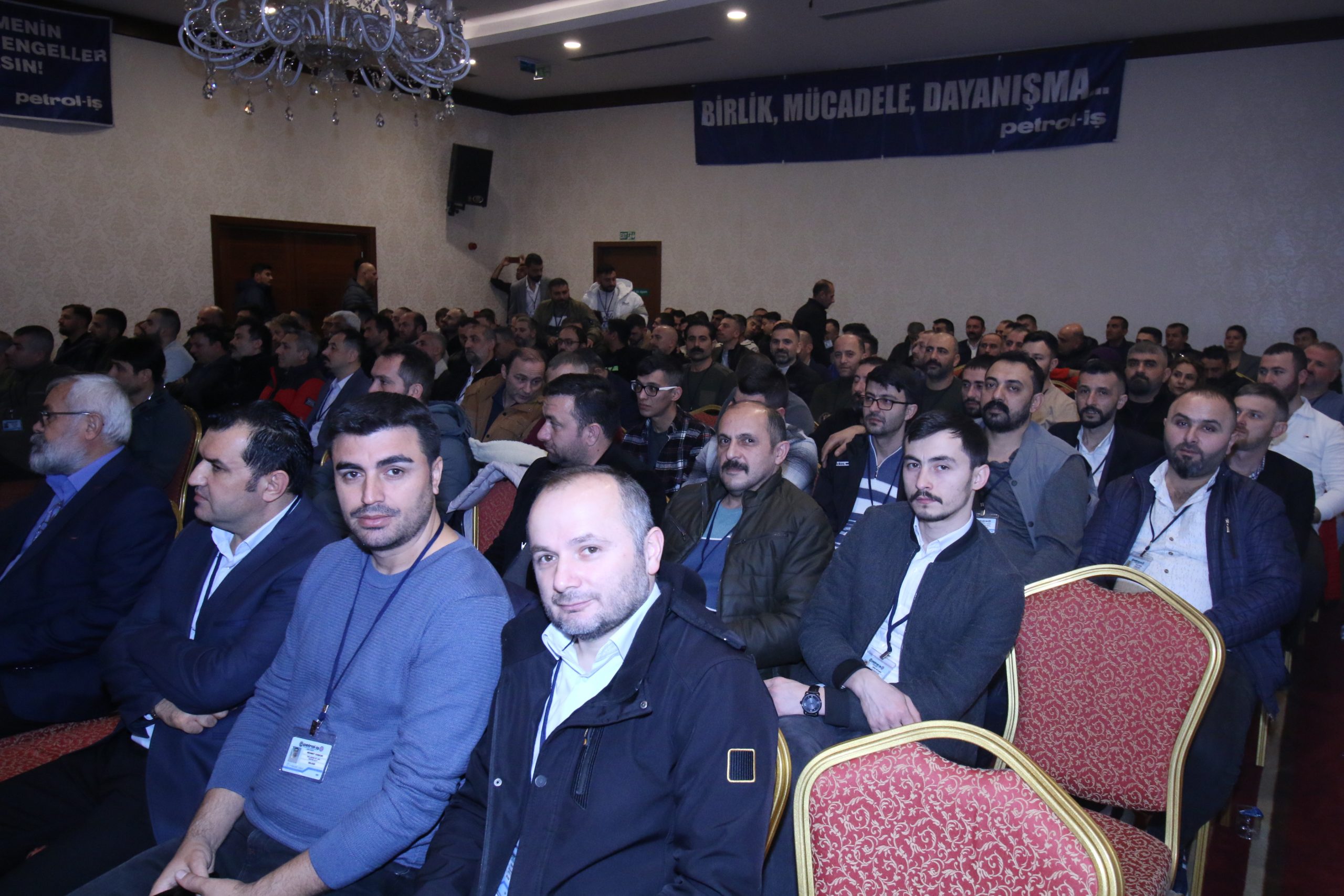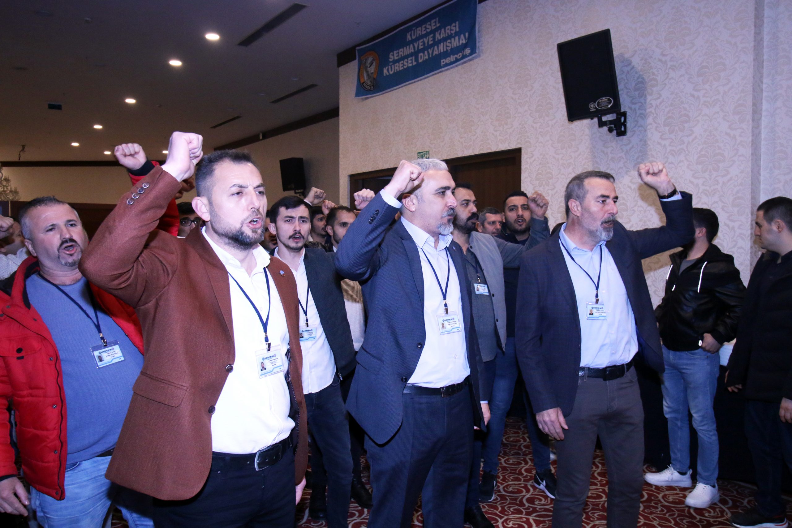 İstiklal Marşı’nın okunmasının ardından sendikamız Genel Başkanı Süleyman Akyüz konuşmasını yapmak üzere kürsüye davet edildi. Akyüz konuşmasına kongre katılımcılarını selamlayarak başladı. Konuşmasının başında Gebze Şubenin Petrol-İş tarihi içerisindeki önemine vurgu yapan Akyüz, 12 Eylül sonrası kurulan bir şube olan Gebze Şubenin 12 Genel Kurulun tamamına üye, temsilci, kurucu delege, şube başkanı ve sendika genel başkanı olarak katıldığını belirtti. Ülke olarak zor bir dönemden geçildiğine dikkat çeken Akyüz, “Topraklarımız, limanlarımız, fabrikalarımız satılıyor, özelleştirmeler yapıldı yapılmaya devam ediyor. Biz bu özelleştirmelere karşı mücadele verirken, bu kaynakların atıl, verimli kullanılmadığı söylendi. Bugün ise ülke ekonomisine değer katan en büyük firmalar bunlar. Biz kendi kaynaklarımızı yok ettik, bugün bunun bedelini ödüyoruz.” dedi.