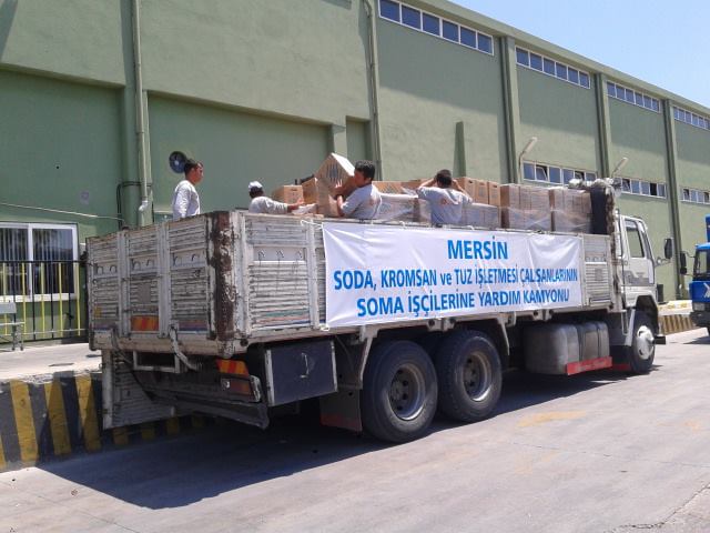 Merkez Akdeniz ilçesi Kazanlı Mahallesi’ndeki Soda Sanayi Fabrikası’nın bahçesinde işçilerin örgütlü bulunduğu Petrol-İş Sendikası Mersin Şubesi desteğiyle erzaklar kamyona yüklenerek Soma’ya doğru yola çıktı.