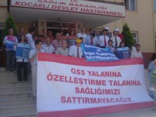 30.05.2006Sosyal Güvenlik Yasa Tasarısının geri çekilmesi için Kocaeli'nde eylem vardı. Kocaeli Devlet Hastanesi önünde toplanan Kocaeli Emek Platformu üyeleri ''sağlık hakkı satılamaz, mezarda emekliliğe hayır, sağlıkla ticaret ölüm demektir'' sloganları eşliğinde basın açıklaması yaptı. Kocaeli şube başkanı Ali Ufuk YAŞAR eyleme katılanlar arasındaydı.