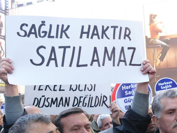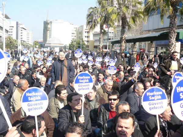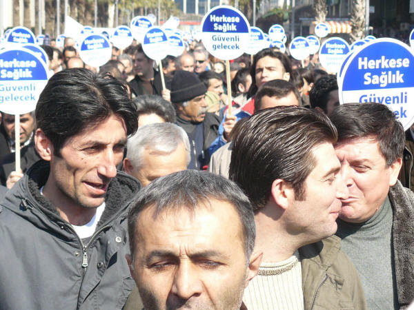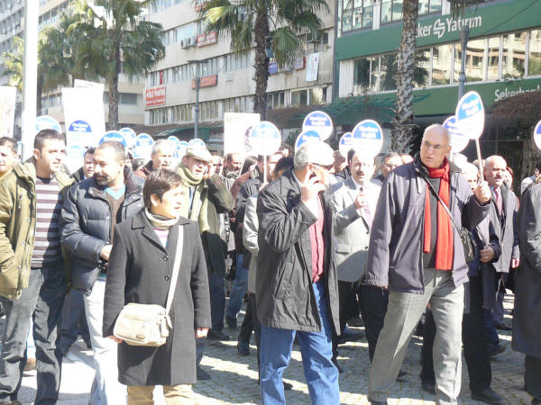 İzmir’de Eski Sümerbank önünde toplanan katılımcılar Konak Meydanı’na doğru bir süre yürüdükten sonra basın açıklaması okundu. Katılımcılar sık sık ‘Sağlıkta Ticaret Ölüm Demektir’, ‘Herkese Sağlık, Güvenli Gelecek’, ‘Hastaneler Halkındır Satılamaz’, ‘AKP Sağlığa Zararlıdır’, Herkese Parasız Sağlık, Parasız Eğitim’ sloganları atarak Hükümeti uyardılar. Petrol–İş Aliağa Şubesi olarak biz de Yönetici, Temsilci ve üye arkadaşlarımızla katılarak destek verdik.