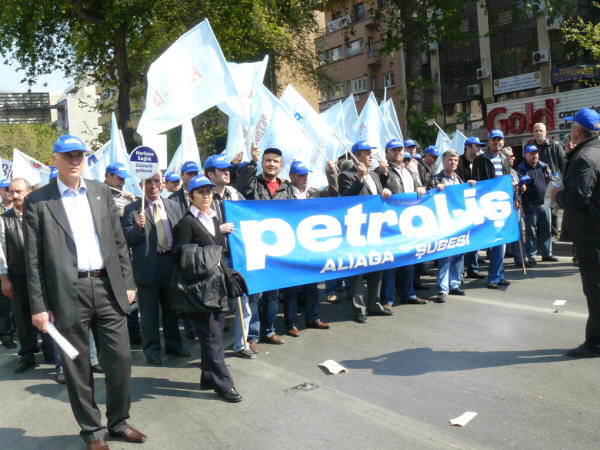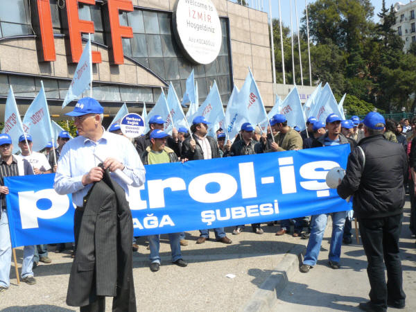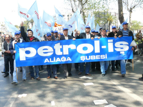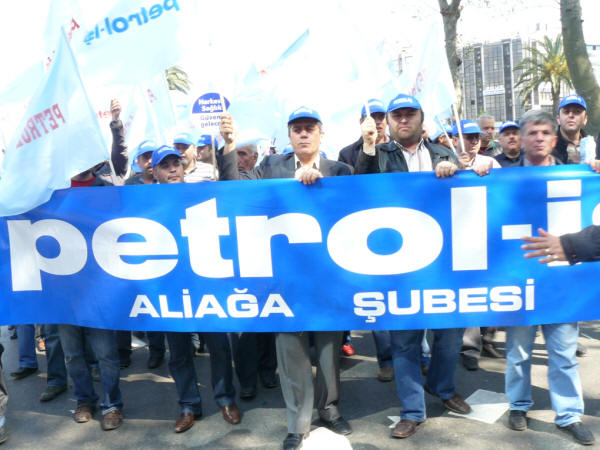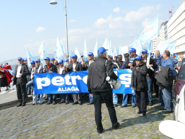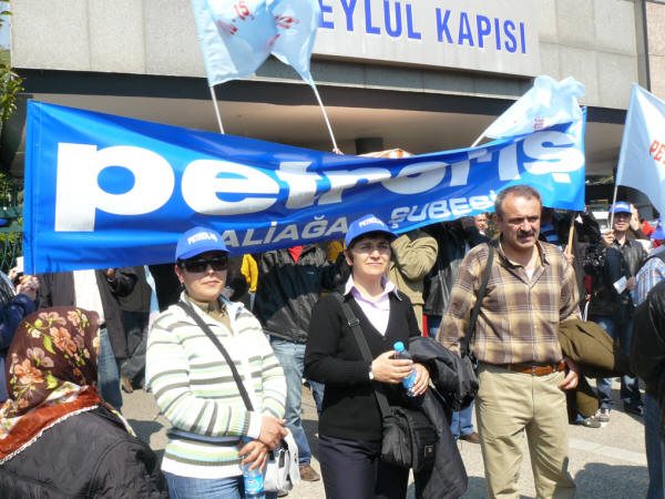 Petrol-İş Sendikası Aliağa Şubesi olarak biz de üyelerimizle birlikte eyleme destek verdik. İzmir’de Basmane Meydanı’nda toplanan emekçiler buradan sloganlar ve alkışlar eşliğinde yürüyerek Konak Meydan’ın da toplandı. Basın açıklamasına ‘Parasız sağlık, parasız eğitim’, ‘Bu yasa meclisten çıkmayacak’, ‘AKP yasanı al başına çal’, ‘Mezarda emekliliğe hayır’, gibi yasayı ve hükümeti protesto eden sloganlar atılarak eşlik edildi. Basın açıklamasından sonra topluluk dağıldı.