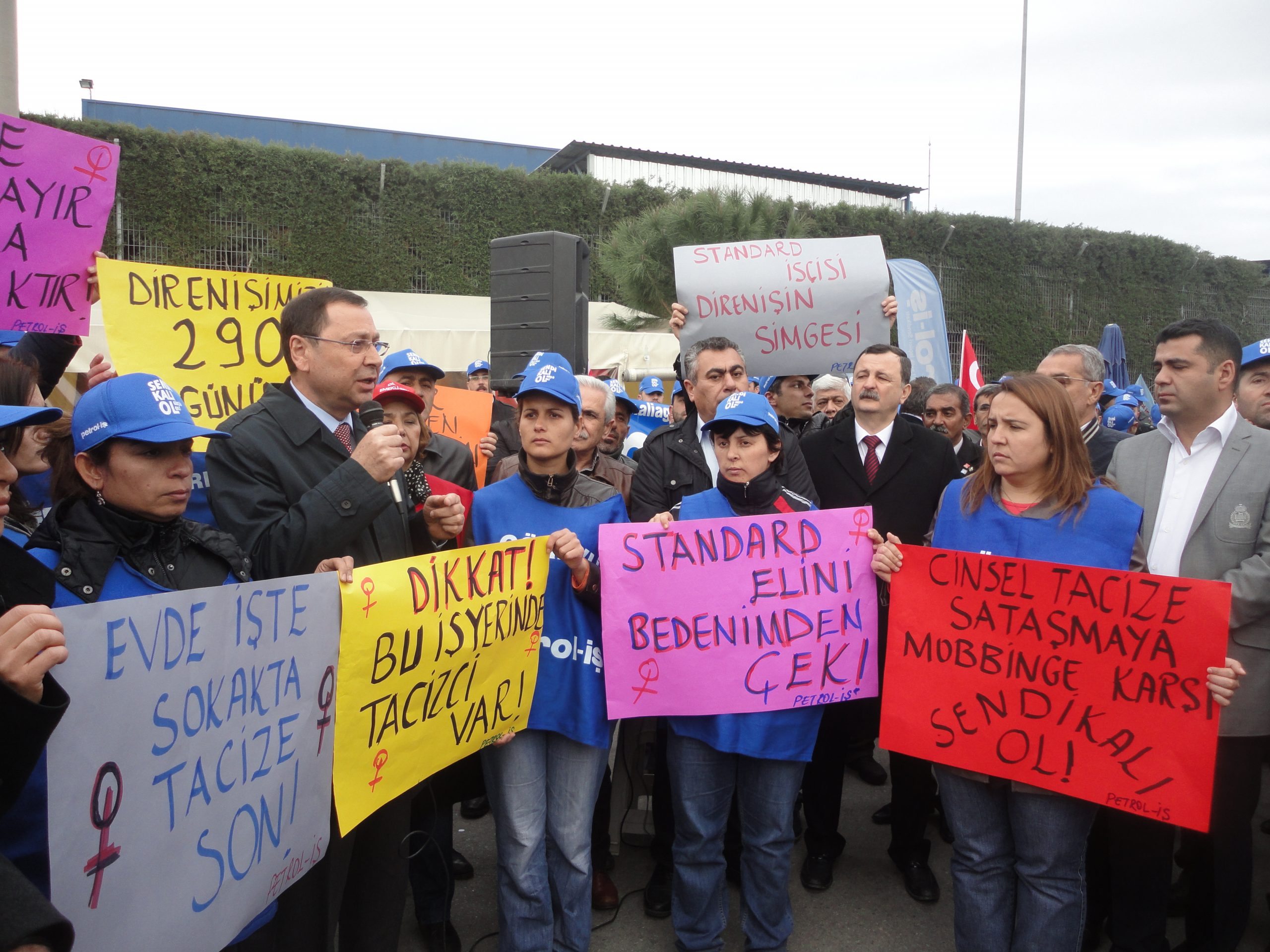 Cinsel taciz Anayasa ve yasalarla güvence altına alınan “kadının insan haklarına” yönelik ciddi bir saldırıdır. Bugün buraya, SP yönetiminin kadın üyelerimize karşı işledikleri cinsel taciz suçunun hesabını soracağımızı bildirmek için toplandık. Biz kadın üyemize, üyelerimize yönelik bu saldırıya sendikamıza yönelik bir saldırı olarak da değerlendiriyoruz. Çünkü sendikalı olduğu için kadınları işten çıkararak onların çalışma hakkını elinden alan işveren ve temsilcileri cinsel taciz ve sataşma yoluyla onların beden bütünlüğüne de saldırmıştır. Örgütlenme karşıtı tutum ve davranışlarından dolayı sendika düşmanı diye nitelendirdiğimiz SP’nin bu “vasfı” önüne bir de kadın düşmanlığı eklenmiştir. Cinsel sataşma ve tacize uğrayan kadın üyemiz de, biz de bu işin peşini bırakmayacağız. Konunun takipçisi olacağız ve başta Sebahattin Karabulut olmak üzere tüm sorumlular cezalandırılana kadar elimizden geleni yapacağız…