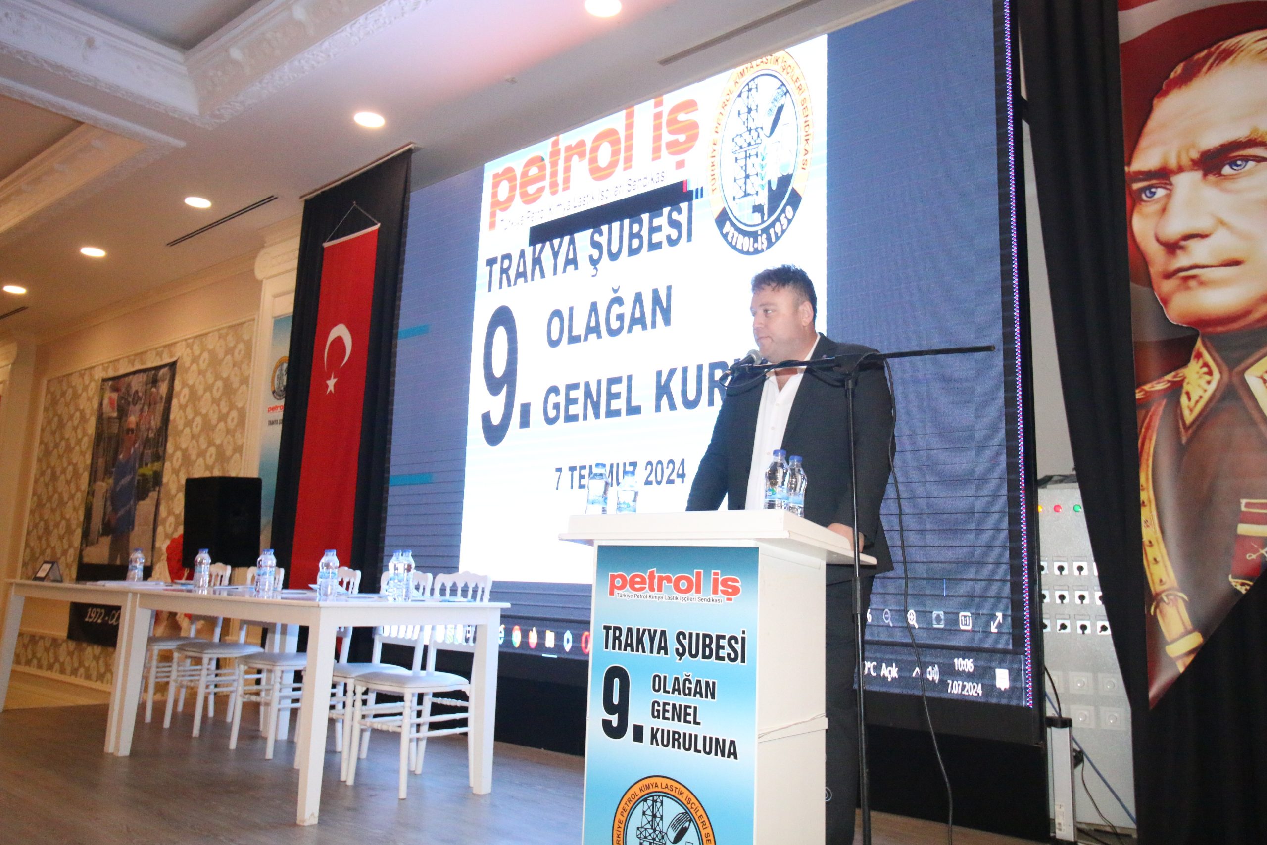 Sonrasında Şube Başkanlığı görevini yürüten ve yeniden aday olan Ümit Çetintaş konuşmasını gerçekleştirdi. Konuşmasına Sumitomo Grevini selamlayarak başlayan Çetintaş, İsrail’in Gazze’de gerçekleştirdiği katliamı kınadı, emperyalist savaşların sona ermesi gerektiği söyledi. Konuşmasının devamında Çetintaş, mevcut ekonomik düzende bir diğer savaşın işyerlerinde devam ettiğini, hayat şartlarının her geçen gün ağırlaştığını, ekonomiyi düzenlemenin yolu sermayeye değil, üretenlere, emeklilere yatırım yapmaktan geçtiğinin altını çizdi. Devamında ise TPAO’da yaşanan sorunlara değinen Çetintaş, “Kamu işçilerinin lojman, sosyal hakları, servis hakları elinden alınıyor. Mesaisi ödenmiyor. Devlet kamu işçisinin haklarına dokunmamalı, israfı önlemeli. Ne zaman kamuda tasarruf konuşulsa ardından özelleştirme konuşuluyor. Petrol-İş her zaman özelleştirmeye karşı durmuş, kamusal varlıkların özel şirket mantığında değil kamunun elinde entegre ve daha güçlü olması gerektiğini savunmuştur” dedi. Ümit Çetintaş konuşmasını Genel Kurulun Petrol-İş Trakya Şubesine, Petro-İş Sendikasına ve Türkiye işçi sınıfına hayırlı olması dileğiyle sonlandırdı.