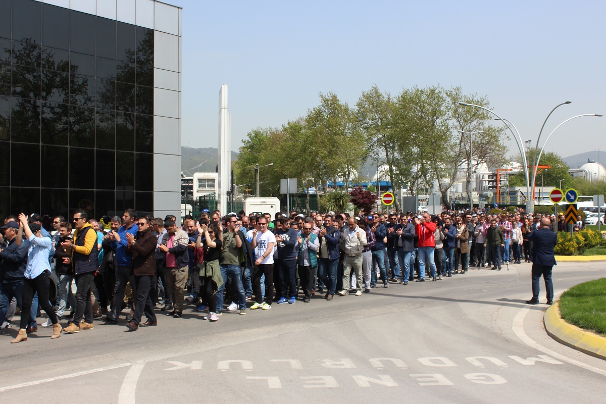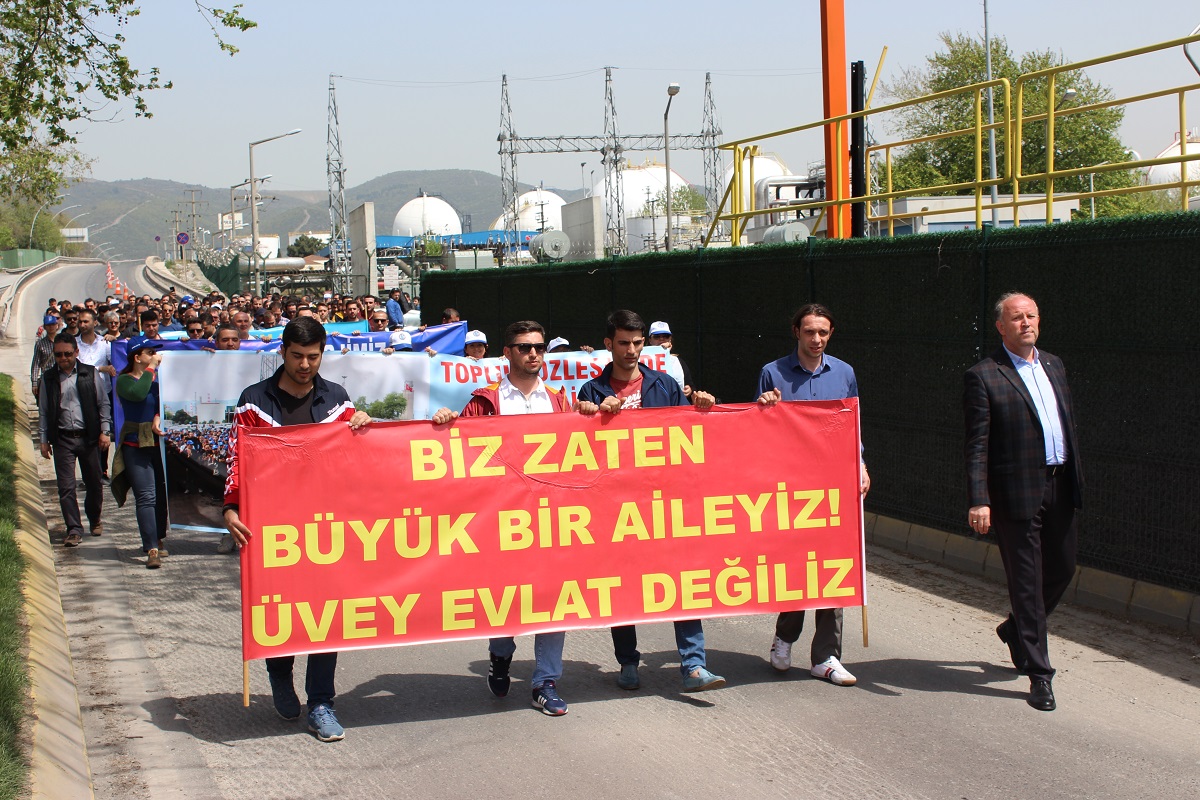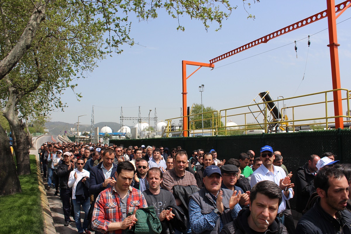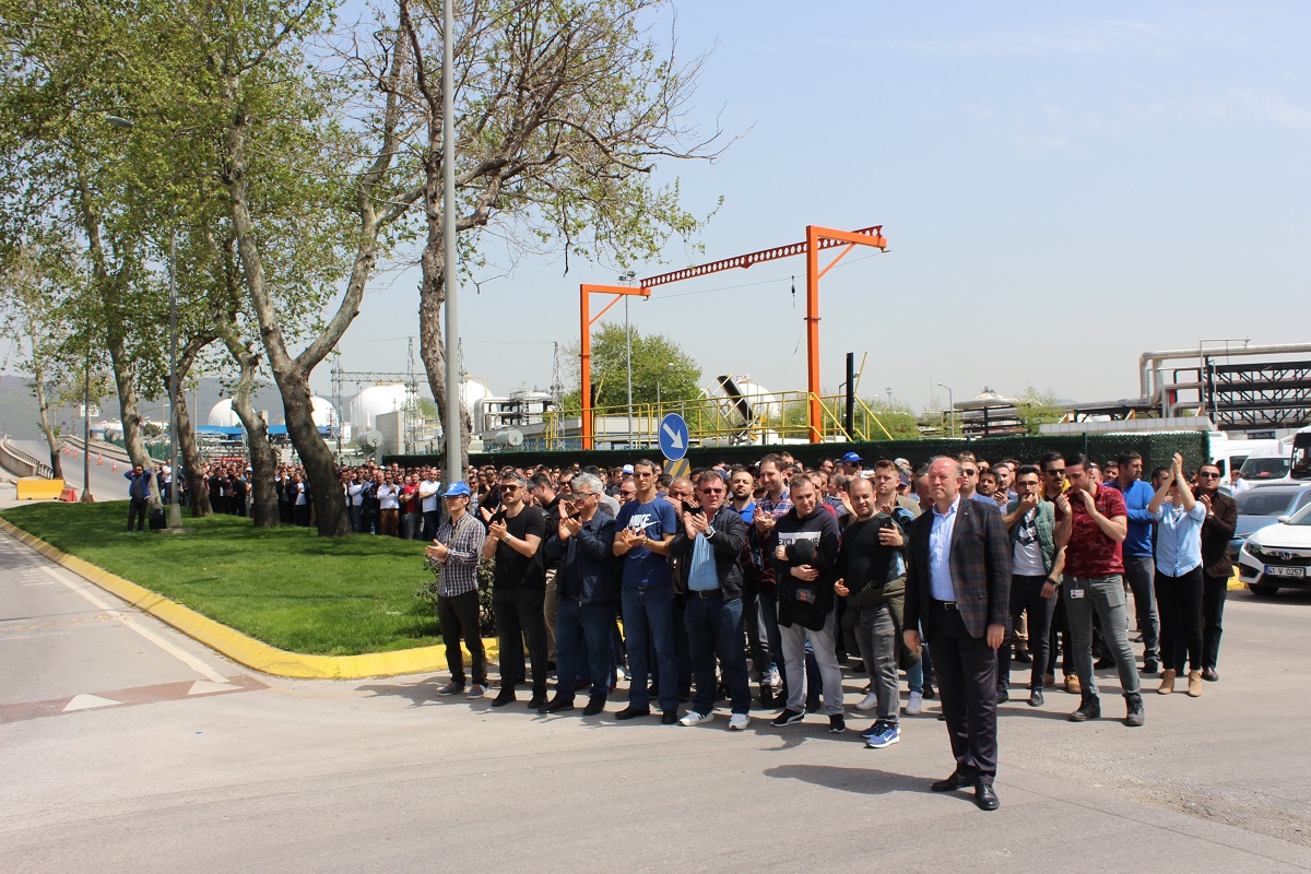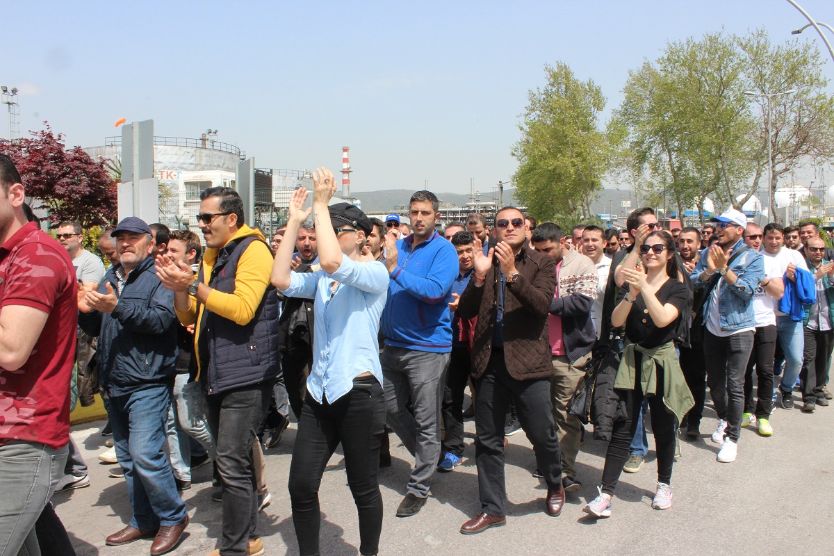 Fabrika önünde toplanan Tüpraşlı üyelerimize Kocaeli Şube Başkanımız Salih Akduman TİS ile ilgili açıklama yaptıktan sonra yüzlerce Tüpraş çalışanı kortej halinde alkış ve sloganlar eşliğinde A kapıya kadar yürüyerek saat 12:00’da işbaşı yaptılar.