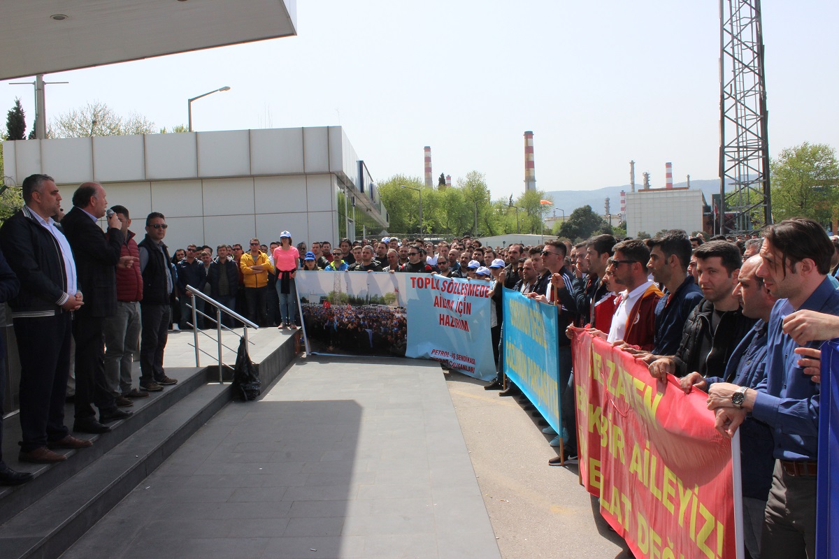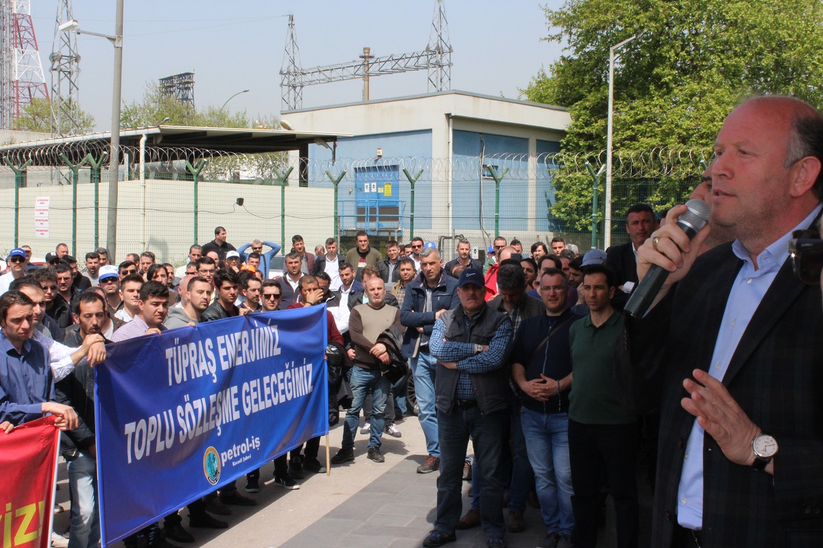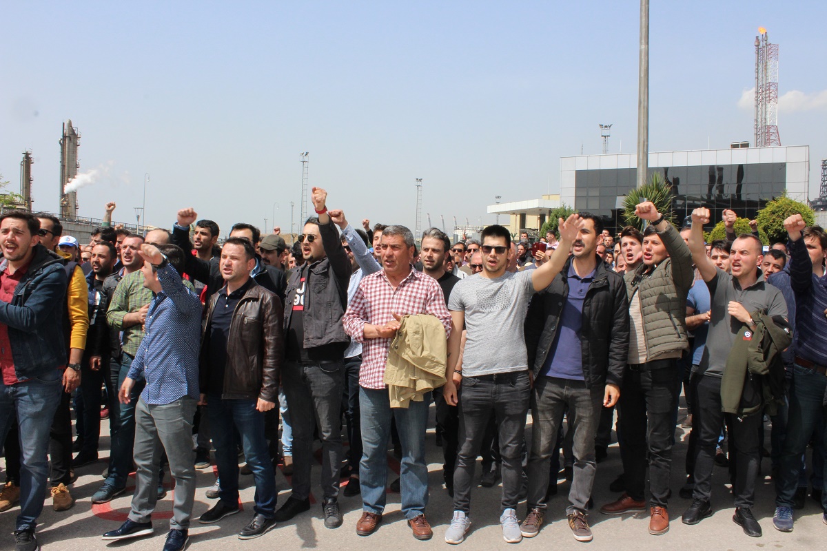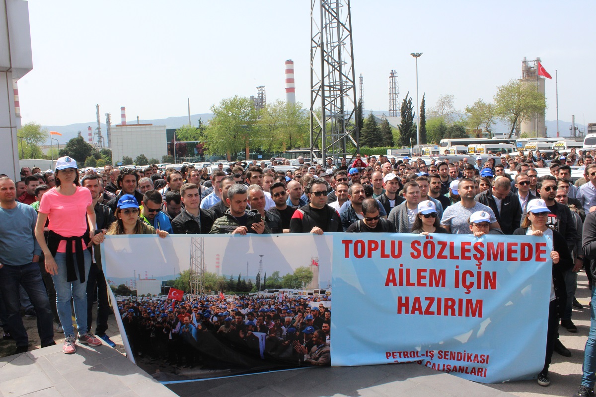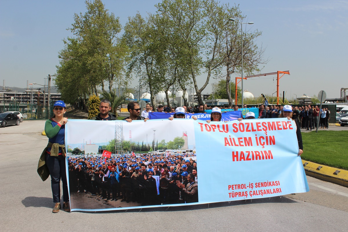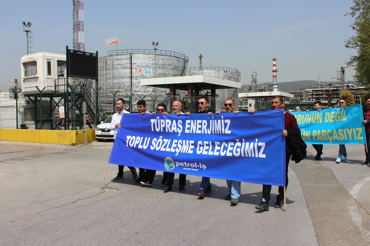 Petrol-iş Sendikası olarak Tüpraş’ta üyelerimiz eylemlere devam ediyor.Toplu İş Sözleşme görüşmelerinde işveren temsilcileri ile yapılan toplantılarda herhangi bir netice alınamaması nedeniyle dün (24 Nisan 2019) yapılan tam gün iş bırakma eyleminden sonra bugün de İzmit, Aliağa, Kırıkkale ve Batman Rafinerilerinde çalışan üyelerimiz eş zamanlı yarım gün iş bırakma eylemi yaptılar.