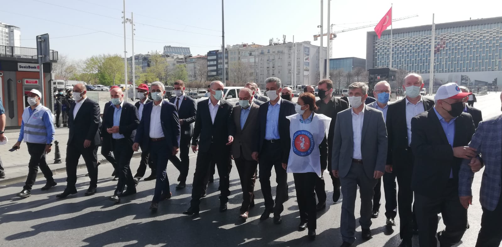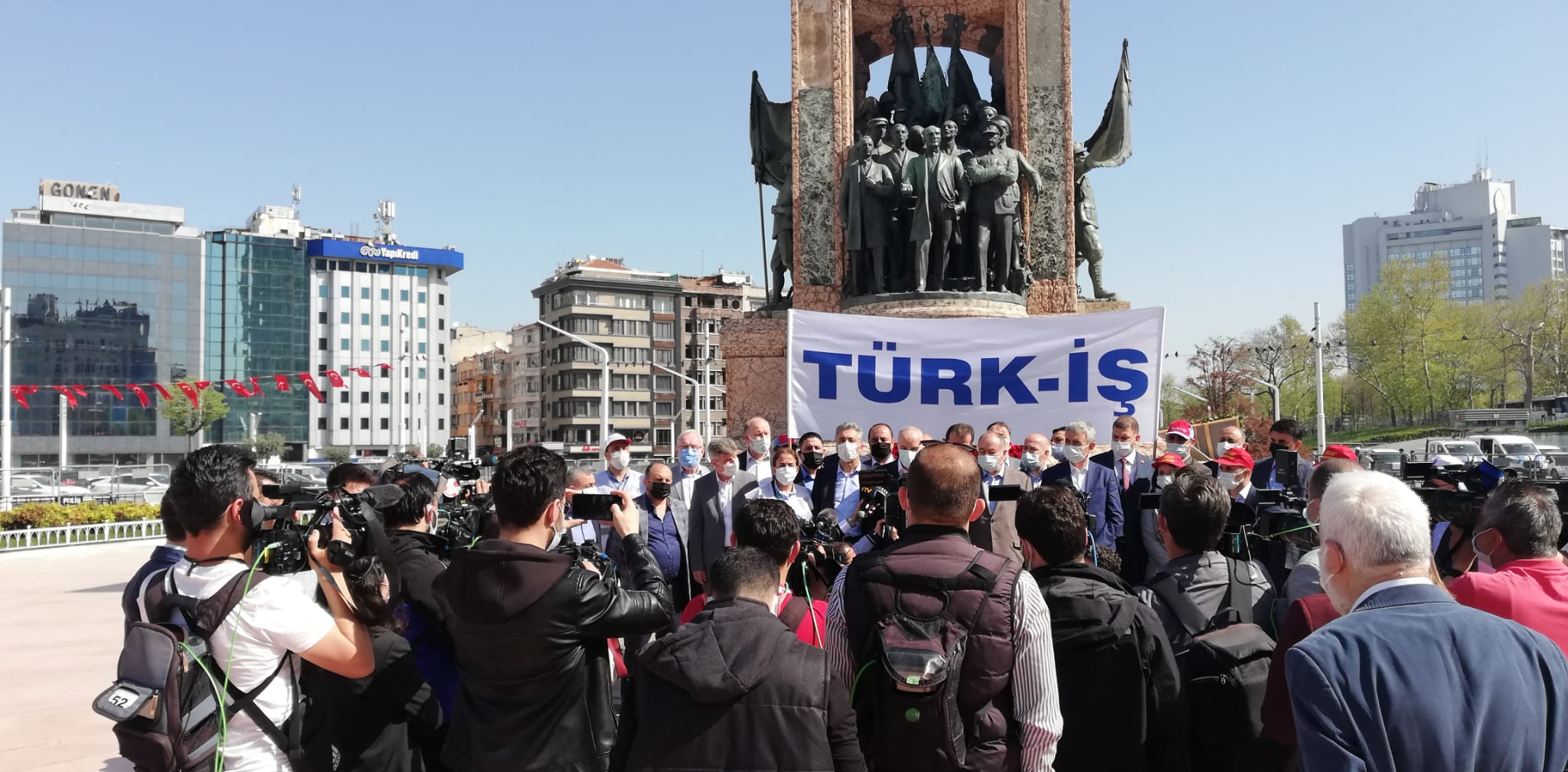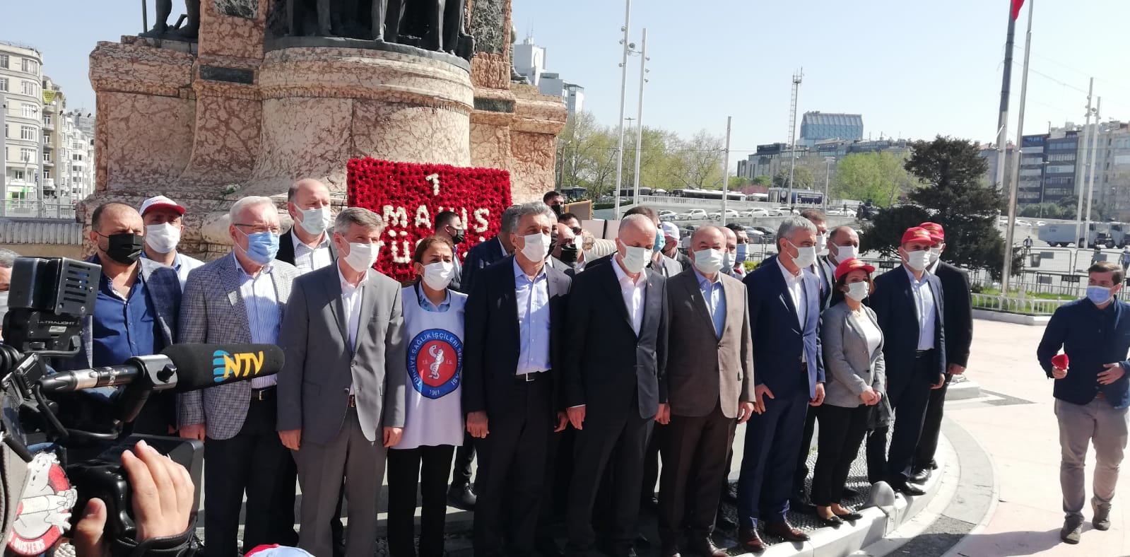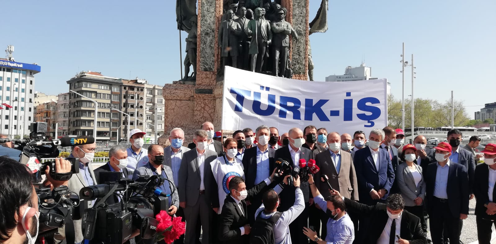 Türk-İş Heyeti 1 Mayıs Emek ve Dayanışma Günü nedeniyle önce Taksim’deki Cumhuriyet Anıtı’na çelenk bıraktı. Törene koronavirüs ile mücadele kapsamında alınan sokağa çıkma kısıtlaması kararı nedeniyle az sayıda kişinin katıldığı görüldü. Törende konuşan Türk-İş Genel Başkanı Ergün ATALAY, koronavirüs salgını nedeniyle yoğun mesai harcayan sağlık çalışanlarına teşekkür etti. Bu yıl da geçtiğimiz yıl olduğu gibi pandemi nedeniyle sosyal medya alanlarından taleplerini dile getirdiklerini belirten ATALAY, “Çalışanlarla ilgili şu anda, işinden olan işçiler var. Düzgün, namuslu işverenler olduğu gibi art niyetli olanları da var. Örgütlü toplum olsun istemiyor, işçiyi işten çıkarıyor, izne çıkarıyor, bunu ranta çeviriyor. 1980 yılı, ülke nüfusu 44 milyon, 2,5 milyon sendikalı işçi var. Nüfusun iki mislini geçtik, sendikalı işçi sayısında iki katına ulaşamadık.” dedi.
