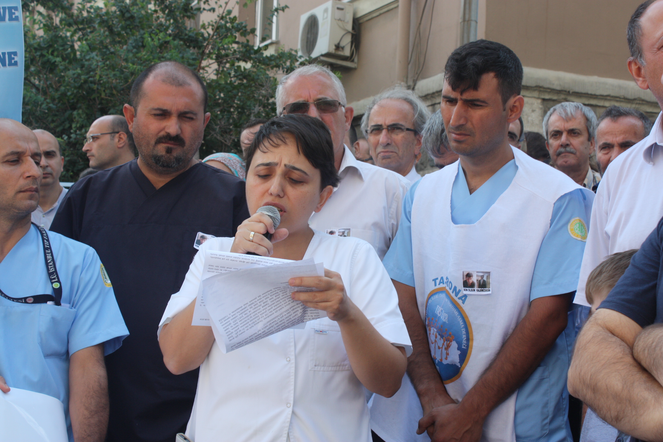 Basın açıklamasını okuyan Taş-İş-Der Başkan Yardımcısı Güneş Cengiz, 14 Ağustos Perşembe günü hasta yakınları tarafından darp edilen ve kaşına dört dikiş atılan Ramazan Kule’ye geçmiş olsun derken, hastane personellerinin yaşadığı bu tür sıkıntıların nedeninin personel ve doktor yetersizliği olduğunu söyledi.