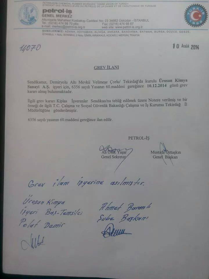 Petrol-İş Sendikası İstanbul 1 No’lu şubesine bağlı Ürosan Kimya Sanayi A.Ş’de 10 Aralık Çarşamba günü alınan grev kararı doğrultusunda grev ilanı asıldı.
