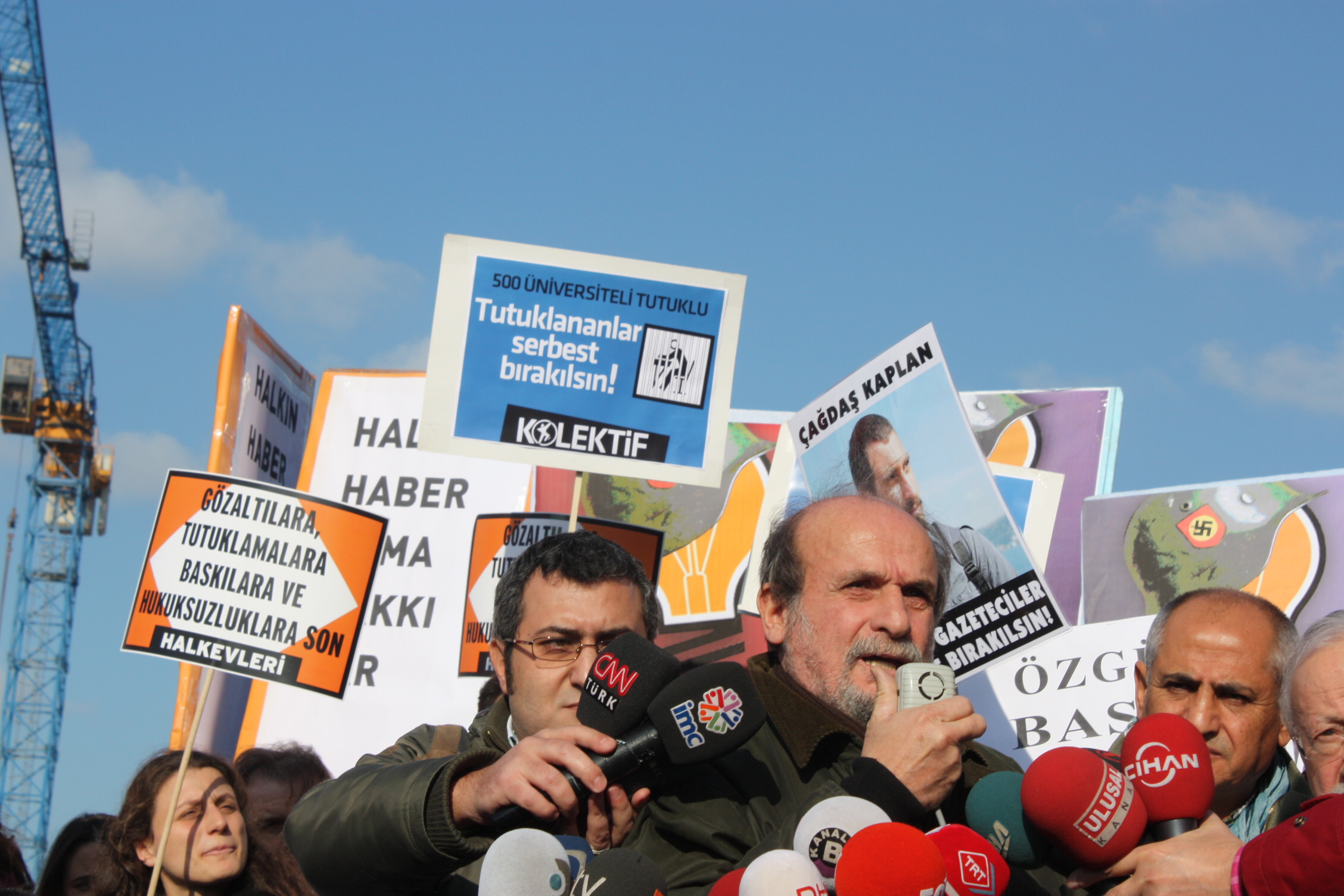 Gazetecilere Özgürlük Platformu dönem sözcüsü Turgay Olcayto da yaptığı konuşmada, “Adalet için, özgürlük için buradayız. Düşünce ve ifade özgürlüğü istiyoruz. Ülkenin her tarafı cezaevine dönüştü. Demokrasimiz utanç içinde. Umarız Türkiye bu ayıplardan kısa sürede kurtulur” dedi.