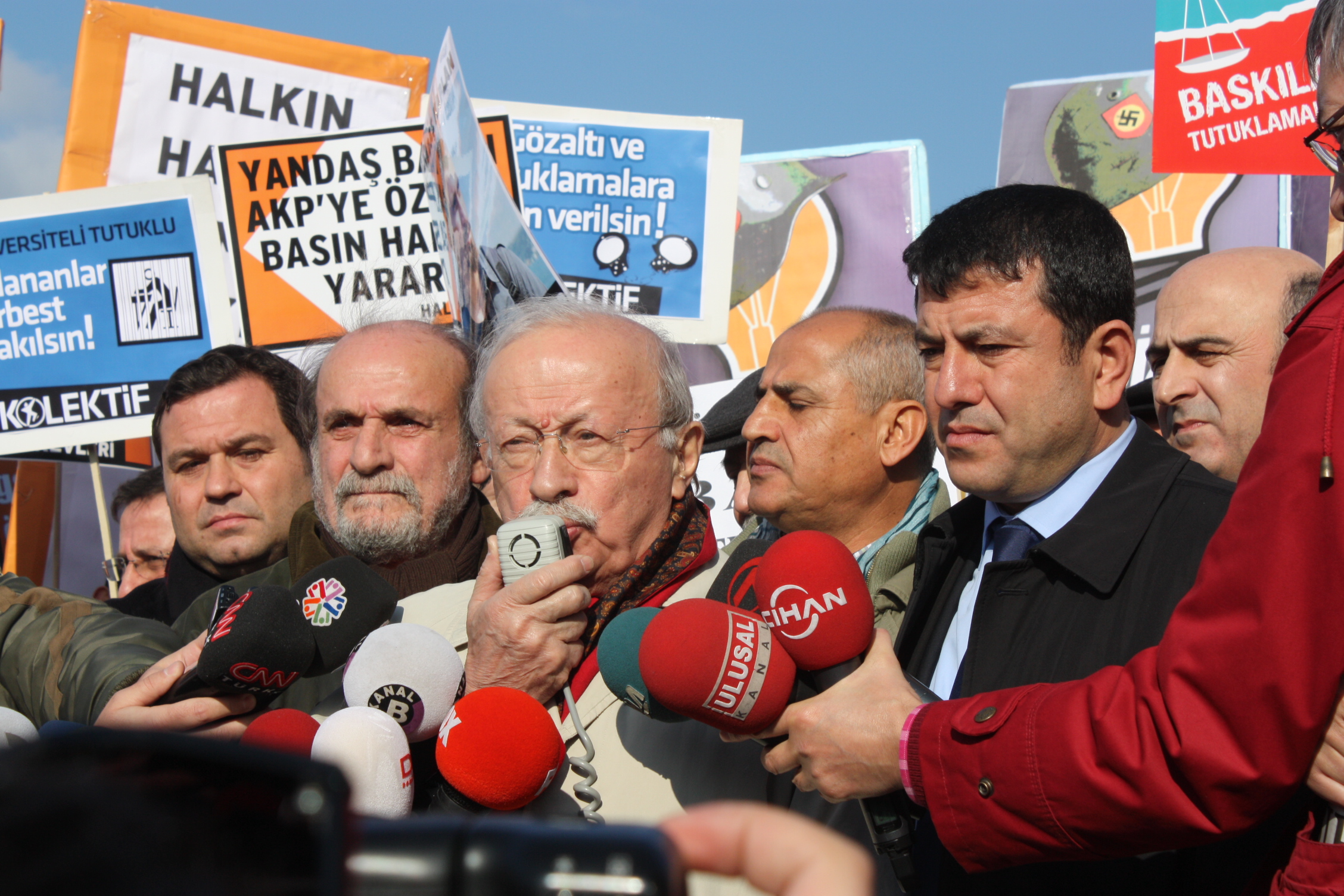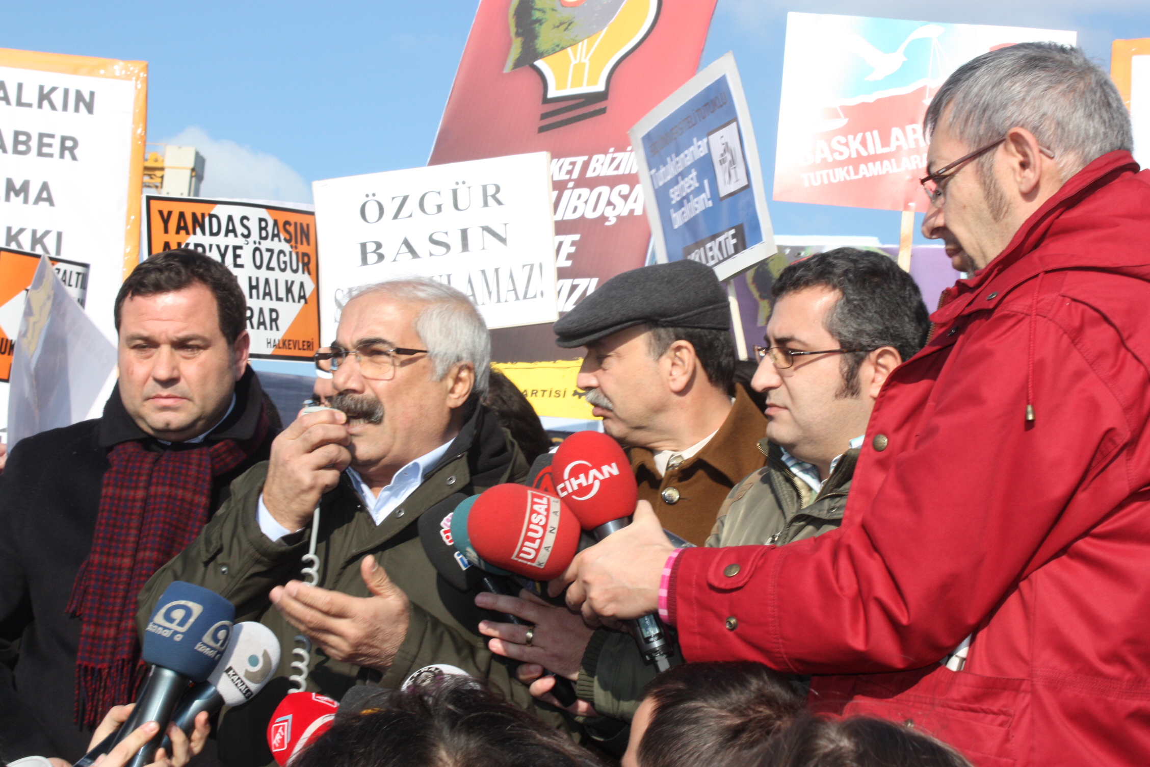 İçeride dava sürerken saat 12.30’da da Çağlayan Adliyesi önünde kitlesel basın açıklaması yapıldı. Çağlayan Adliyesi’nin önünü dolduran kitle ellerinde, “Tutuklananlar serbest bırakılsın,”, “Basın özgürlüğü, ifade özgürlüğü istiyoruz,” “Özel Yetkili Mahkemeler Kaldırılsın”, “Kitaptan, yumurtadan bomba olmaz Başbakan”, “Halkın haber alma özgürlüğü var”, “AKP faşizmine geçit yok” şeklinde dövizler taşıyarak tutuklamaları protesto etti.