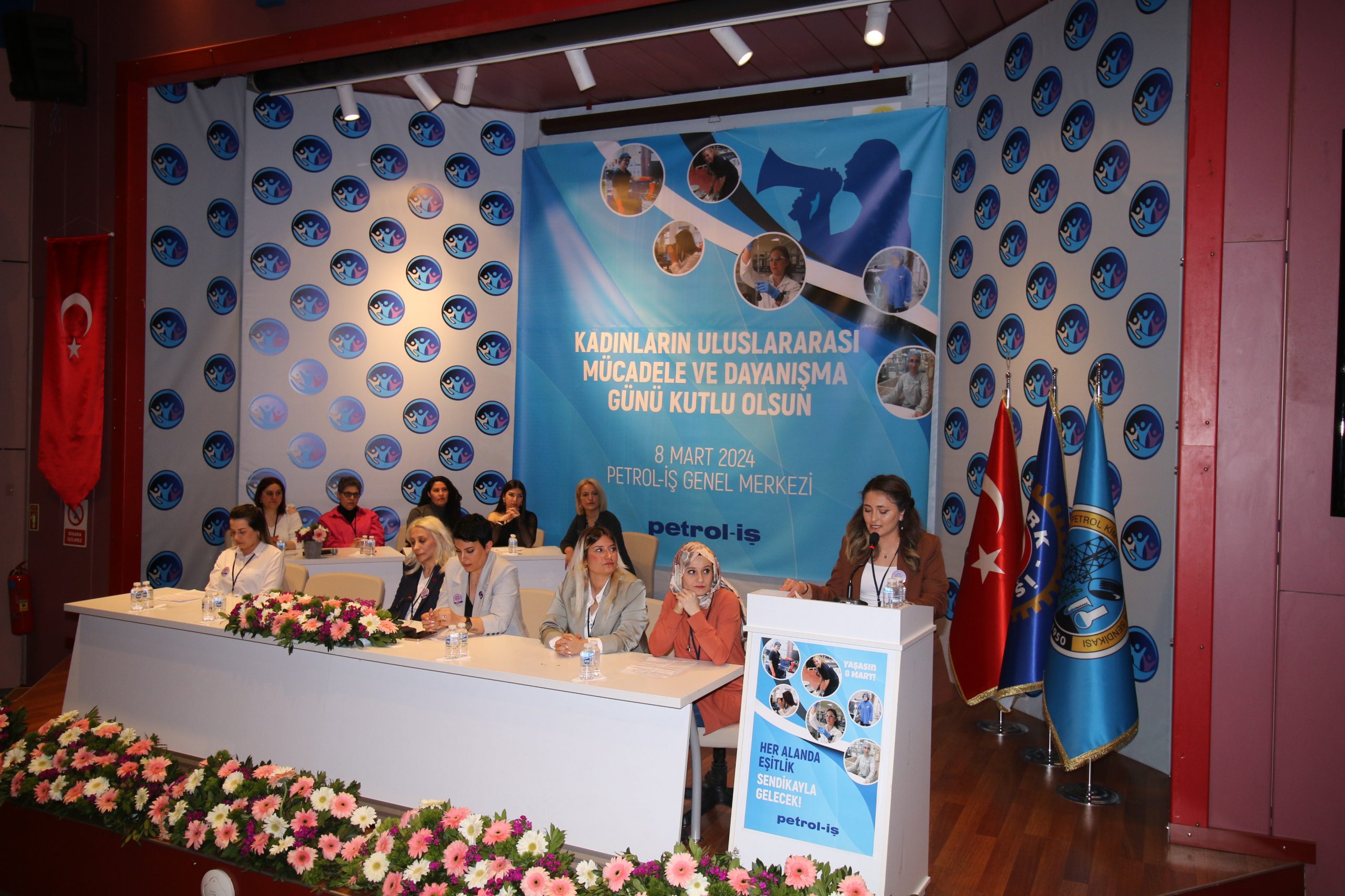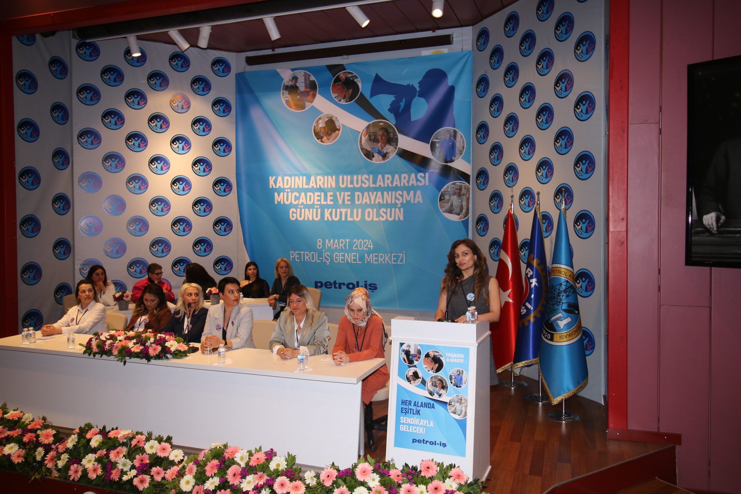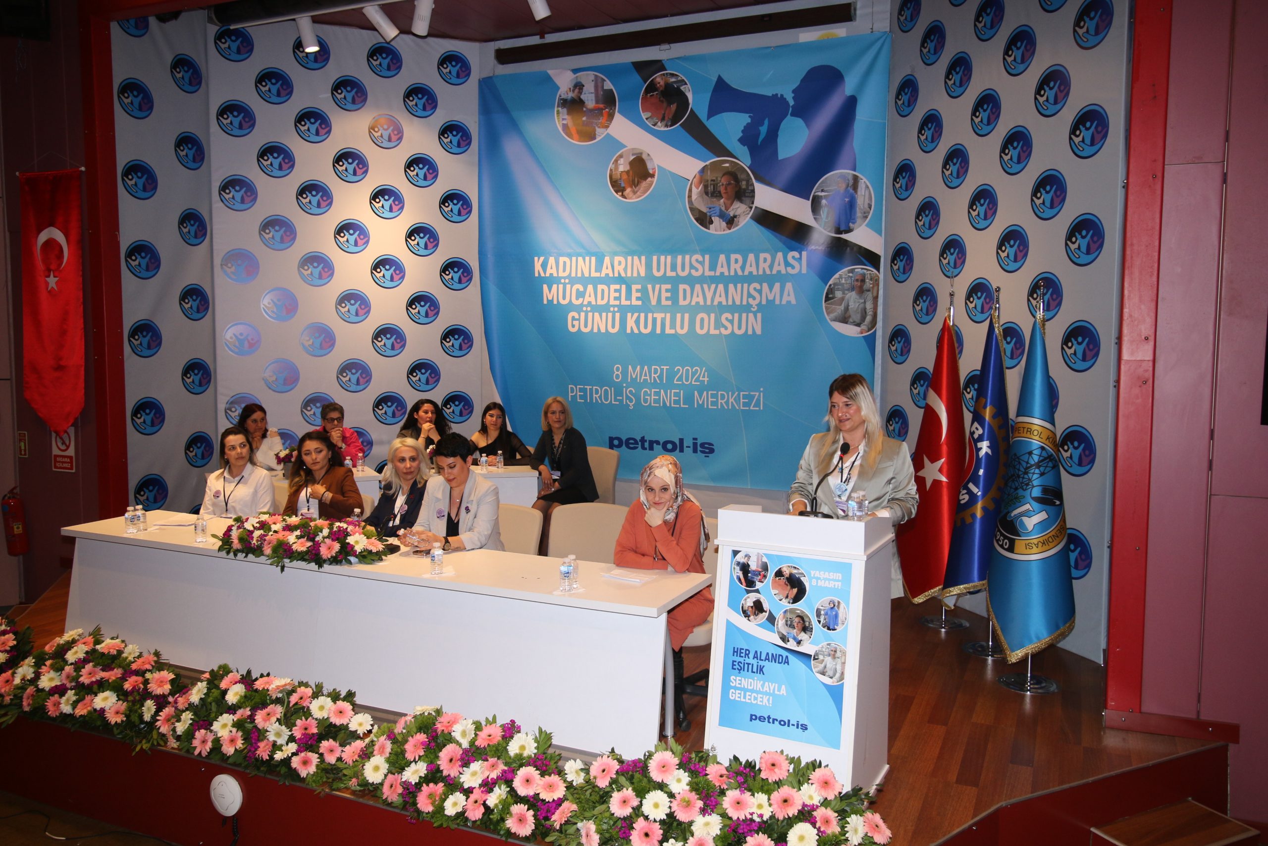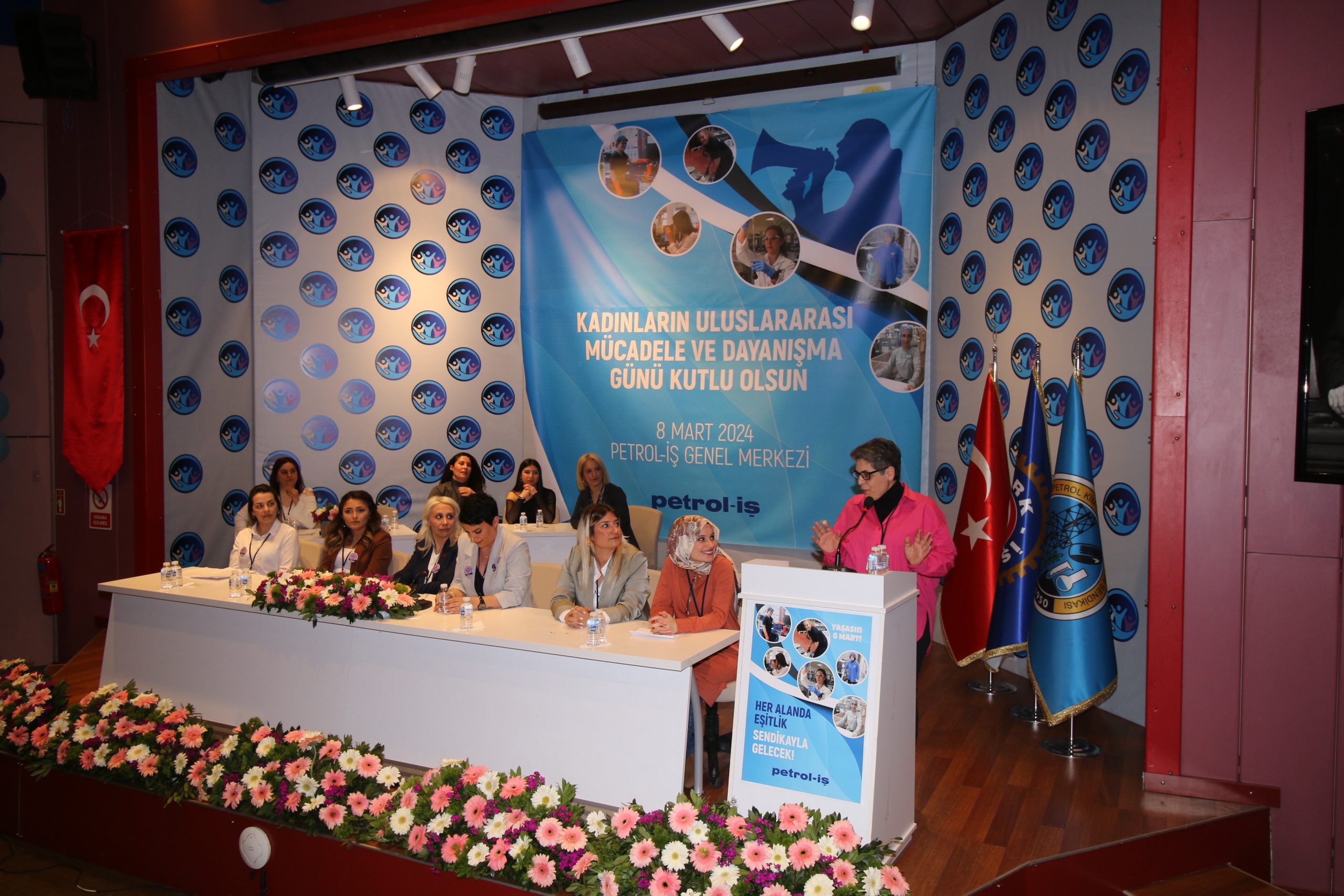 Konuşmasının devamında, “Bir sendika, kadın üyelerini sadece 8 Mart’tan 8 Mart’a hatırlıyorsa, onu koruyacak, güçlendirecek toplu sözleşme hükümleri; eşitliği sağlamak ve şiddeti önlemek için tüzük maddeleri, toplumsal cinsiyet eşitliğine yönelik politikaları yoksa; kadın üye oranının azlığını bahane ederek buna yönelik eğitimler, etkinlikler yapmıyorsa 8 Mart’ta söylenen güzel sözlerin, kutlamaların içi boş kalır. Petrol-İş Merkez Yönetimi olarak bugüne dek bunları yerine getirdik, pek çok alanda ilklere imza attık. Bundan sonra daha da geliştirerek bu çabamızı sürdüreceğiz. Sendikalı bir işyerinde çalışmanın, Petrol-İş üyesi olmanın kadın işçiler için ne anlama geldiği, bugün konuşulan konular arasında olacak.” dedi.