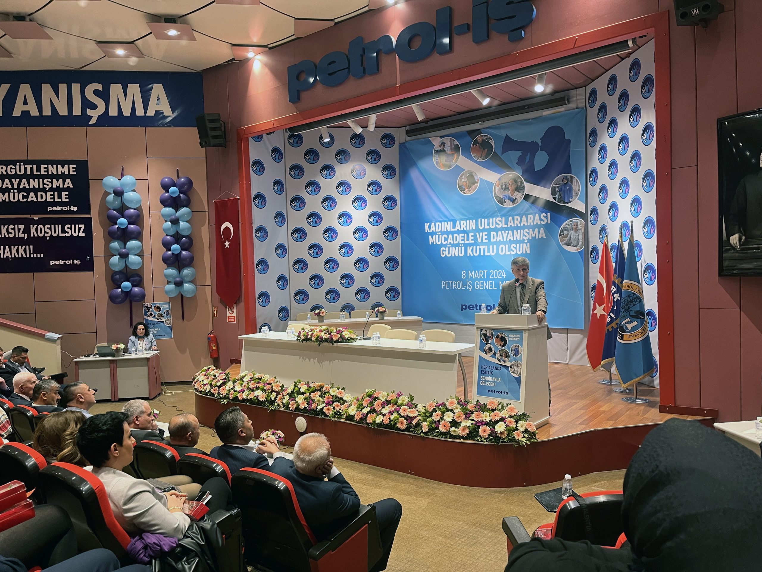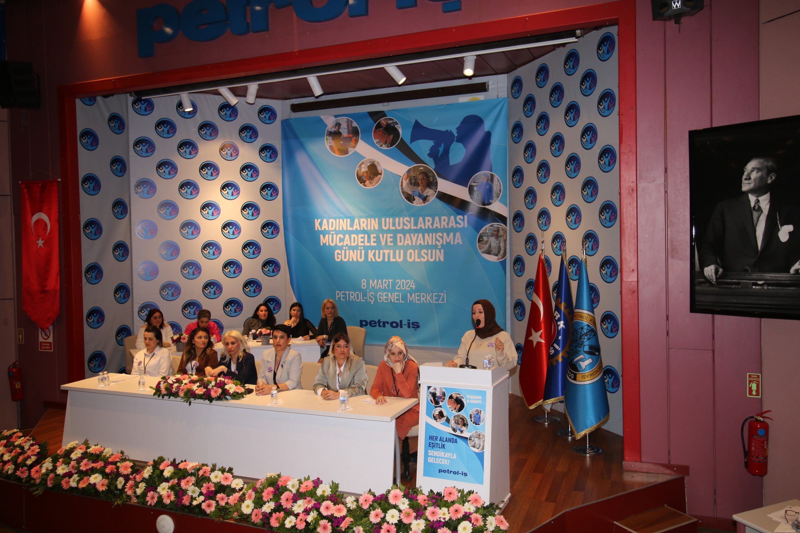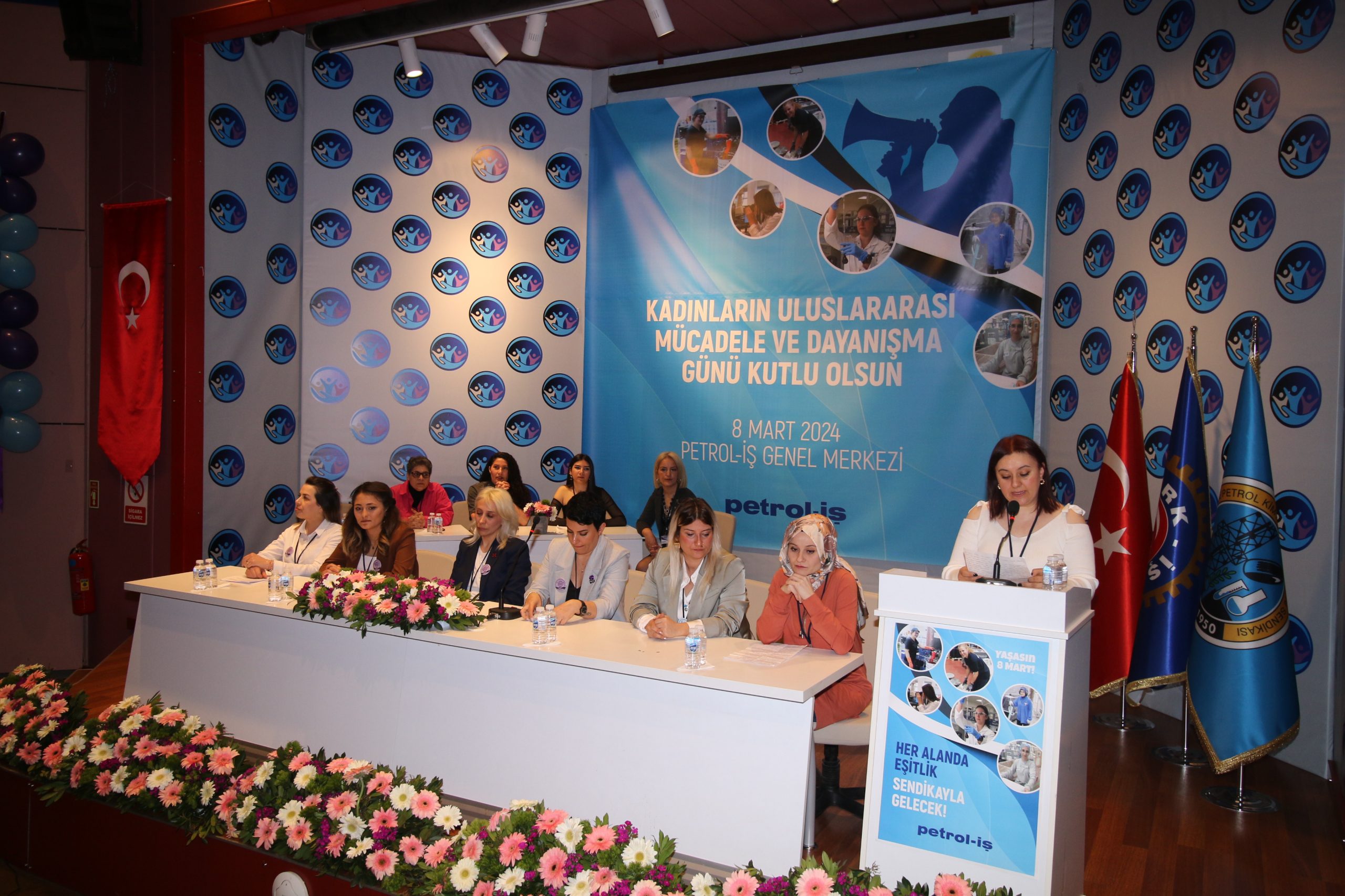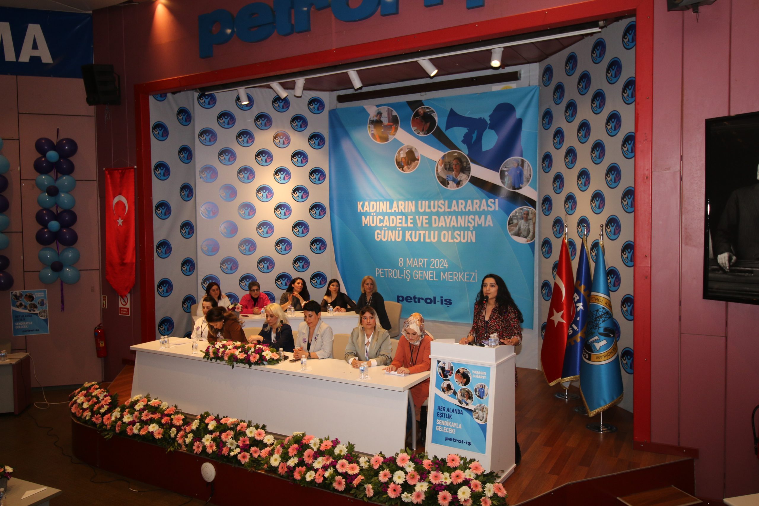Konuşmasının devamında, “Bir sendika, kadın üyelerini sadece 8 Mart’tan 8 Mart’a hatırlıyorsa, onu koruyacak, güçlendirecek toplu sözleşme hükümleri; eşitliği sağlamak ve şiddeti önlemek için tüzük maddeleri, toplumsal cinsiyet eşitliğine yönelik politikaları yoksa; kadın üye oranının azlığını bahane ederek buna yönelik eğitimler, etkinlikler yapmıyorsa 8 Mart’ta söylenen güzel sözlerin, kutlamaların içi boş kalır. Petrol-İş Merkez Yönetimi olarak bugüne dek bunları yerine getirdik, pek çok alanda ilklere imza attık. Bundan sonra daha da geliştirerek bu çabamızı sürdüreceğiz. Sendikalı bir işyerinde çalışmanın, Petrol-İş üyesi olmanın kadın işçiler için ne anlama geldiği, bugün konuşulan konular arasında olacak.” dedi.