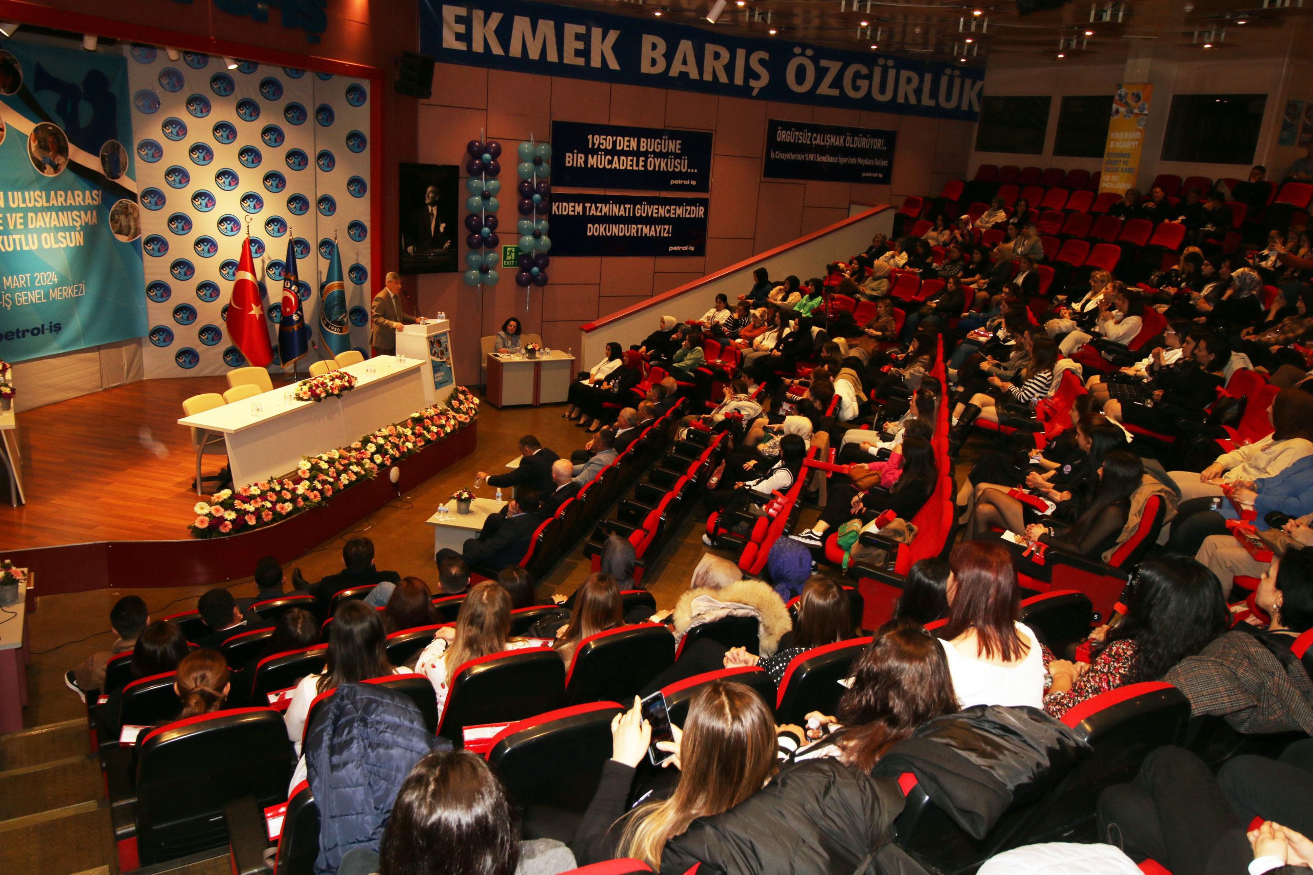 Genel Başkan Süleyman Akyüz’ün konuşmasının ardından 8 Mart’ın düzeltilmiş tarihçesinin anlatıldığı slayt gösterisi yapıldı ve sonrasında Petrol-İş’in örgütlü olduğu işyerlerinden kadınların konuştuğu, dertleştiği, taleplerini ve sendikalı olmaktan duydukları memnuniyeti paylaştıkları “Kadınız, Petrol-İş’liyiz, Söyleyecek Sözümüz Var!” bölümüne geçildi.